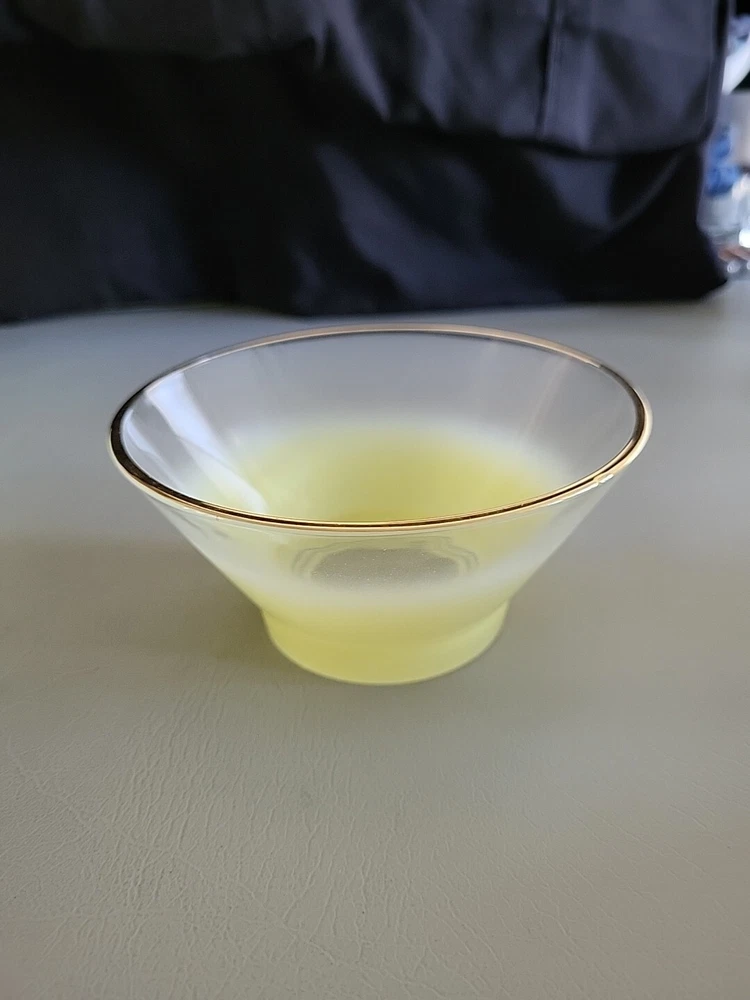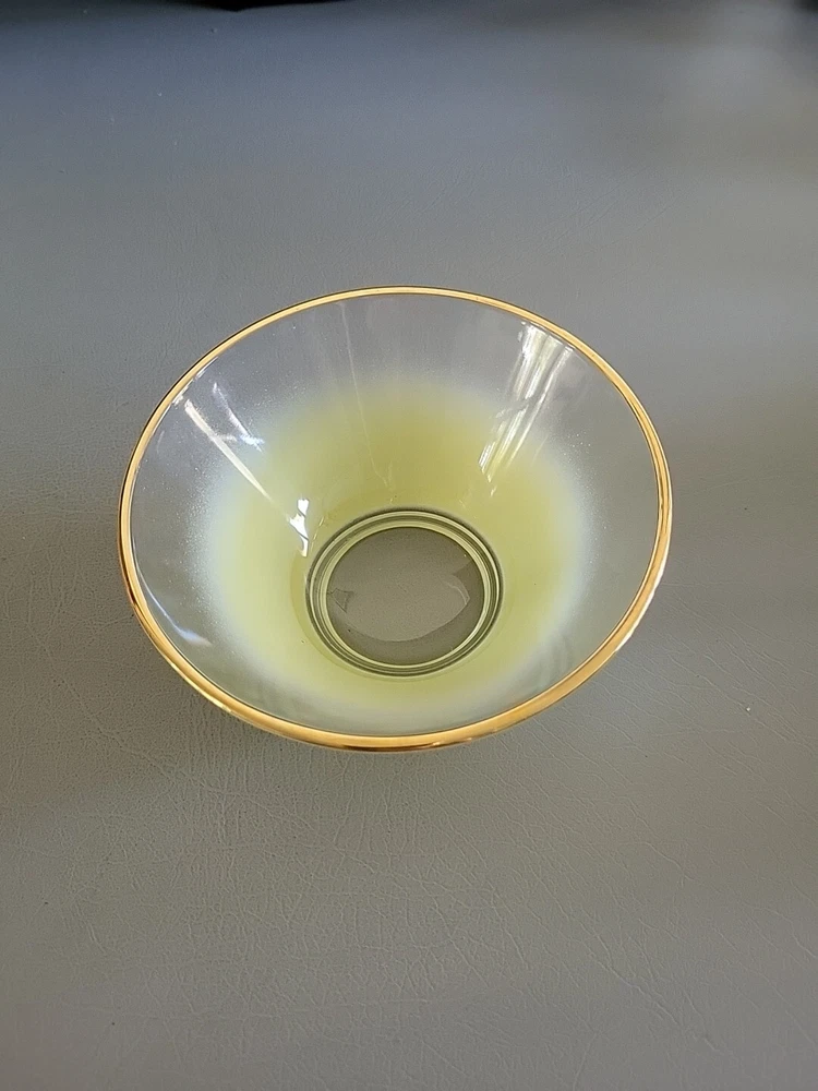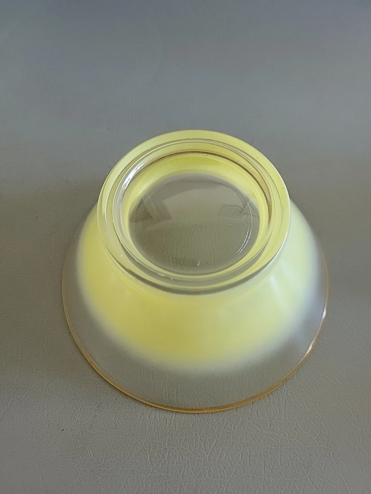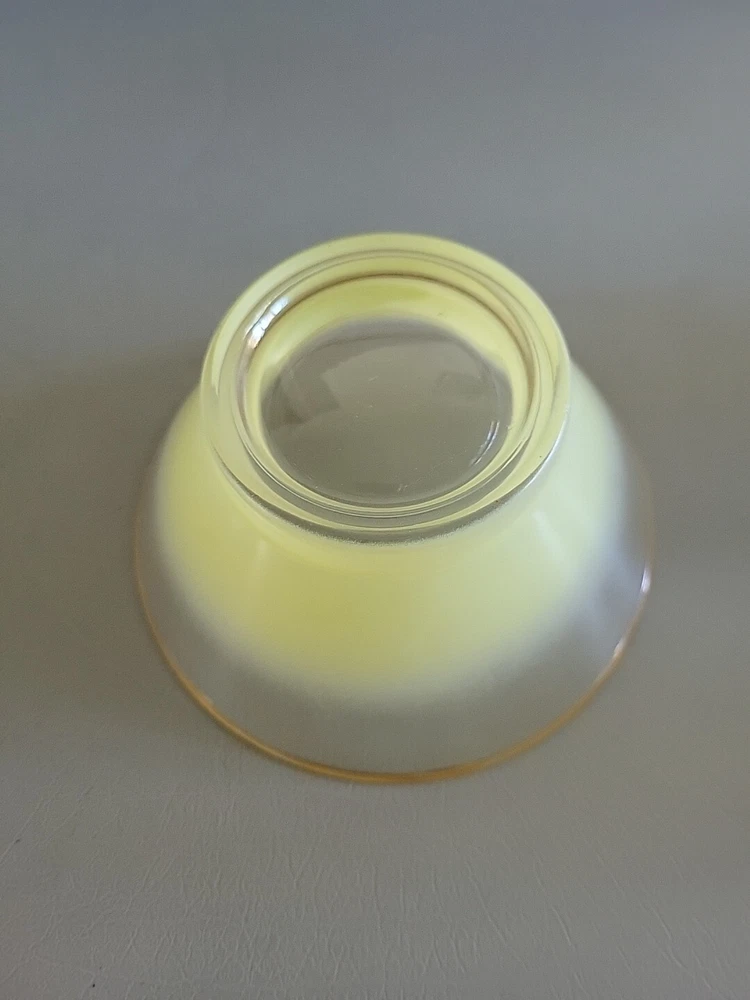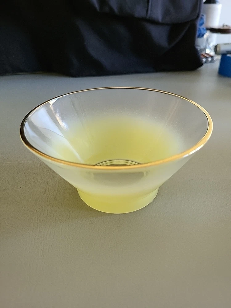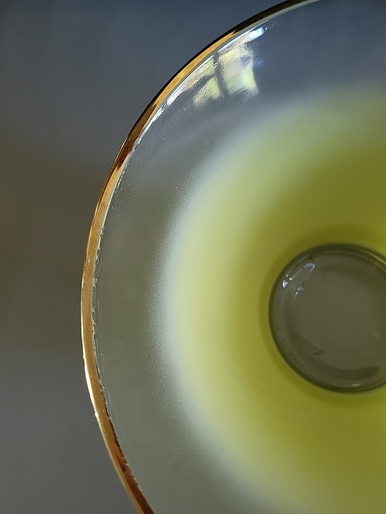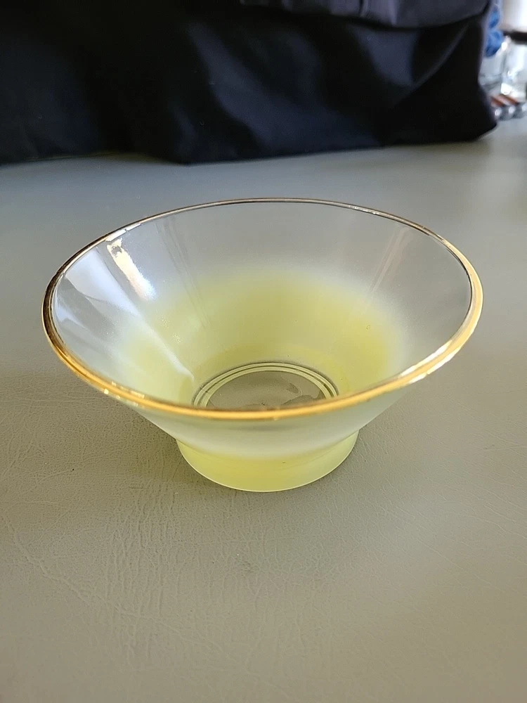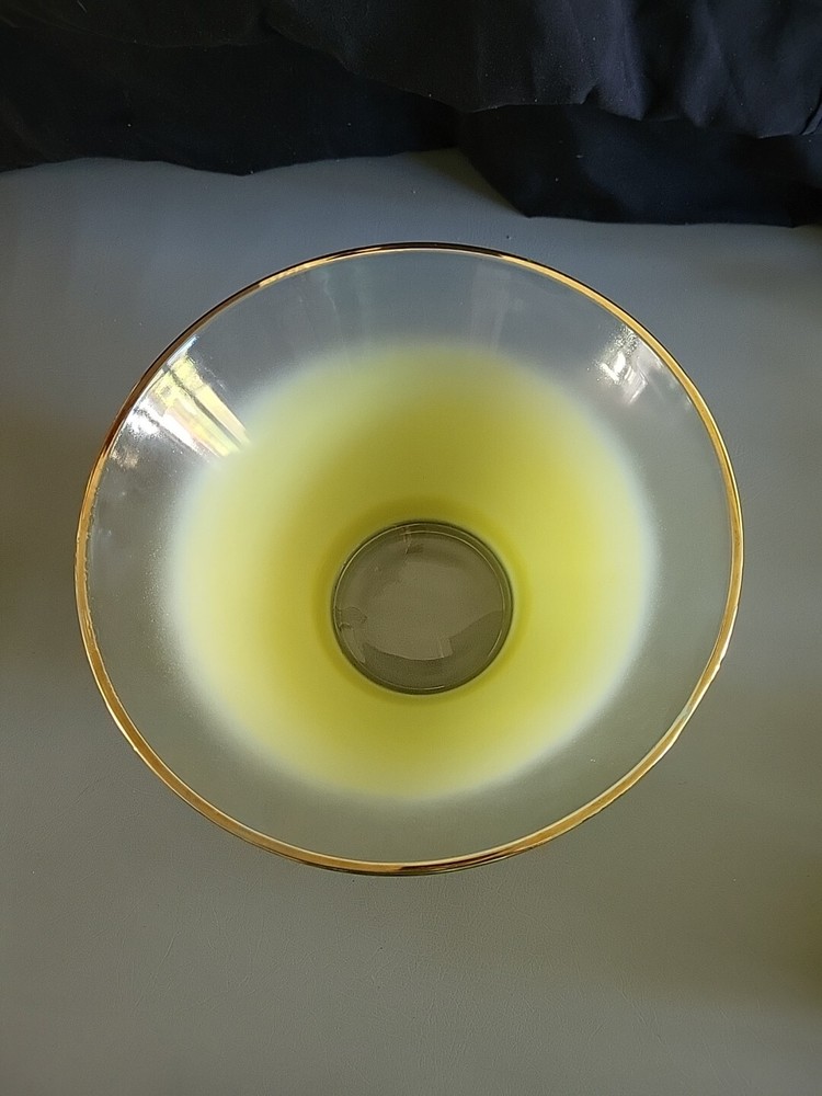 This vintage Blendo bowl set from West Virginia Glass Co. is a four-piece set that includes a large salad bowl and three individual dip/salad bowls. The round bowls feature a vibrant yellow glass material and a mid-century modern style. The set was produced in the United States in the 1950s and is an original art glass piece. The large salad bowl has a diameter of 10.5 inches and stands at 5.5 inches tall. The set is perfect for serving salads and other dishes and is a great addition to any kitchen or dining room. This Blendo bowl set is a must-have for collectors of vintage glassware and is sure to impress.