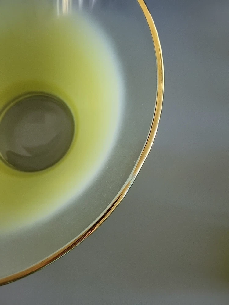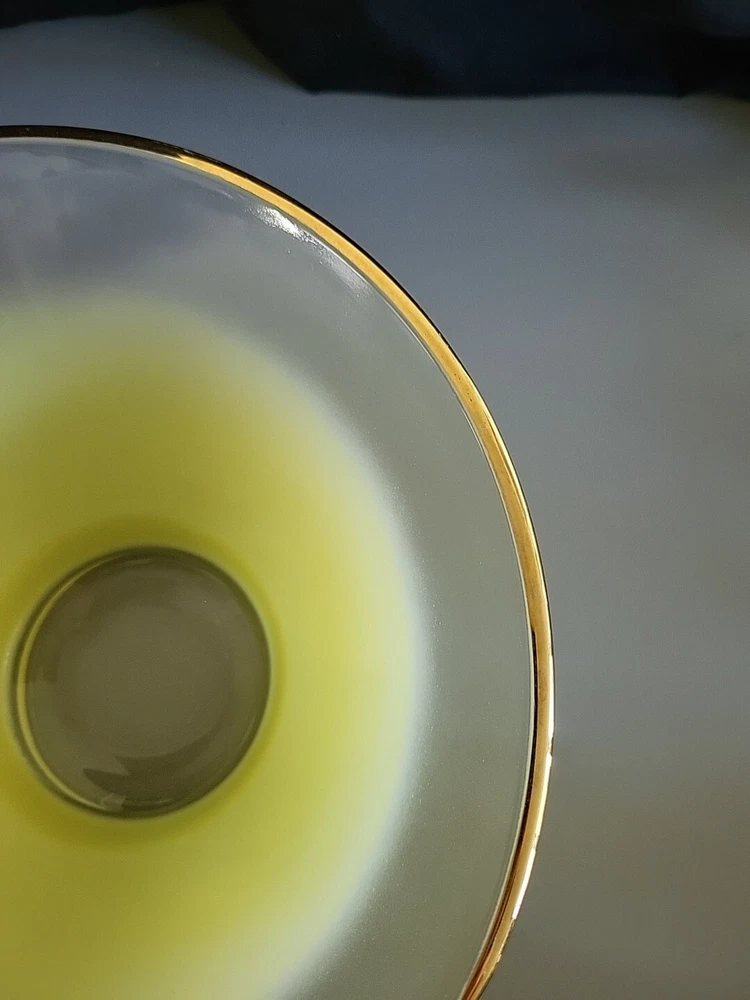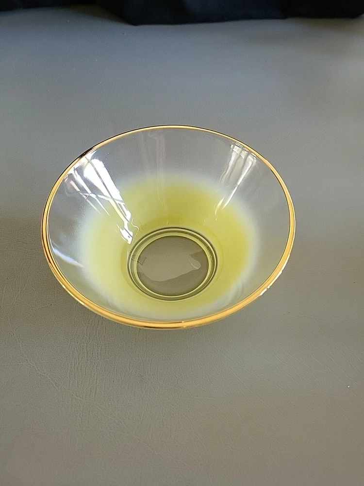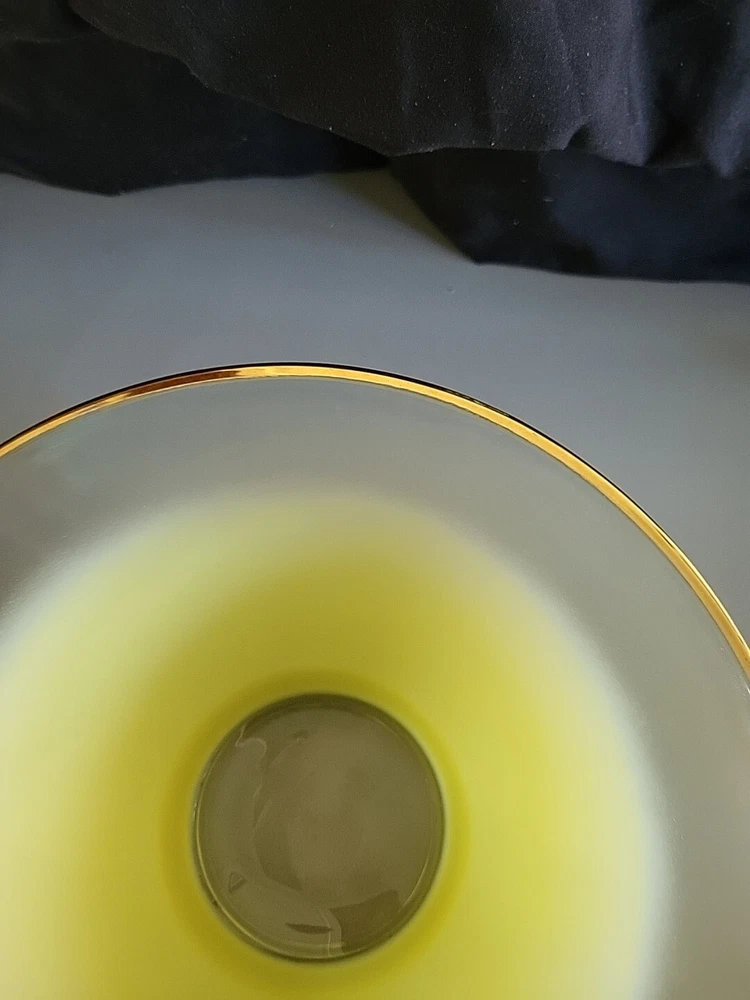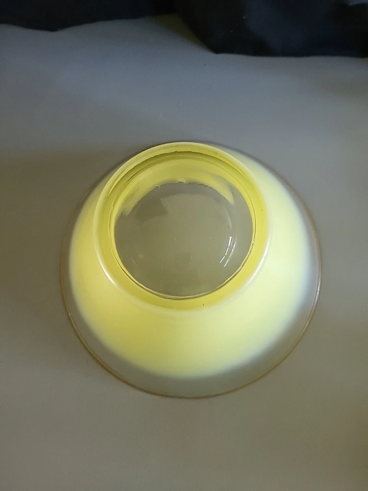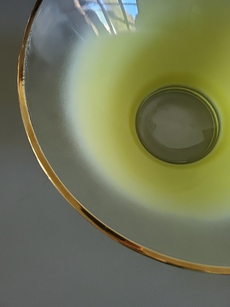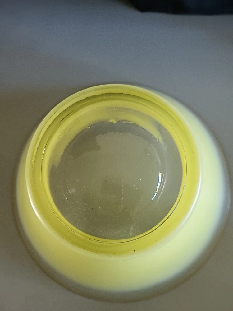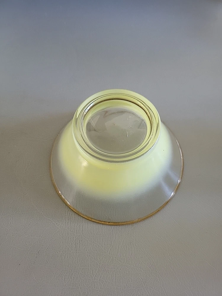 This vintage Blendo bowl set from West Virginia Glass Co. is a four-piece set that includes a large salad bowl and three individual dip/salad bowls. The round bowls feature a vibrant yellow glass material and a mid-century modern style. The set was produced in the United States in the 1950s and is an original art glass piece. The large salad bowl has a diameter of 10.5 inches and stands at 5.5 inches tall. The set is perfect for serving salads and other dishes and is a great addition to any kitchen or dining room. This Blendo bowl set is a must-have for collectors of vintage glassware and is sure to impress.