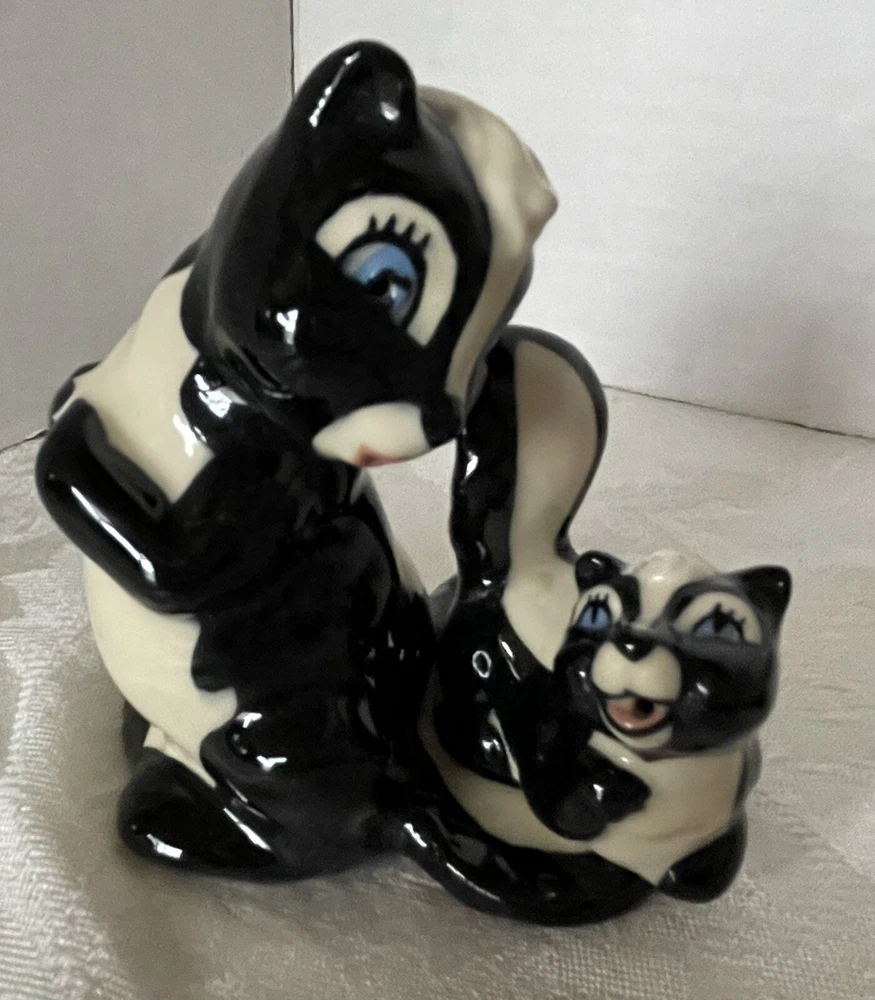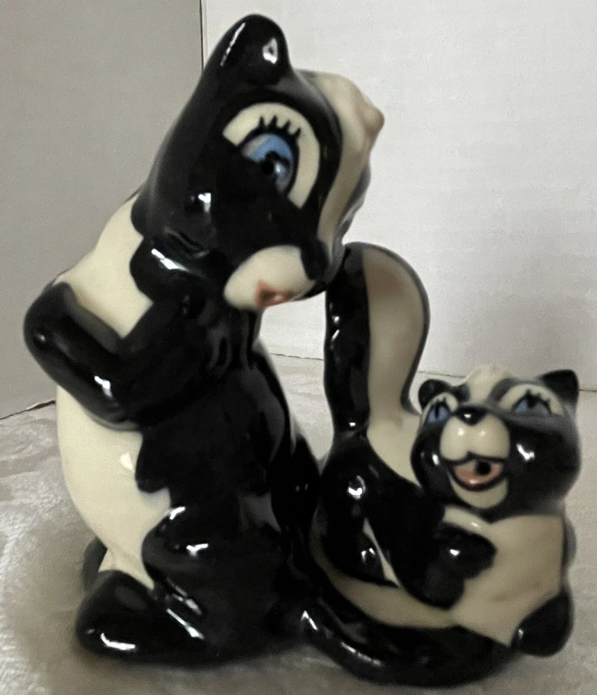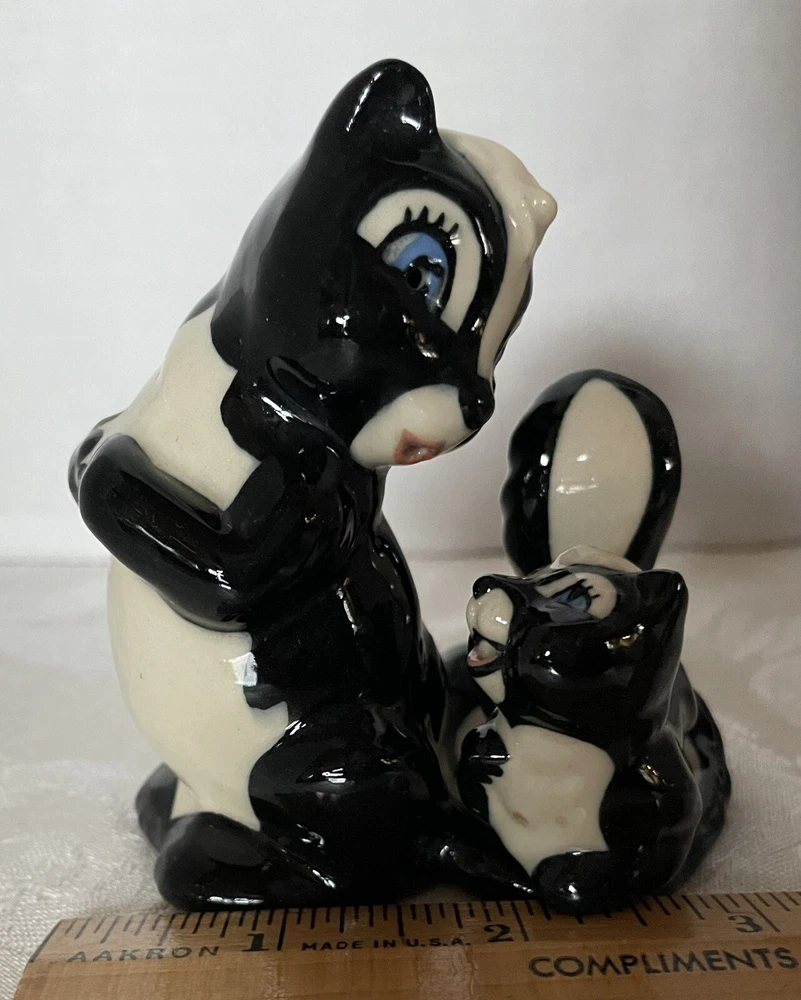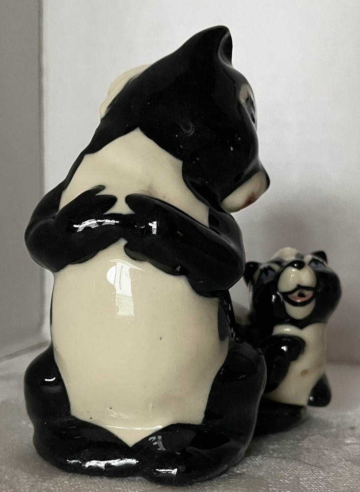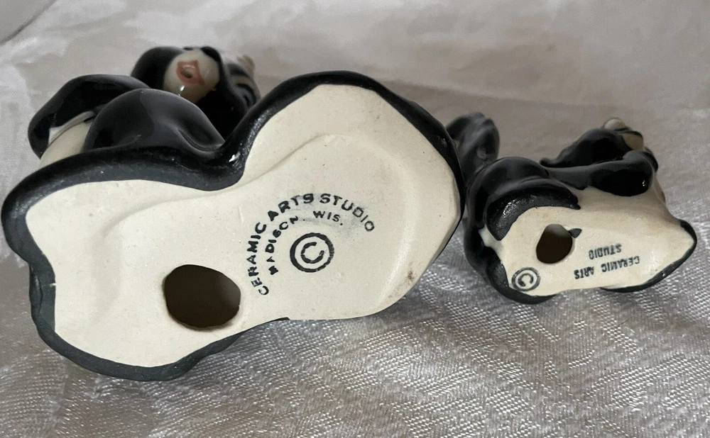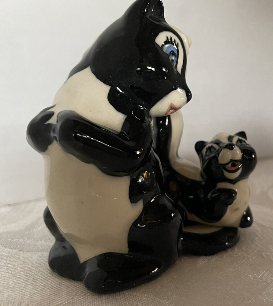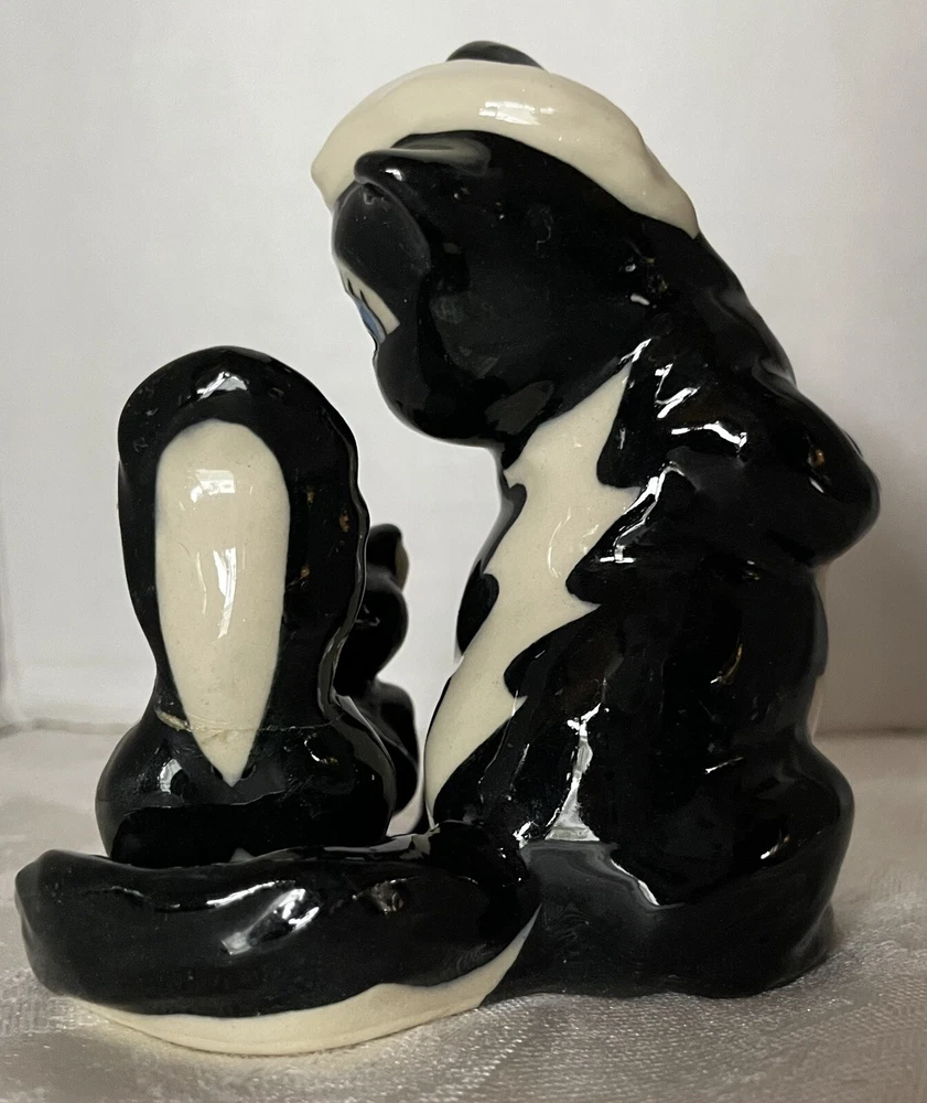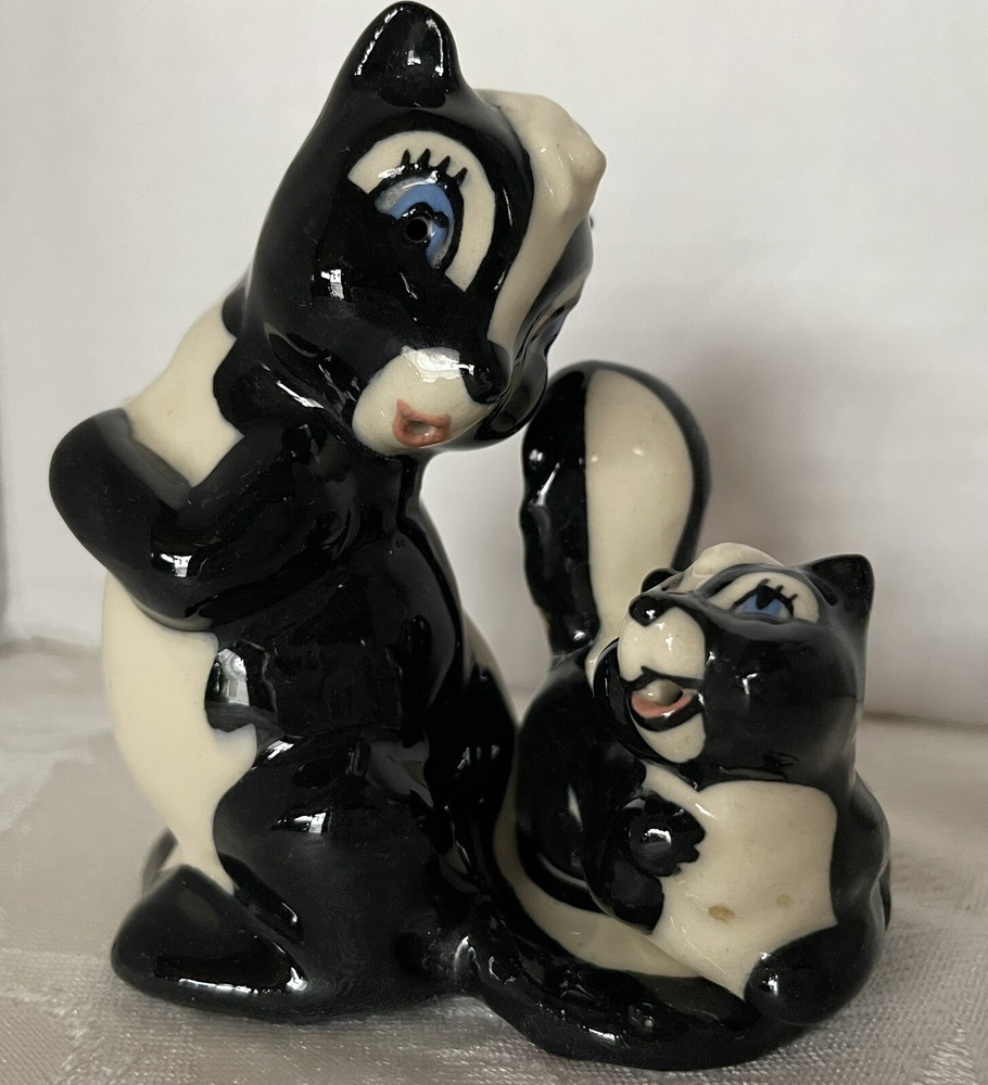 Up for your consideration ...are vintage salt and pepper shakers from Ceramic Arts Studio .. mama skunk and baby skunk … Mama skunk is 3.5” tall .. and I just noticed baby has a repaired tail . (see last two pictures). • Black and white with blue eyes and pink mouths with hole I guess for salt or pepper . Please review pictures for repair and condition . Sale is “as is “ !! // // // / // I am not an expert so I try to give a good description of what I see and as many pics as possible . Please review pictures Please ask any questions prior to bidding I will gladly combine shipping I only ship to continental USA Smoke free, environmentally controlled home All sales are final, but please contact me immediately if you have any concerns ...I strive to give great service and like good feedback . Thank you