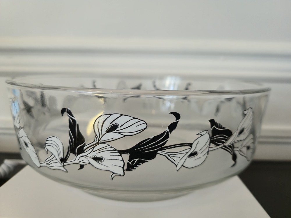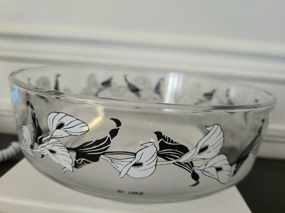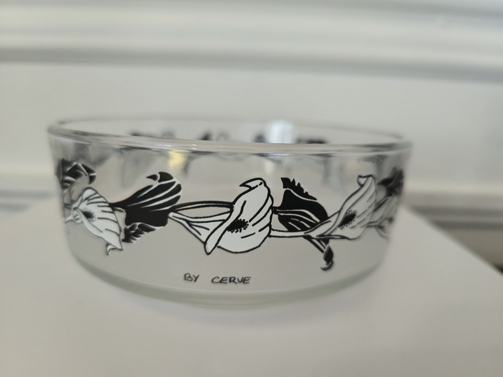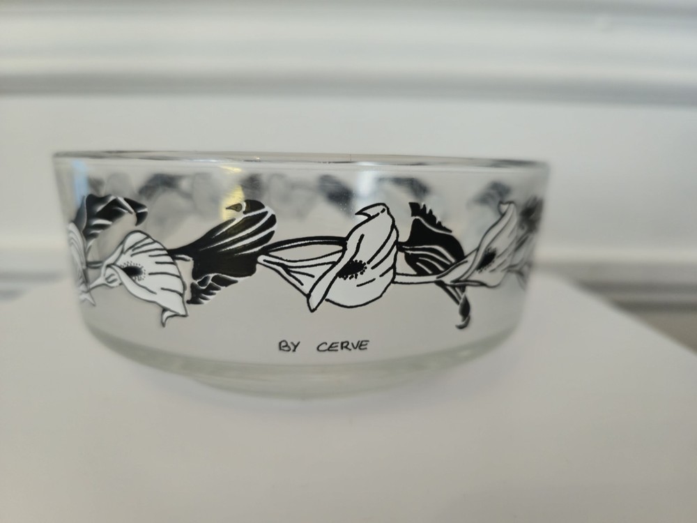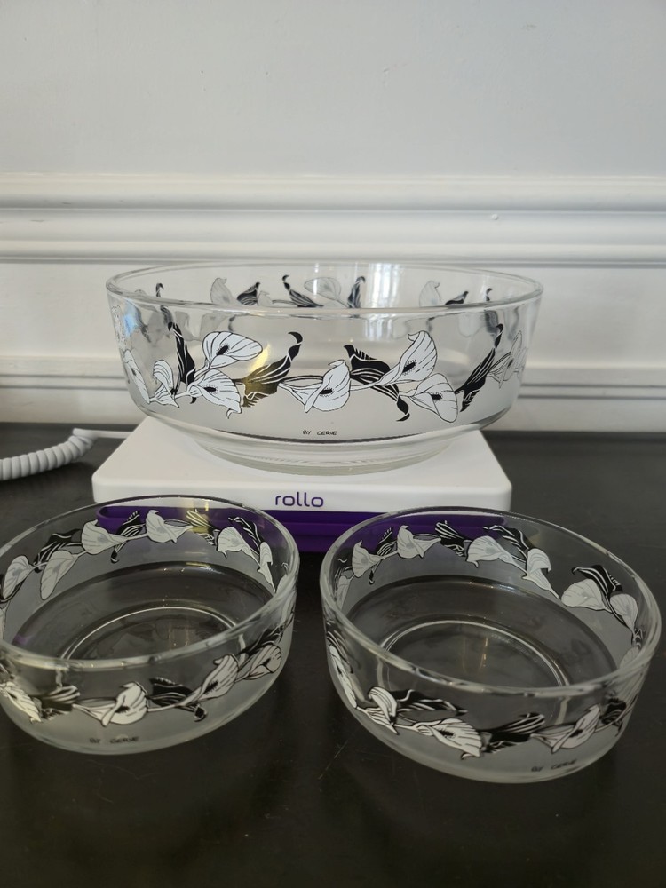 Crafted with precision, this vintage Cerve DeValbor Italy Calla Lily Serving Bowl Set is a testament to mid-century modern design. The set, originating from Italy, features a trio of clear glass bowls, each adorned with delicate lily patterns that exude elegance. The round bowls, are in 2 sizes the first os larger 9" wide and 3" tall, and the 2 smaller ones are 4" wide and 1.5" tall. Everything is in excellent condition. We combine shipping.
