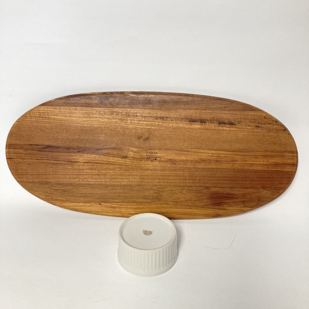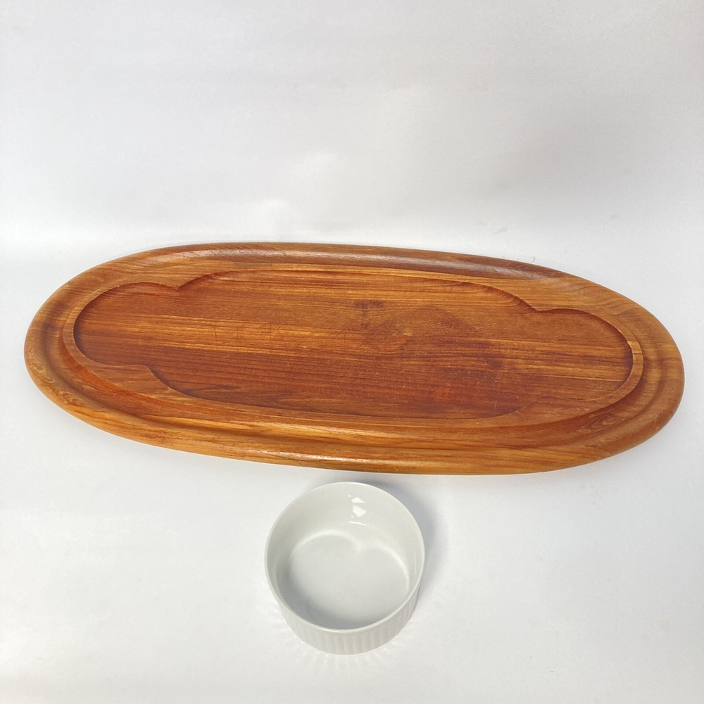 Vtg DANSK JENS QUISTGARRD MCM Large Oval TEAK WOOD Serving Tray Cracker & Cheese Charcuterie Dip Good vintage condition, has wear consistant with age and use. Comes with one bowl Measures 22" long and 10" wide Nice retro piece!