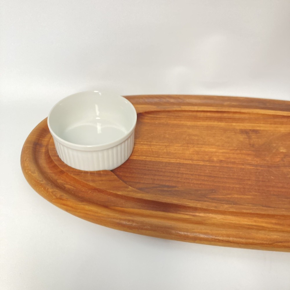 Vtg DANSK JENS QUISTGARRD MCM Large Oval TEAK WOOD Serving Tray Cracker & Cheese Charcuterie Dip Good vintage condition, has wear consistant with age and use. Comes with one bowl Measures 22" long and...