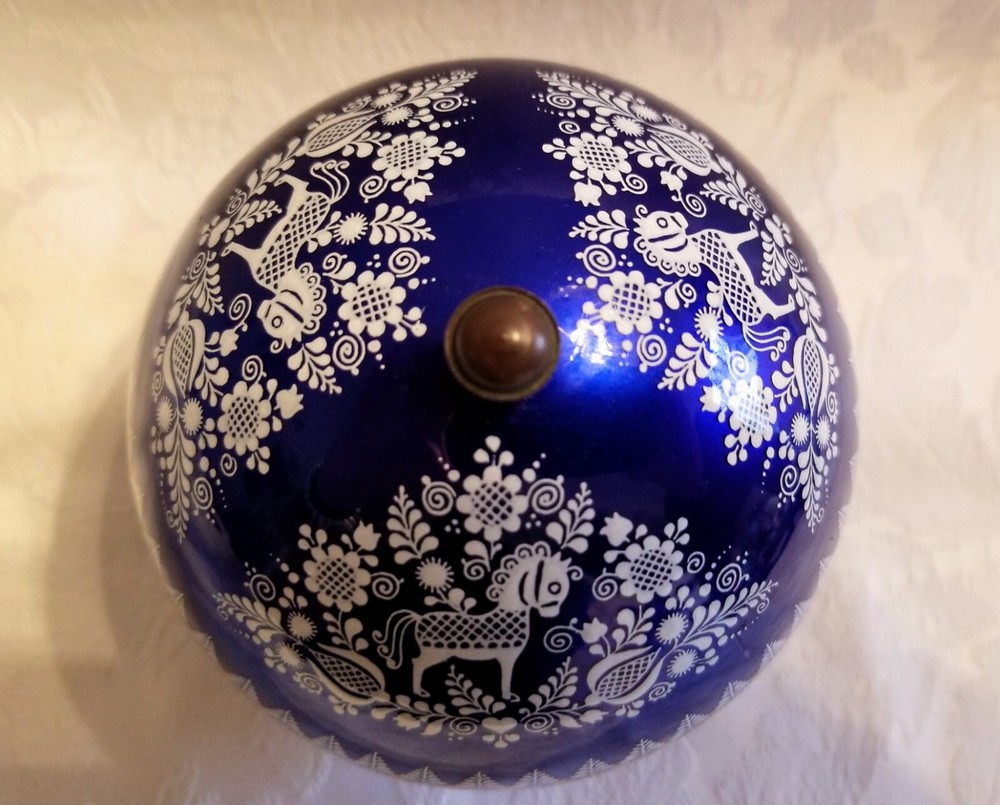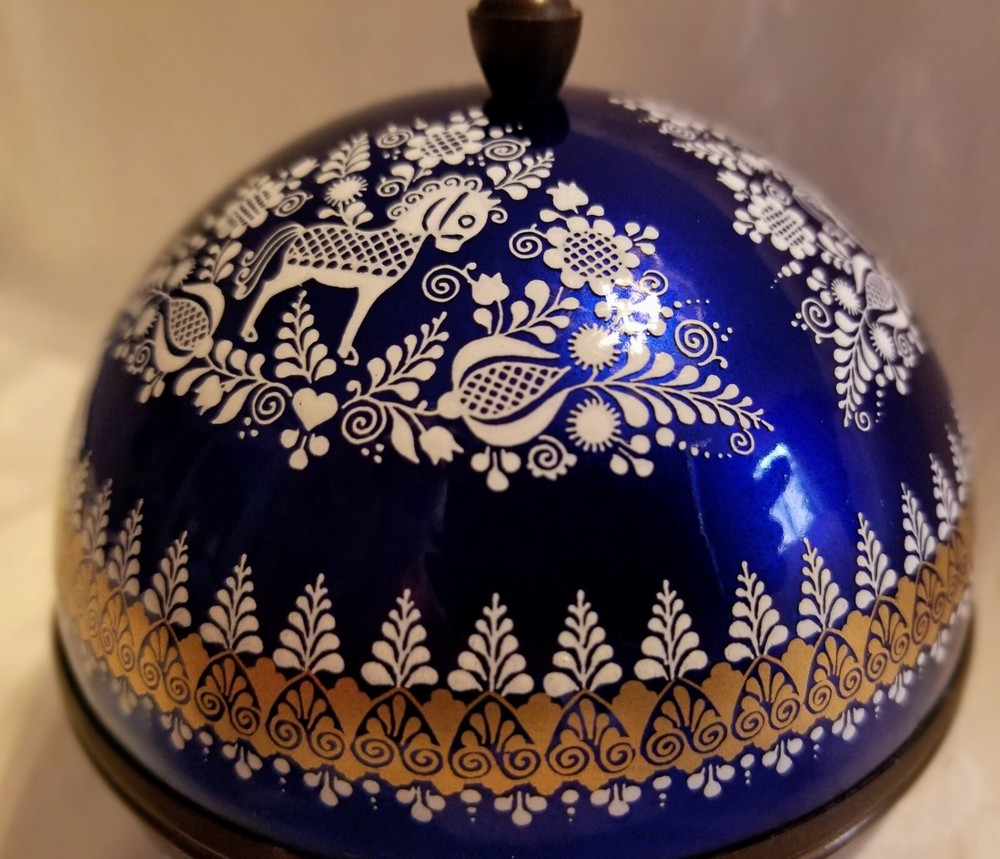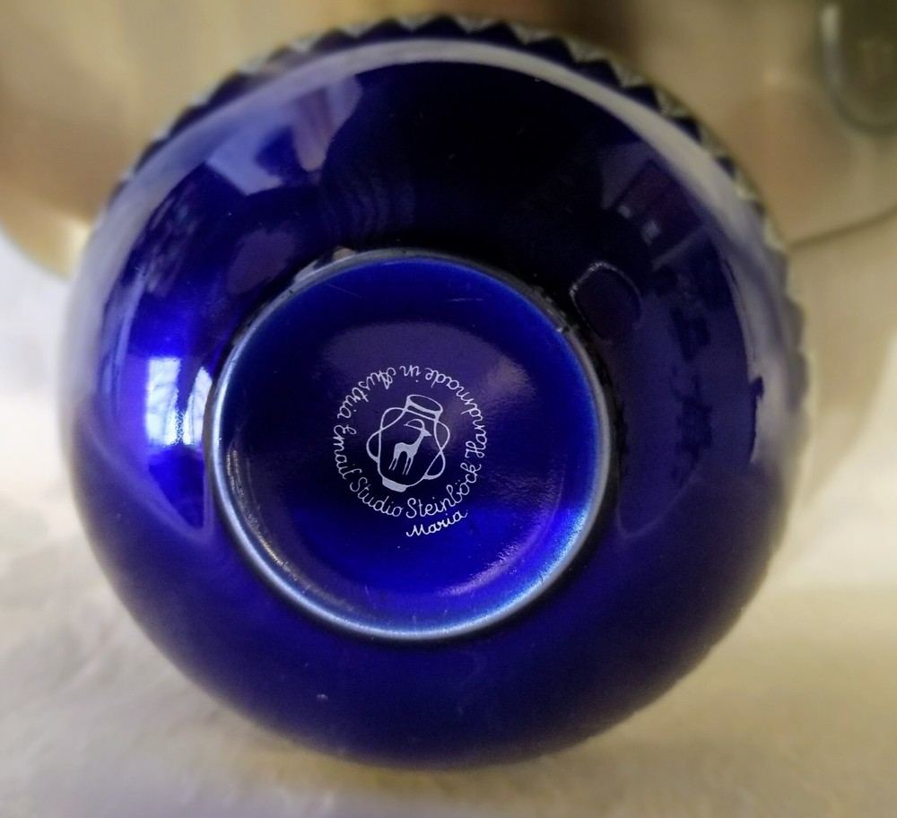 Vtg EMAIL STUDIO STEINBOCK Enameled Egg Trinket Box Brass Trim Austria. It's a very good preowned condition. The painted design includes horses and flowers and gold trim around. There's a light scratch about 1/3 in long, hardly noticeable as shown in picture #4.