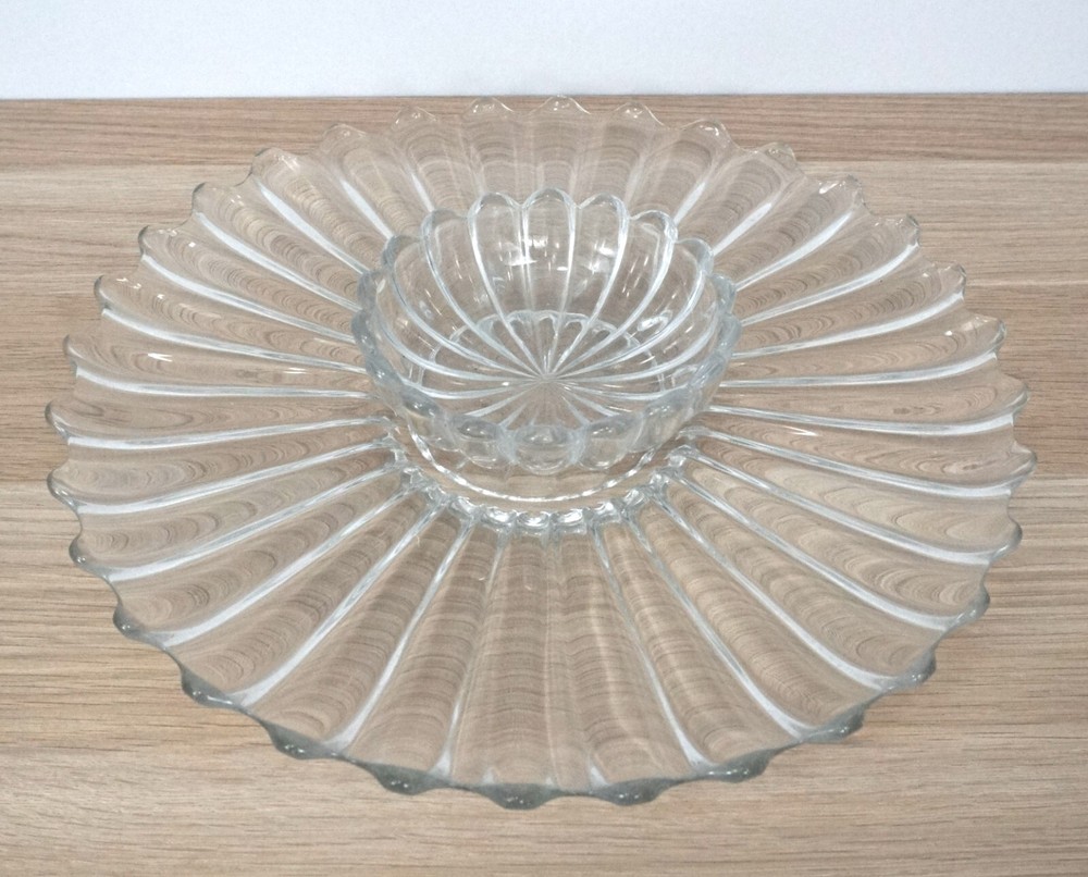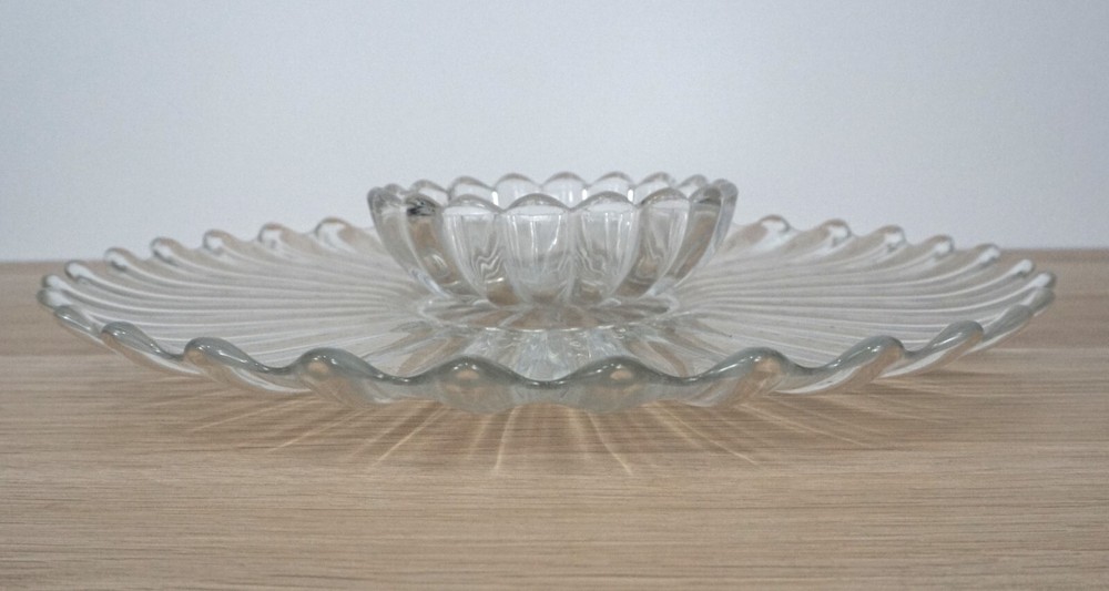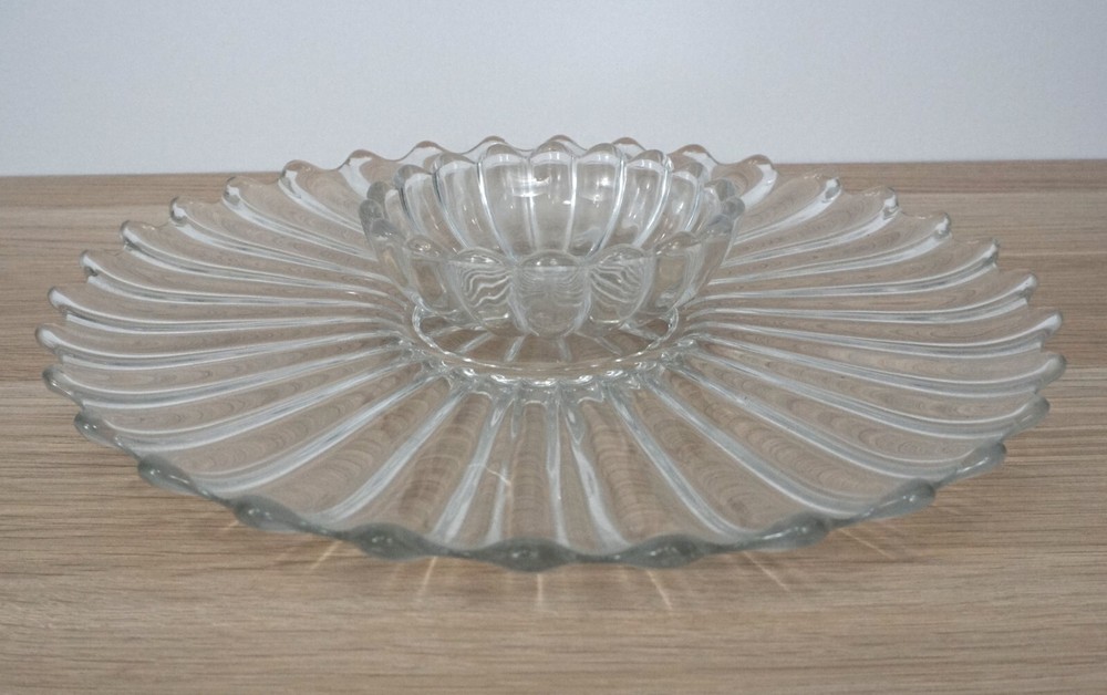 Vtg Heisey Large Round Glass Serving Platter w/ Small Bowl Chip & Dip --Good used condition. --Platter is 13.5" in diameter. Bowl is 5" in diameter.