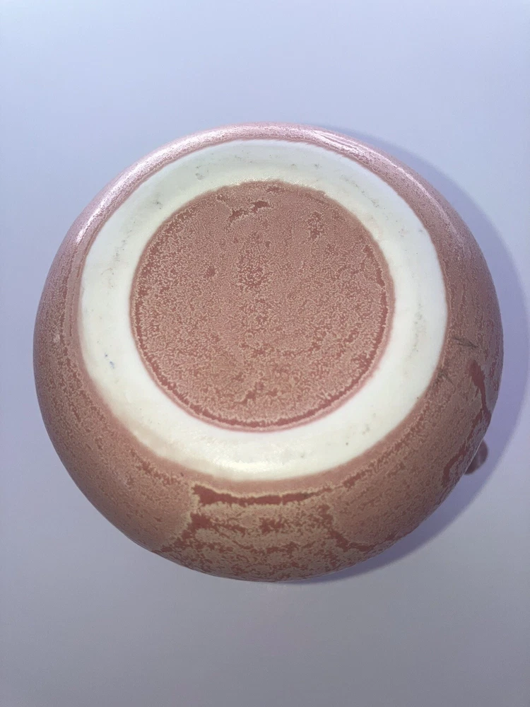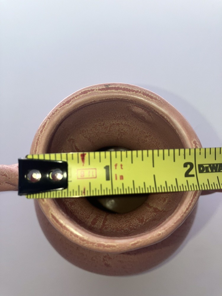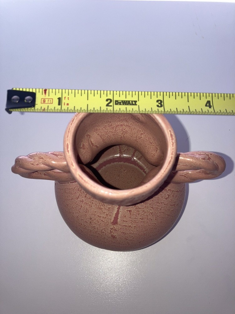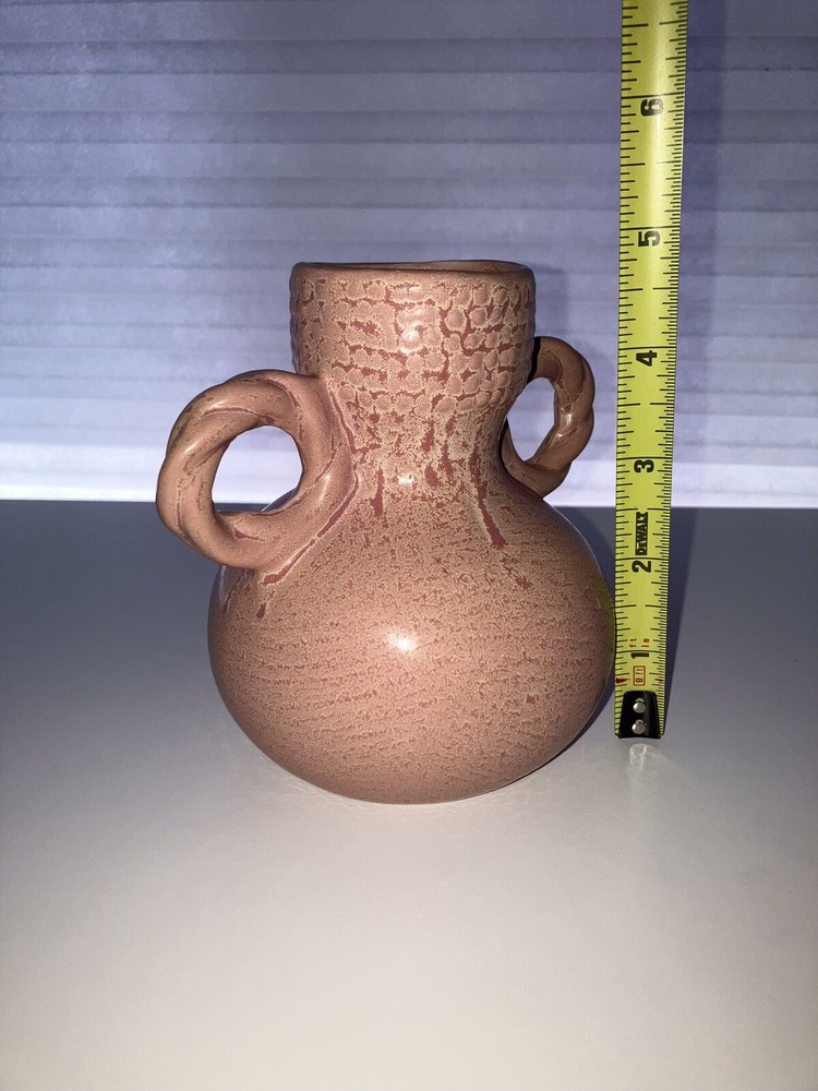 The unmarked brand of this vase adds to its charm and authenticity. Measuring at a small 4.75 inches, this vase can fit perfectly on any shelf or table. Whether you're a pottery enthusiast or simply looking for a beautiful decor piece, this Studio Art Pottery Double Handle Pink Vase is the perfect addition to your home. Weight: 13oz Width: 4” handle to handle