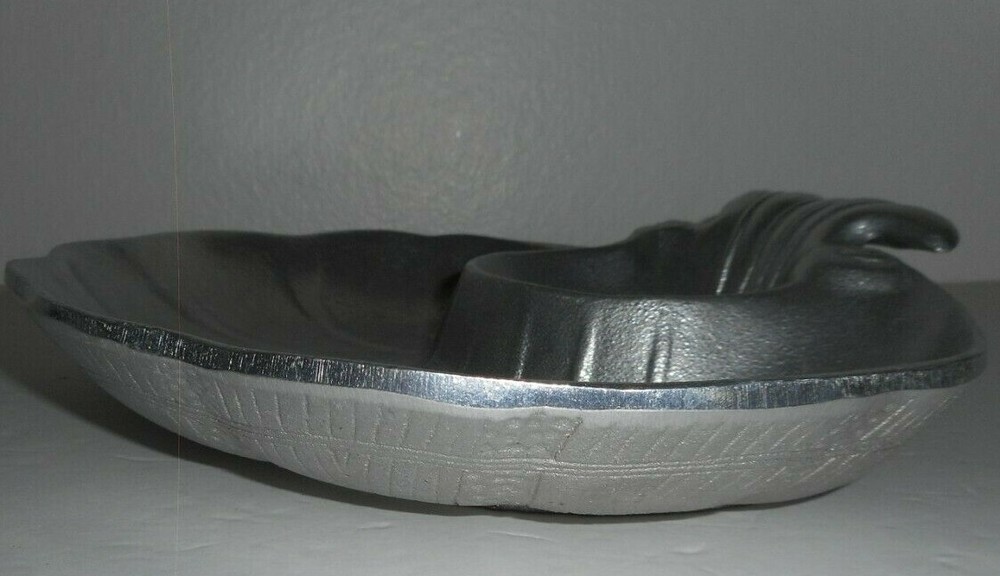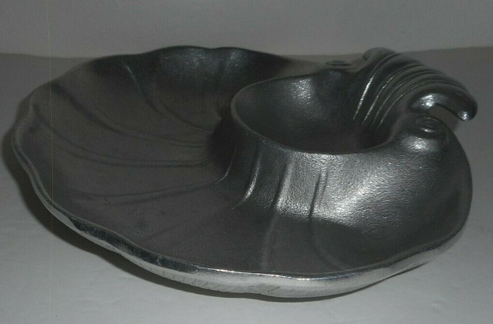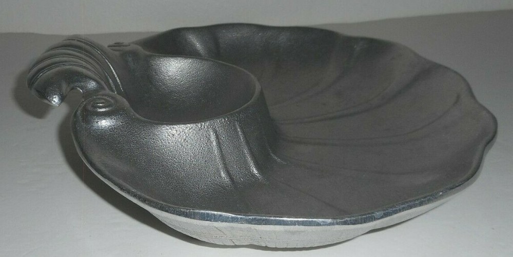 #1009 Vtg RWP The Wilton Co Armetale Large Seashell Serving Bowl Chip Dip Metal Pewter The bowl measures approximately 11 inches in diameter, and 2.5 inches tall (handle). The bowl is in very good to excellent. It does not have chips or cracks. The item bears the authentic hallmarks of an RWP Wilton product at the bottom. Please see photos of item's actual condition.