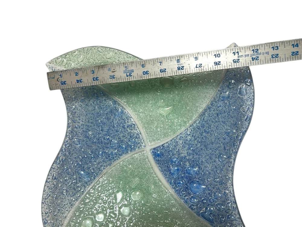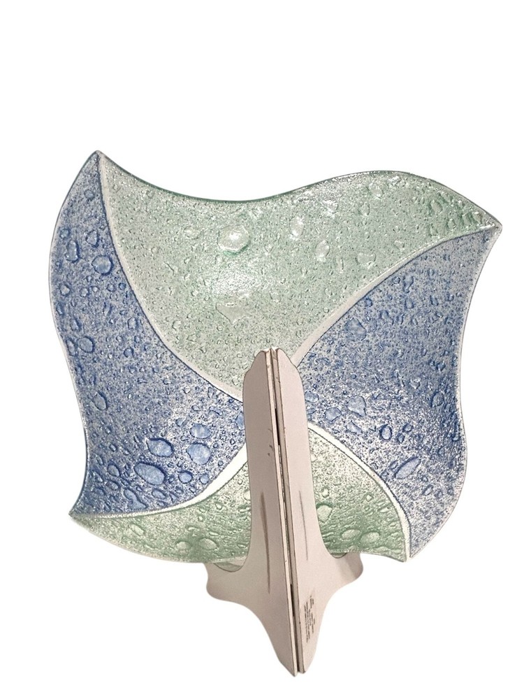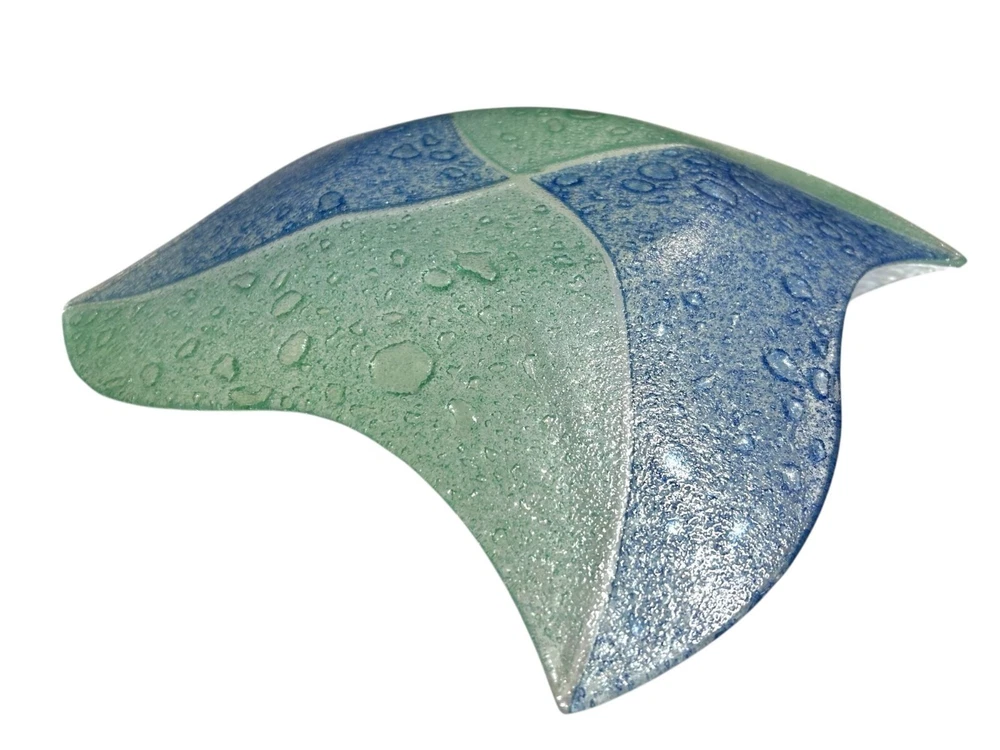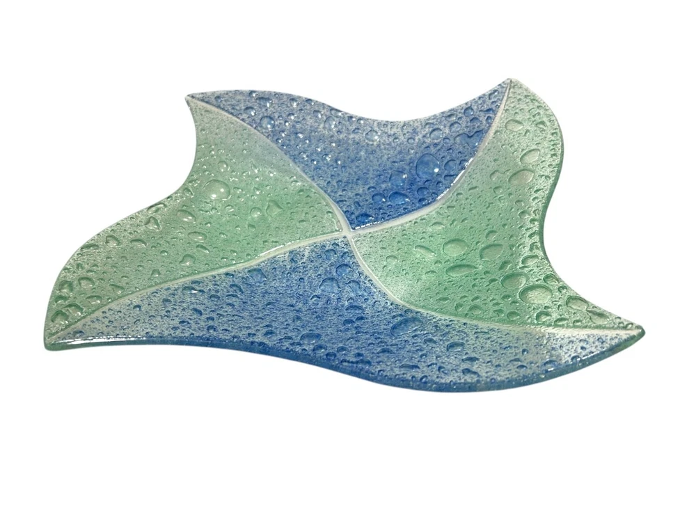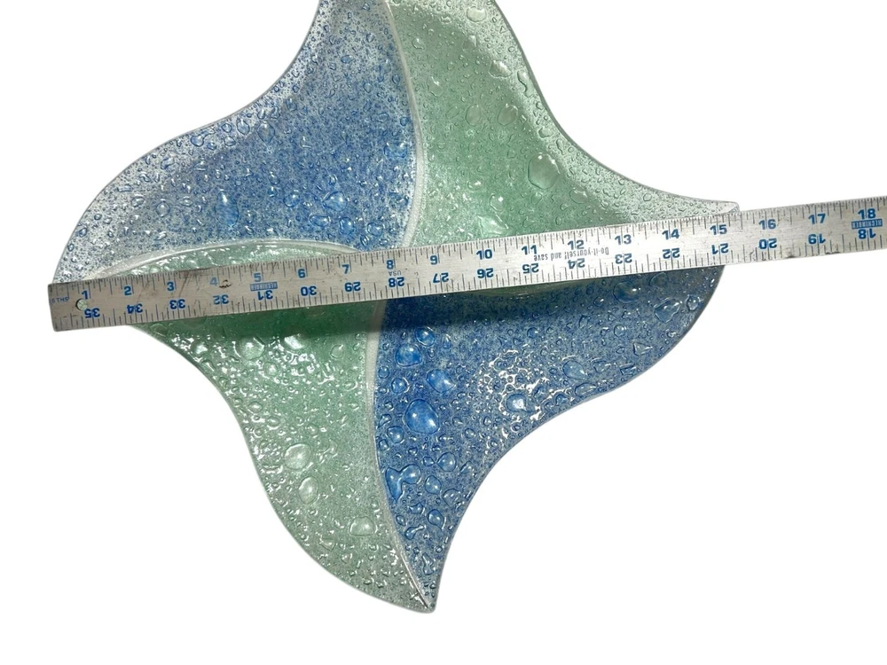 This exquisite glass tray exhibits a beautiful blend of blue and green hues with a textured controlled bubble surface. The elegant design is both functional and decorative, making it an excellent addition to any space. Shaped like a star, this piece showcases craftsmanship and style. • Controlled Bubbled glass • Star Shaped • Textured blue & green design • Can be used as plate/tray/large shallow bowl • Elegant and stylish decor piece 1 inch deep, 11.25 inch wide, corner to opposite corner is 15.5 inches Please read to the end. Condition : Pre-owned, excellent. Please zoom in to pictures for details of condition. Pictures are part of the detailed description Allergy warning : Comes from a smoke free home but not a pet free home. For clothing : Please see measurements in pics and compare to clothing that currently fits you. We offer 30 day buyer paid returns no questions asked. The item must be returned in the same condition that it left here. Tags or original packaging of new products must not be altered. Shipping both ways in these cases will be at buyers expense. Refund will be issued upon receiving the item. If your item is damaged in shipping or you received the wrong item and/or it was not as described in the listing, please contact us as soon as you receive the package. Will will make it rught. Please feel free to ask any questions before purchase! Shipping : Friday-Sunday purchases ship Monday Monday-Tuesday purchases ship Wednesday Wednesday-Thursday purchases ship Friday Thanks for looking! Lolli’s recycle Hub