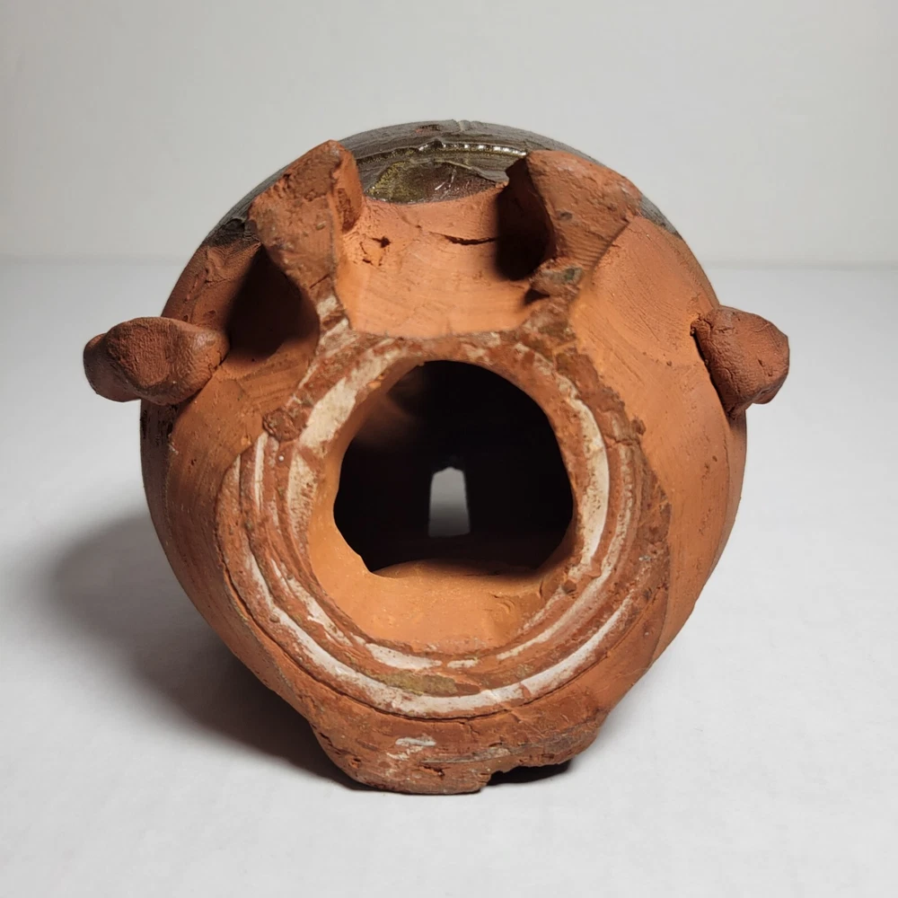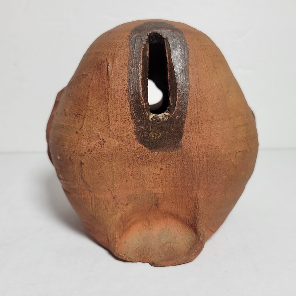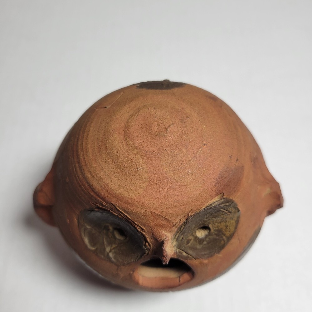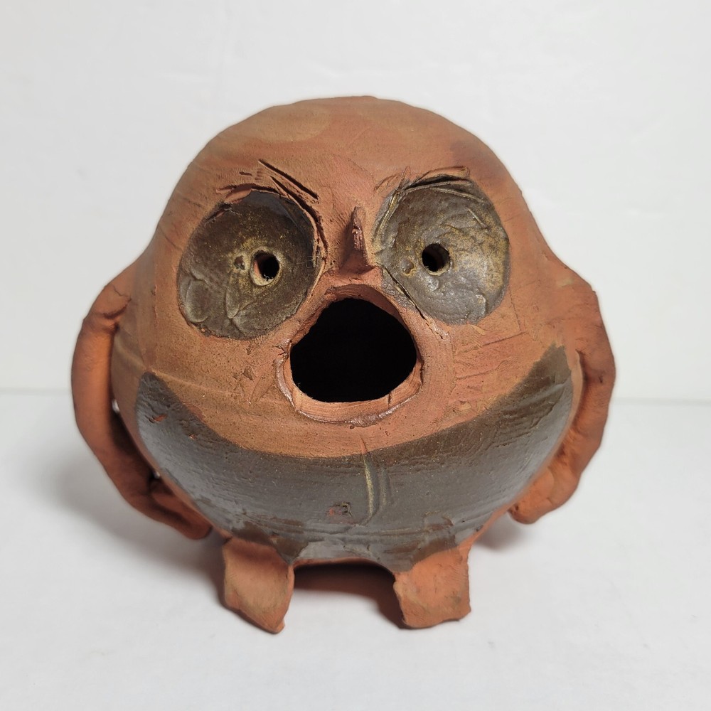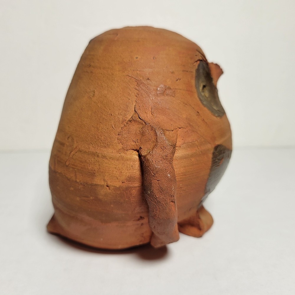 This listing is for a 4.5" tall unmarked clay studio art pottery owl bank. Missing the stopper on the bottom. Some minor marks as pictured....