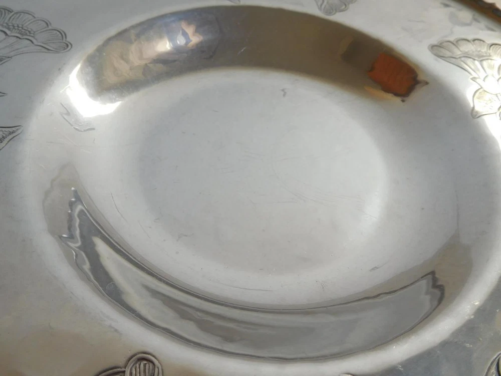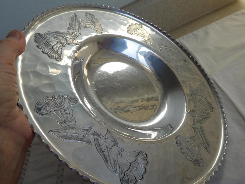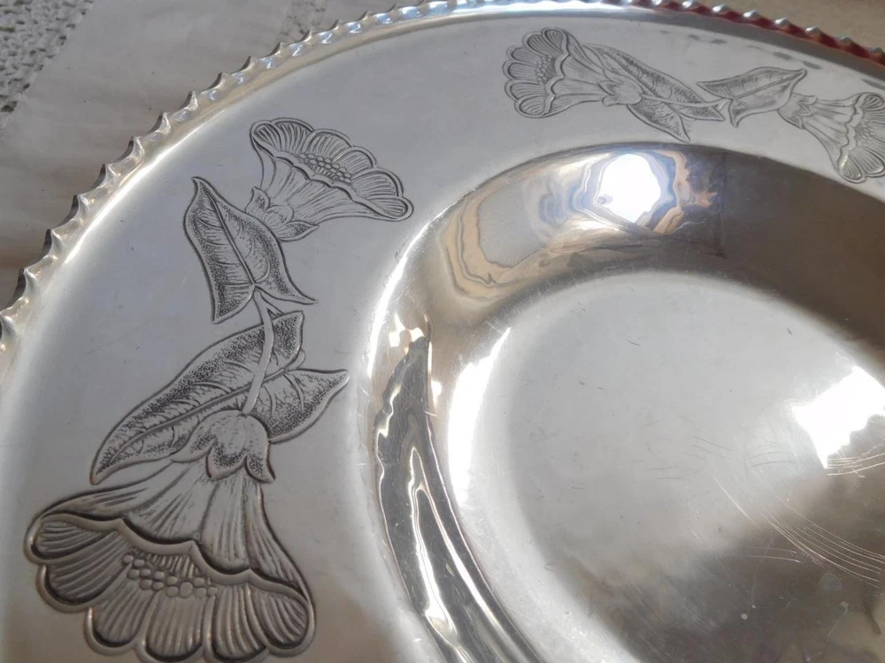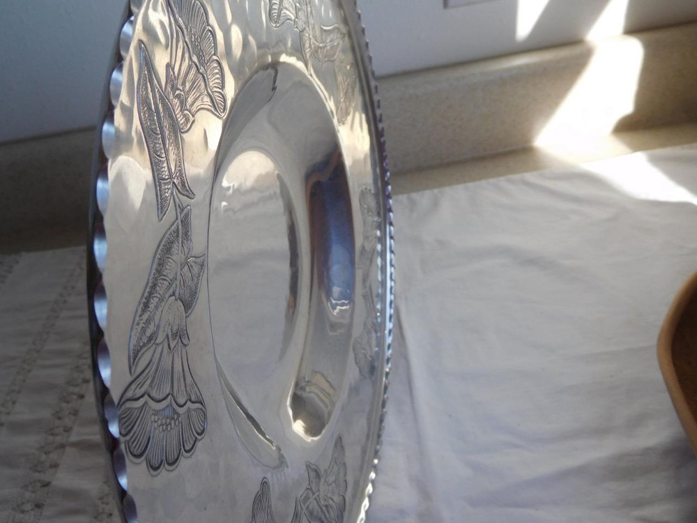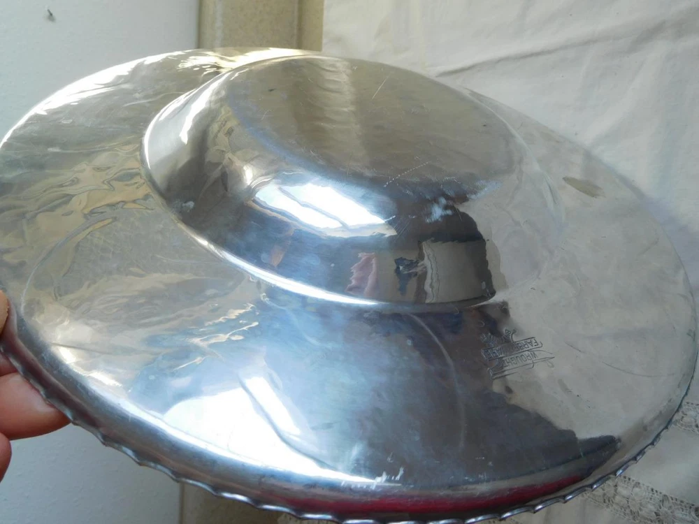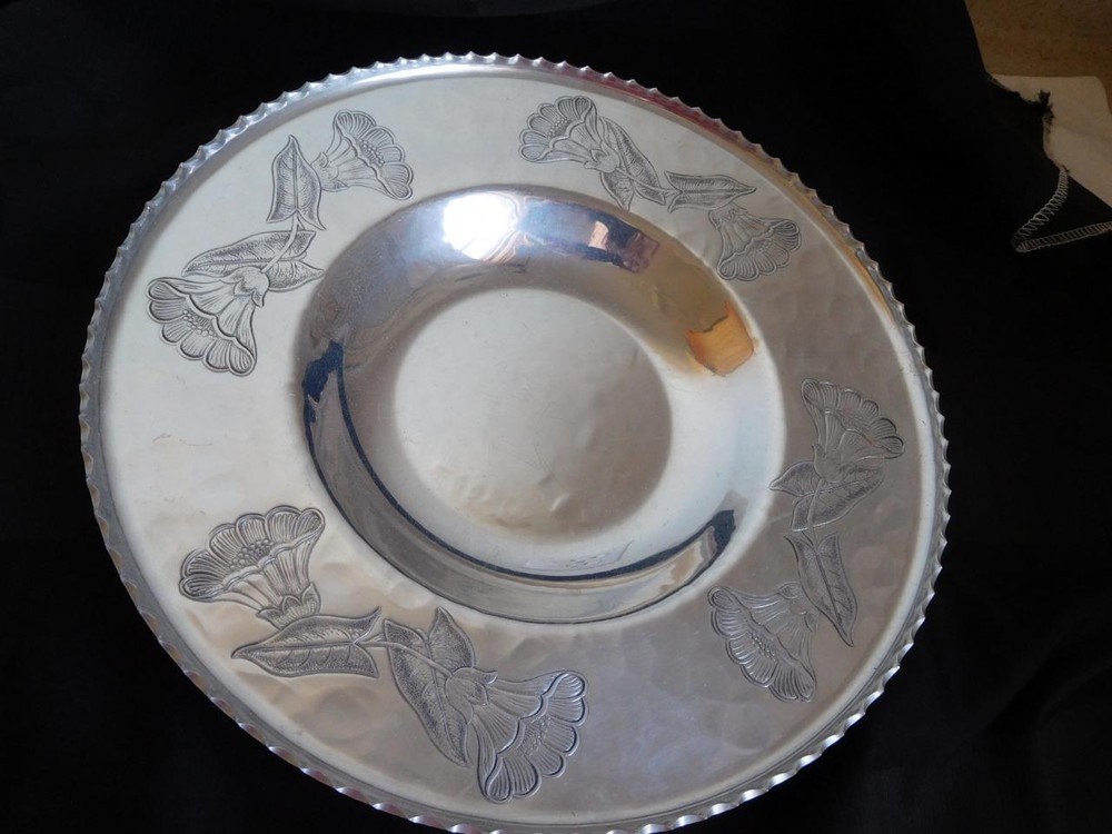 Very shiny with only a few small scratches in the very center, 11 1/2" Farberware hammered aluminum Morning Glory flower large shallow bowl or chip and dip platter. Center is about 1" deep. Very pretty, very retro. Vtg SHINY Farberware CHIP DIP Lrg SHALLOW BOWL HAMMER ALUMINUM Morning Glory Vtg SHINY Farberware CHIP DIP Lrg SHALLOW BOWL HAMMER ALUMINUM Morning Glory Click images to enlarge Description Very shiny with only a few small scratches in the very center, 11 1/2" Farberware hammered aluminum Morning Glory flower large shallow bowl or chip and dip platter. Center is about 1" deep. Very pretty, very retro. Add me to your Favorite Seller ShdBx26 Get images that make Supersized seem small. Showcase your items with Auctiva's Listing Templates! The complete eBay Selling Solution. Track Page Views With Auctiva's FREE Counter