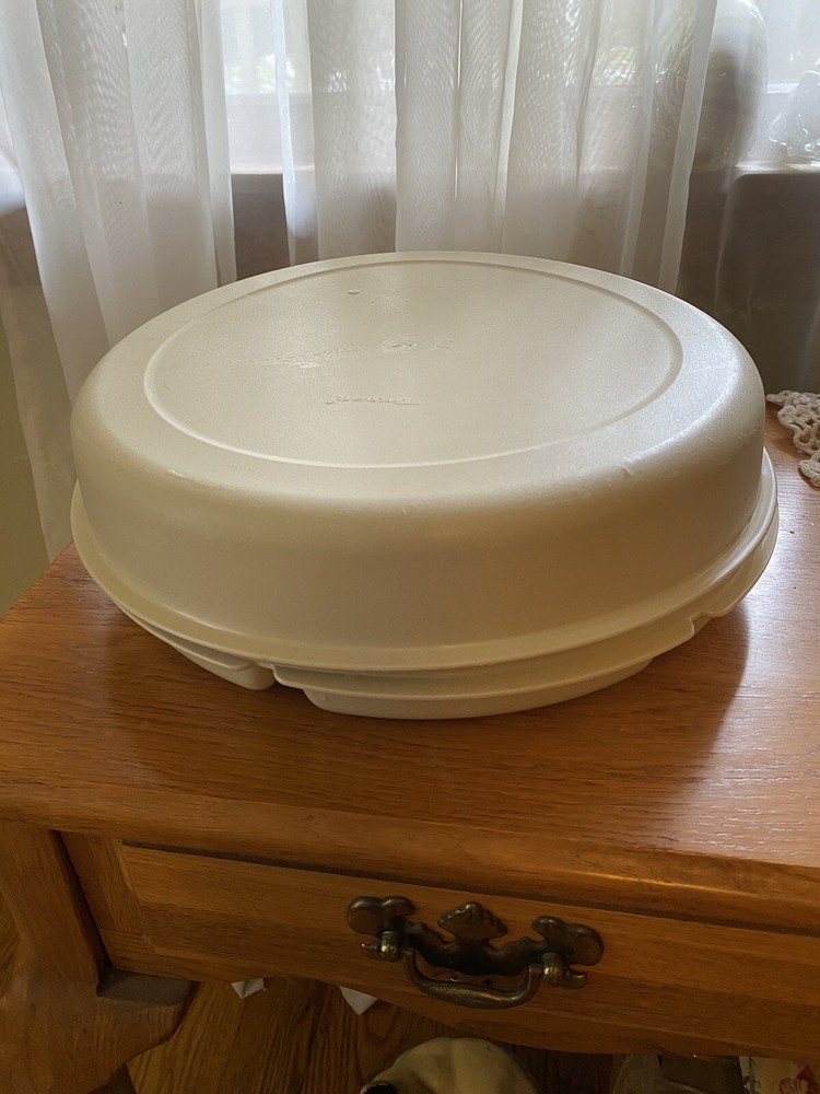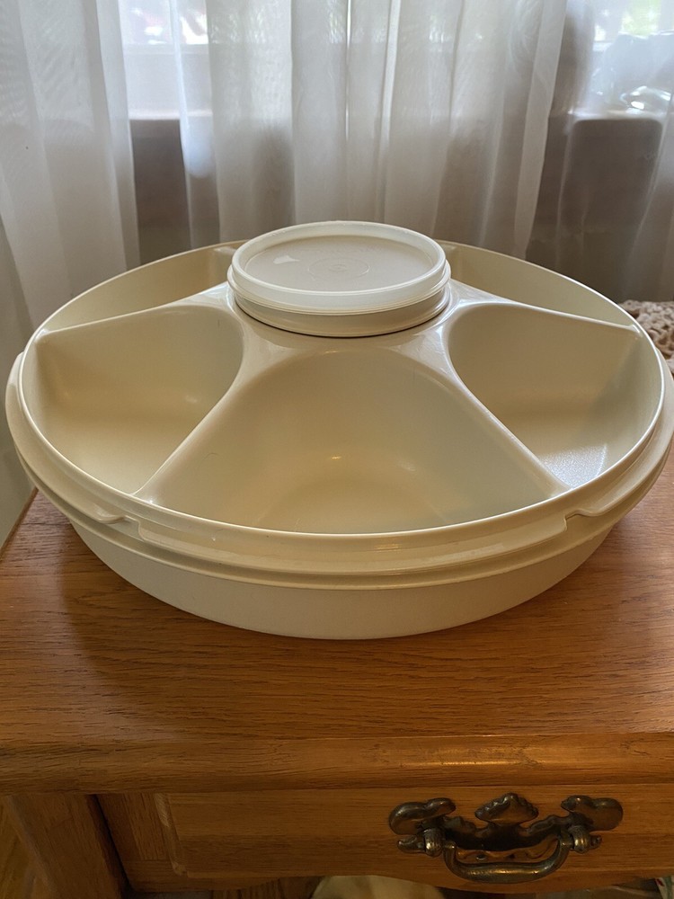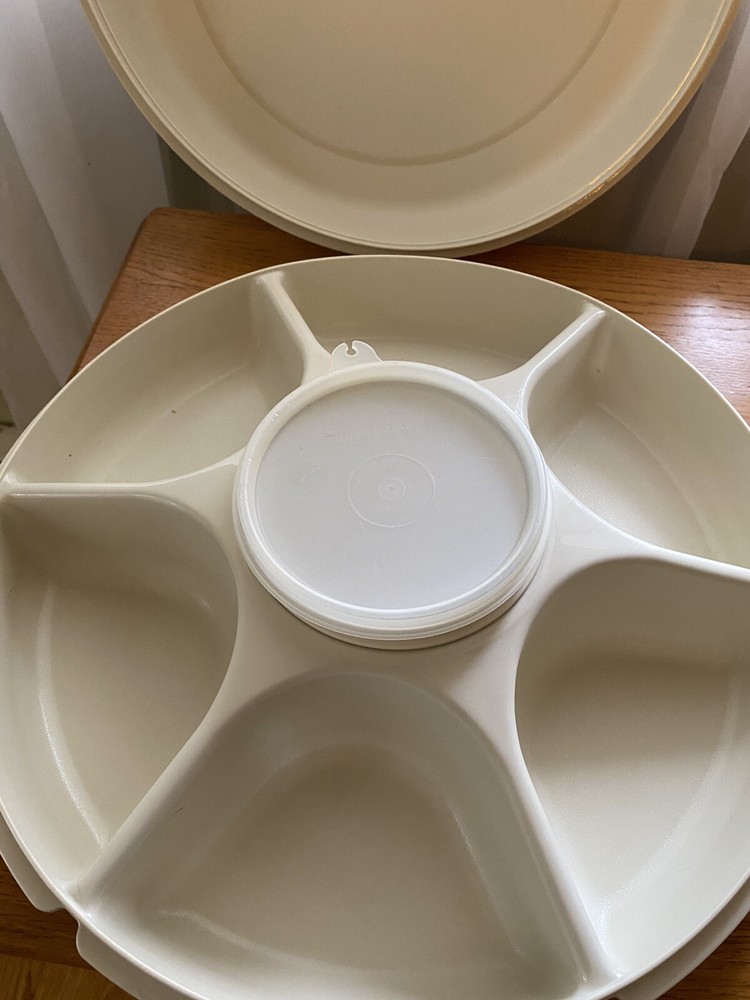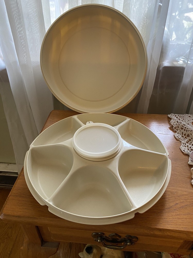 This is a great serving set for game day, parties, BBQS and holidays. It’s 4 pieces including a divided tray with cover and center container with lid, all in almond. The item is preowned and in very nice condition.