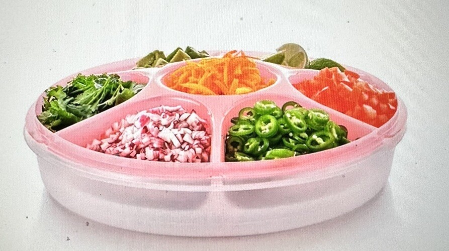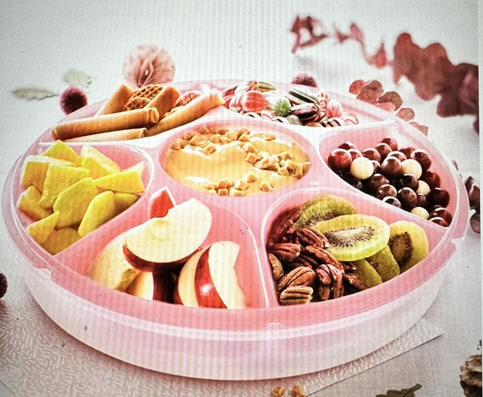This vintage Tupperware serving center set comes with a lid and can hold up to 7.5 cups of vegetables and dip. The tray has a diameter of 13 1/2 inches and is in the shape of a round fruit/vegetable holder. The set is in great condition and is an original piece from the United States. The tray is made of plastic and has seven compartments for storing different types of fruits or vegetables. The lid is a pull-up type and the set includes the lid itself. This serving center set is a great addition to any kitchen and can be used for events or everyday use.