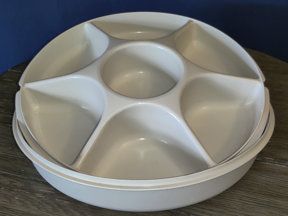 Vtg Tupperware Serving Center Tray Off White Veggie Dip 1665-3 & Lid 1666-1. Excellent condition, ships promptly Usps ground advantage, thanks for looking!