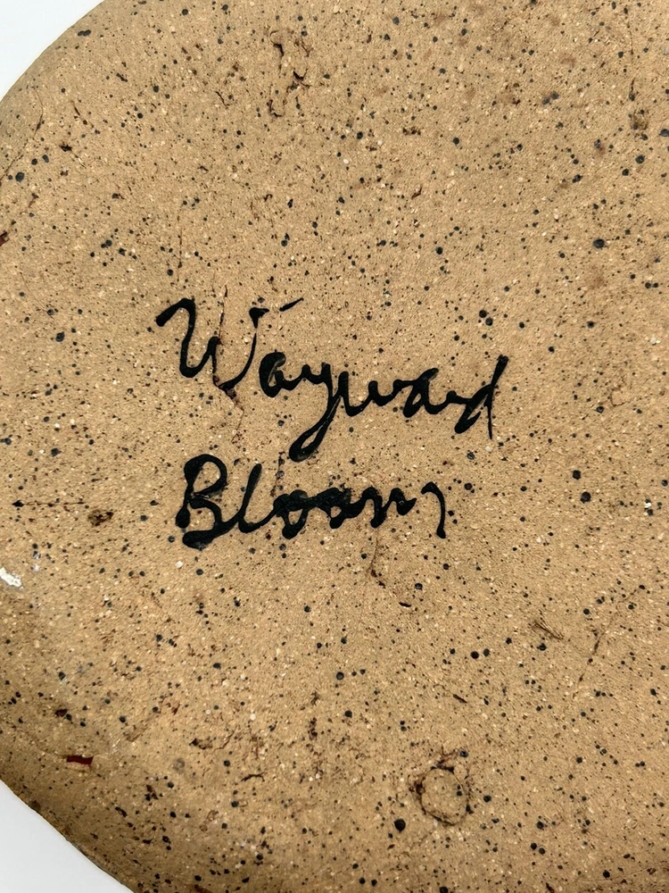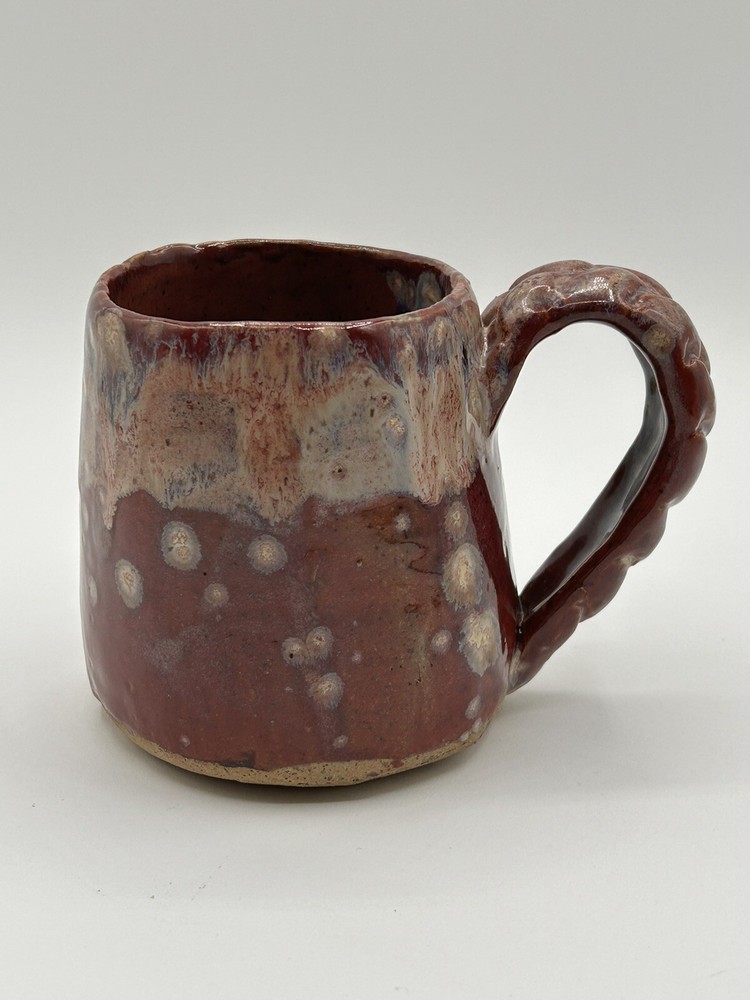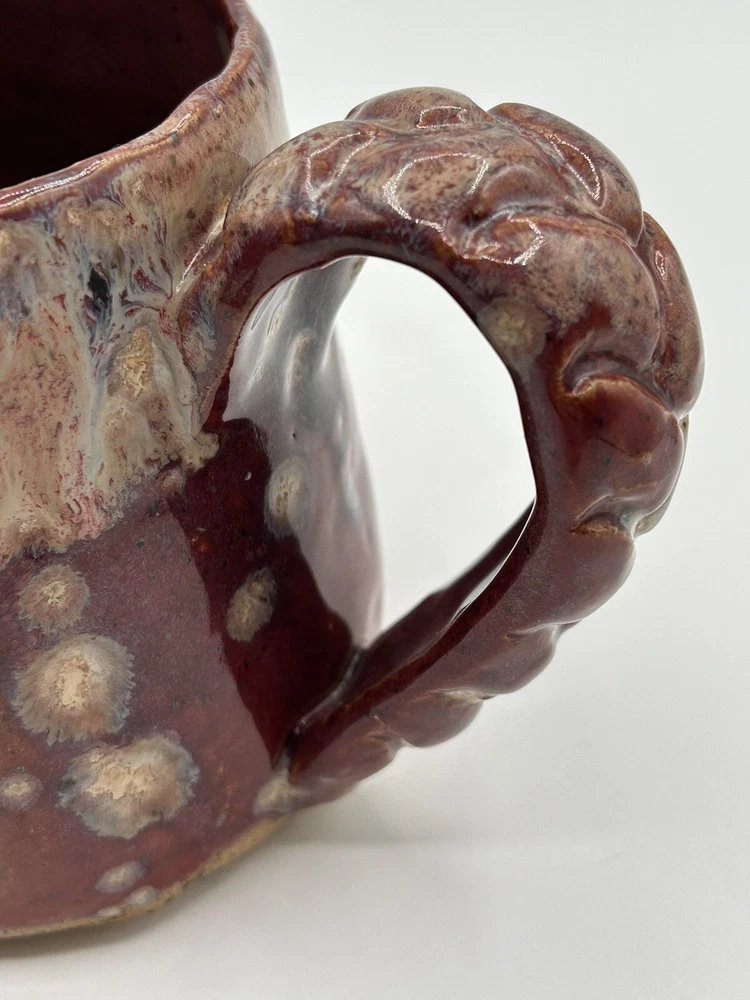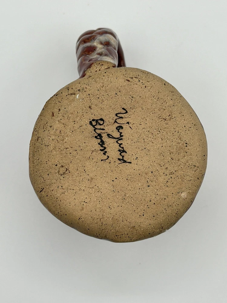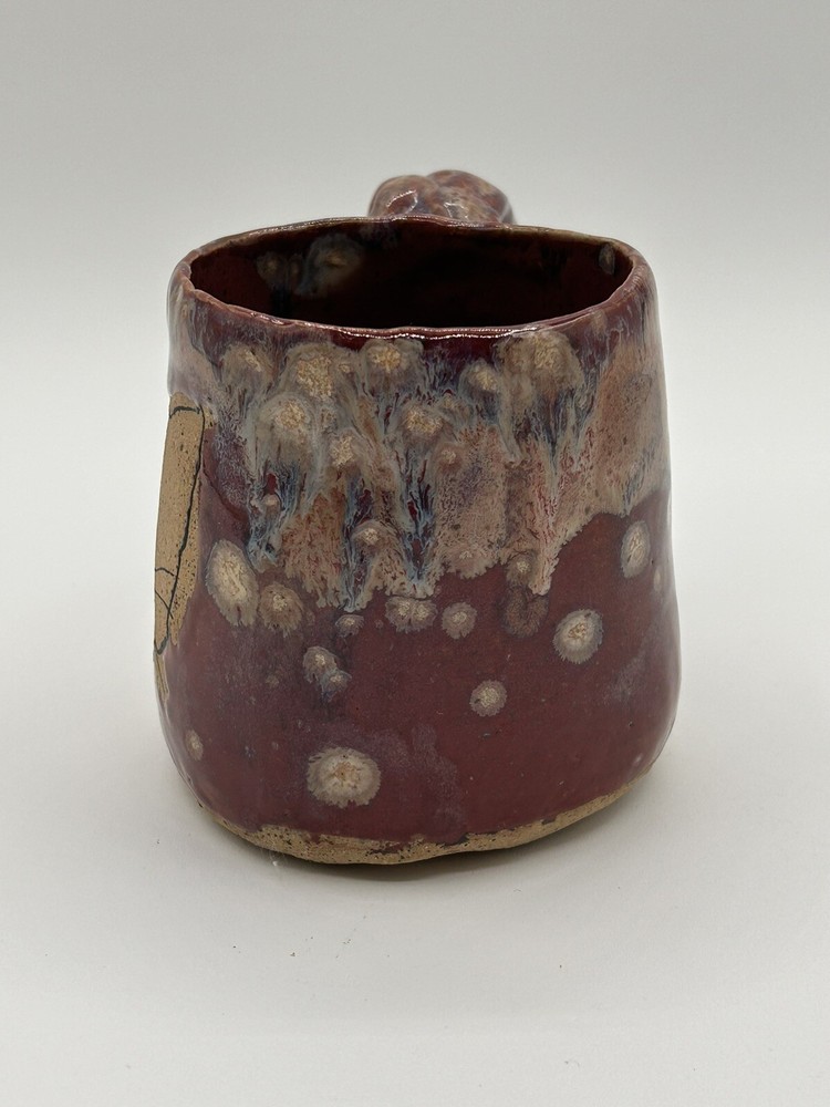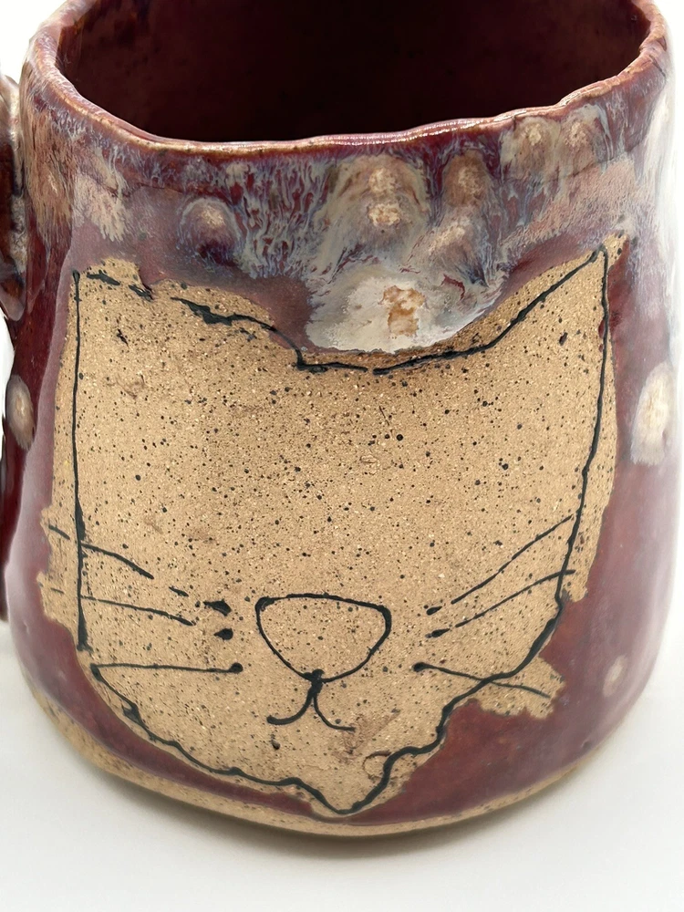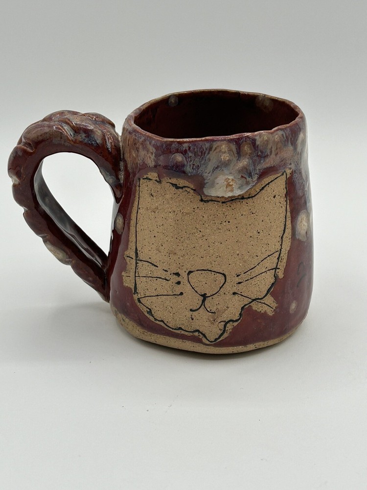 This unique mug features a charming cat face (in the shape of the state of Ohio) with a glossy drip glaze finish. The braided handle adds a touch of elegance to this handmade ceramic studio pottery piece from Wayward Bloom. With a capacity of 12 ounces, it is perfect for all occasions and is a great addition to any collection. The round shape and multicolor design make it a standout piece that is sure to catch the eye of any cat lover. It is easy to care for, as it is hand wash only. This original and licensed reproduction mug is signed by the artist and has a printed backstamp. Add this decorative mug to your collection today! Note 2.0