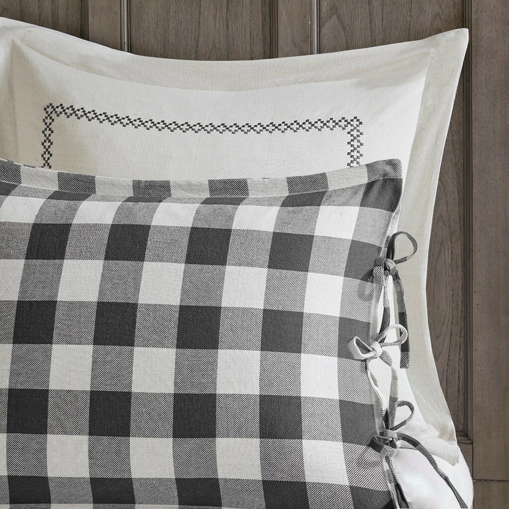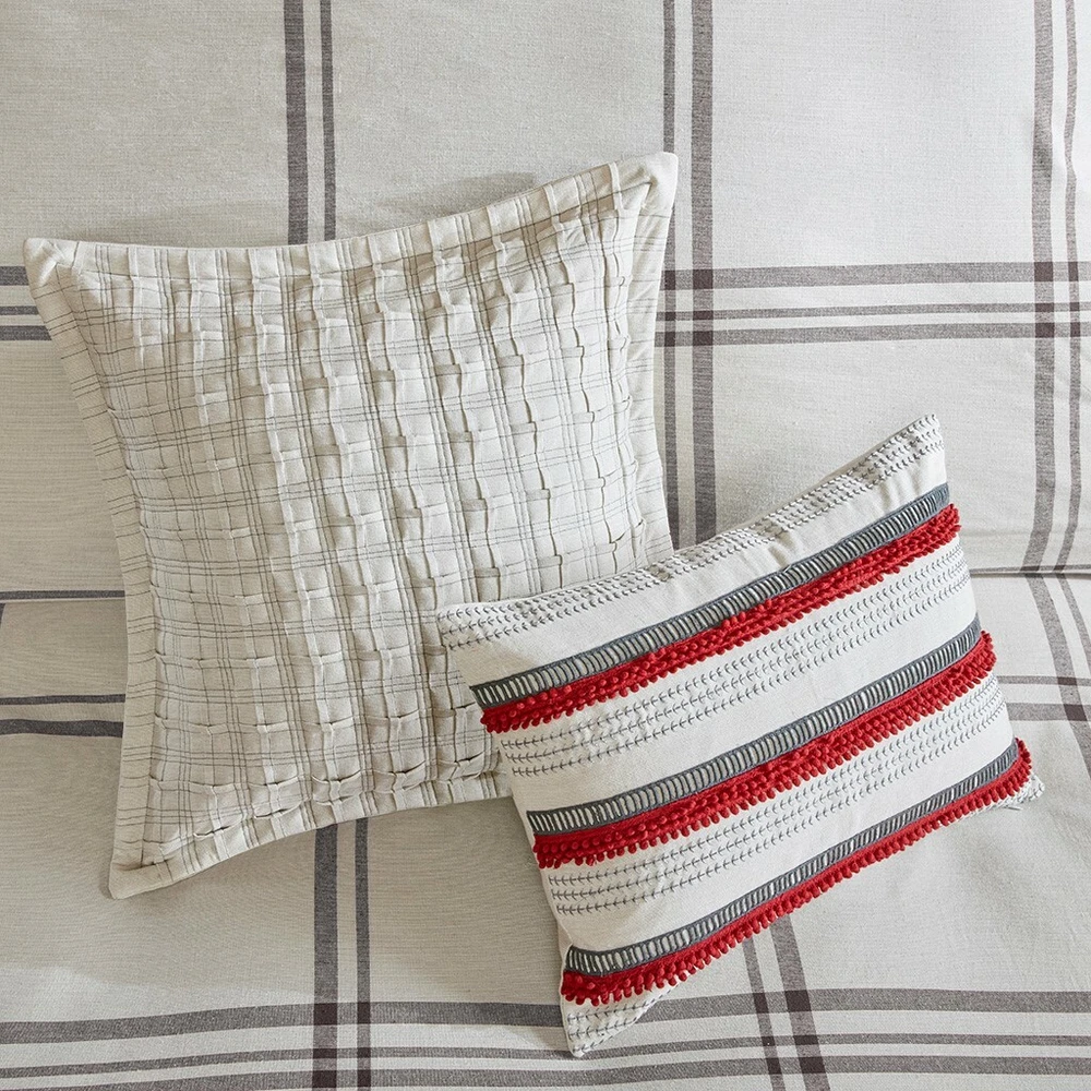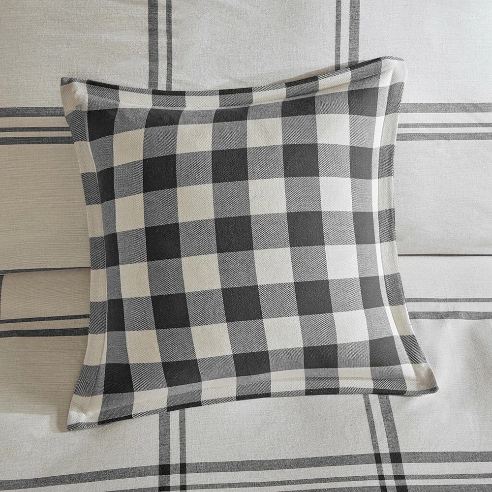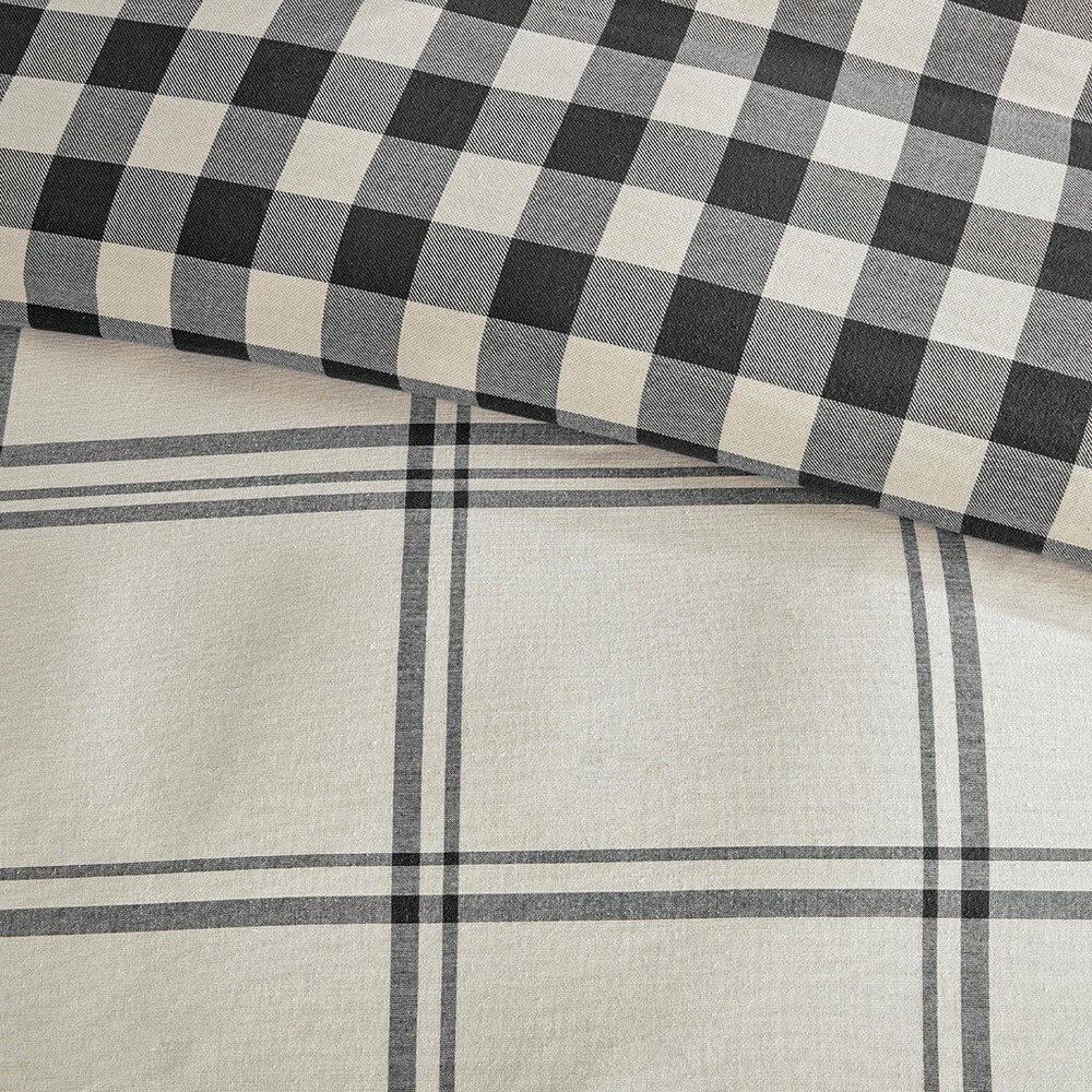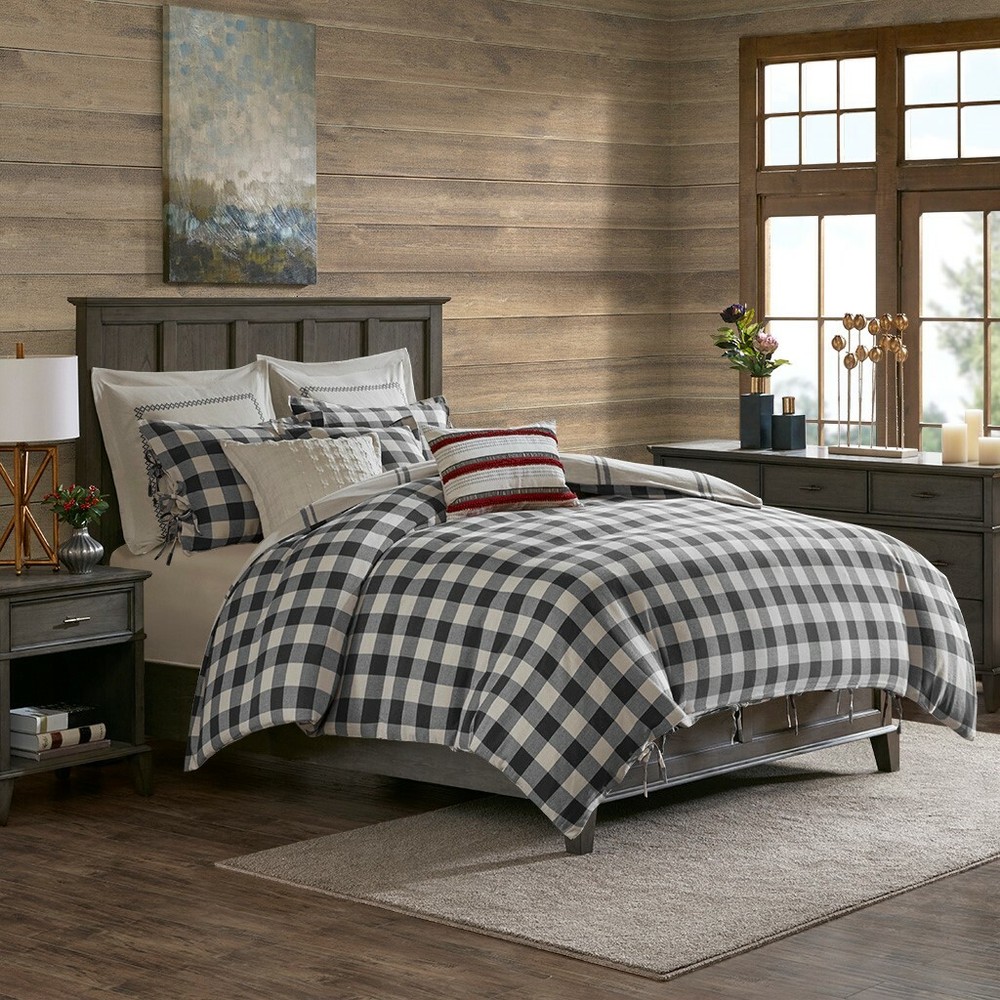 Farmhouse Plaid 9pc Comforter Set - KING Product Description: The 100% cotton duvet-style comforter displays a yarn dyed grey plaid pattern on a light taupe background that reverses to a buffalo check pattern for a charming farmhouse look. Fabric ties and buttons inside the duvet help secure it to the comforter fill insert (included). Matching shams have the same reversible pattern as the comforter. Two Euro shams are framed in a cross-stitch pattern with fabric ties on the reverse (shown against the headboard). Three decorative pillows, in complementary hues, complete the rustic aesthetic. Incredibly soft and warm, this cotton duvet-style comforter set is machine washable. **NOTE: THIS IS A BRAND NEW, NEVER USED OUT-OF-THE-BOX ITEM PURCHASED DIRECTLY FROM THE MANUFACTURER. ALL MANUFACTURER'S TAGS STILL ATTACHED. THE SET IS MISSING THE ORIGINAL RETAIL PLASTIC ZIPPERED PACKAGING THAT BROKE DURING TRANSIT AND NOT USABLE. GREAT VALUE - NORMALLY SELLS FOR $400 What's in the Set: Duvet Comforter Cover + Fill insert + 2 Shams + 2 Euro Shams + 3 Accent Pillows (see below for sizes) Style: Farmhouse Color: Grey, Taupe, Black, Red Cover: 100% Cotton Fill material: Polyester Care instructions: Machine washable Dimensions: Duvet Comforter Cover: King - 110"W x 96"L inches Duvet Poly Insert: King size King Shams (two): 20 x 36 inches Euro Shams (two): 26 x 26 inches Accent Pillows (three): 22" sq. , 20" sq., 14x20" ~~~~~~~~~~~~~~~~~~~~~~~~~~~~ ~~~~~~~~~~~~~~~~~~~~~~~~~~~~ Returns or Exchanges Please see the Shipping Tab above Shipping Locations: Shipping cost stated is to the 48 contiguous United States. We will gladly ship to Canada, Hawaii, Alaska, Puerto Rico and APO/FPO (Military) addresses, but there may be additional freight charges. Buyers living in these territories must email your zip code BEFORE bidding for a freight quote. Otherwise, we will assume your bid is an acceptance that there will be an additional shipping cost. Buyers are responsible for any and all Customs Fees and/or Duty Fees, or Taxes assessed by their Country.
