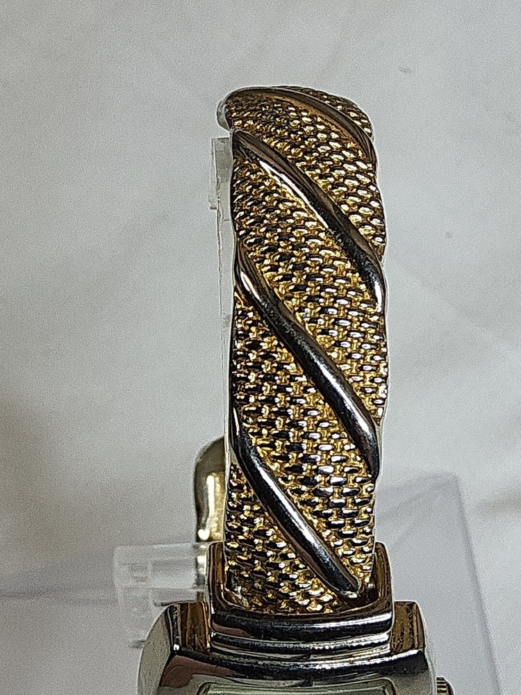 This stunning women's wristwatch from Studio Time is a perfect accessory for any casual outfit. The watch features an analog display with large numerals, making it easy to read. It has a two-tone bangle band made of stainless steel with gold and silver color, adding a touch of elegance to the overall design. The dial color is white, which complements the silver case finish and chrome case color. Additionally, the watch has a quartz movement and a reference number of STD950T-H32. It does not come with the original box or packaging and needs a new battery. The watch is not customized, and it is not vintage. If you are looking for a stylish and affordable wristwatch, this Studio Time model is a great option for you.