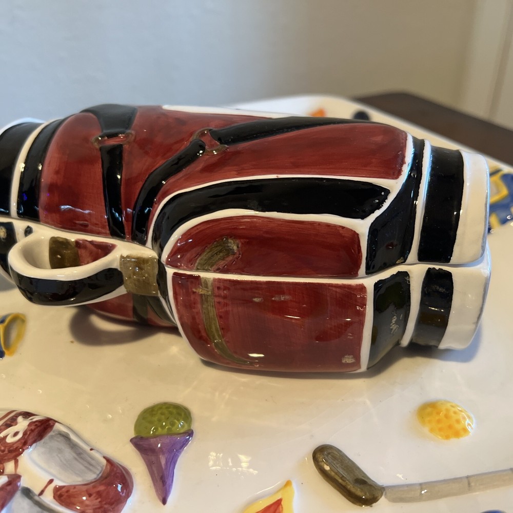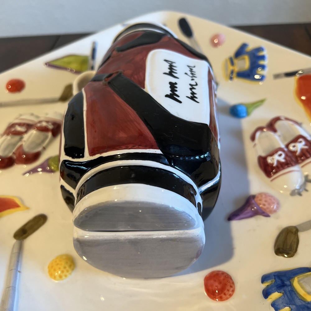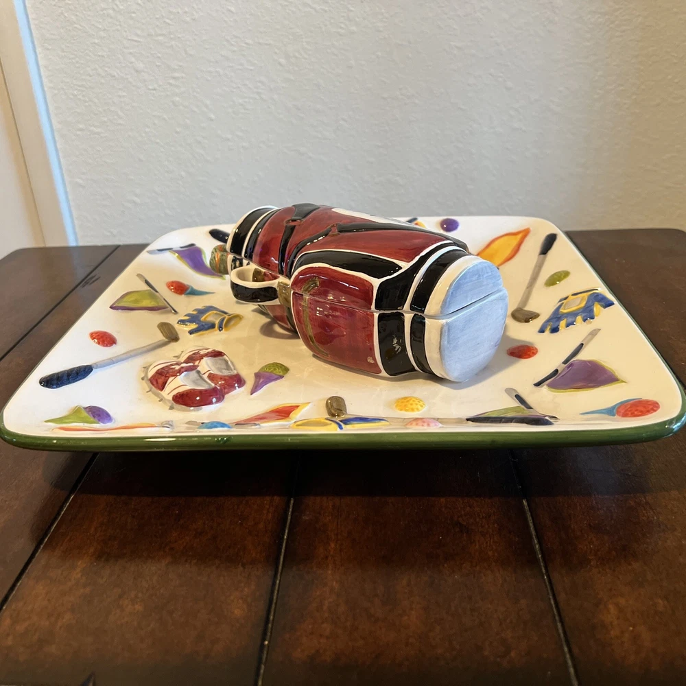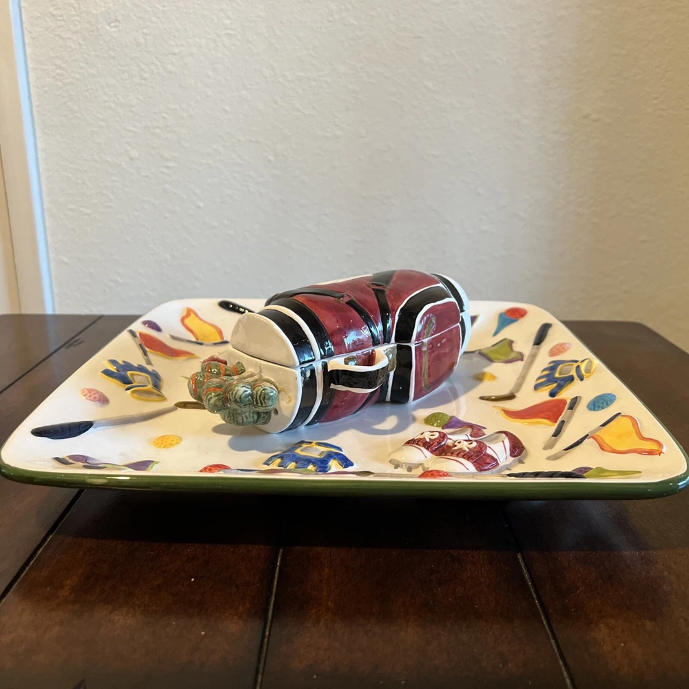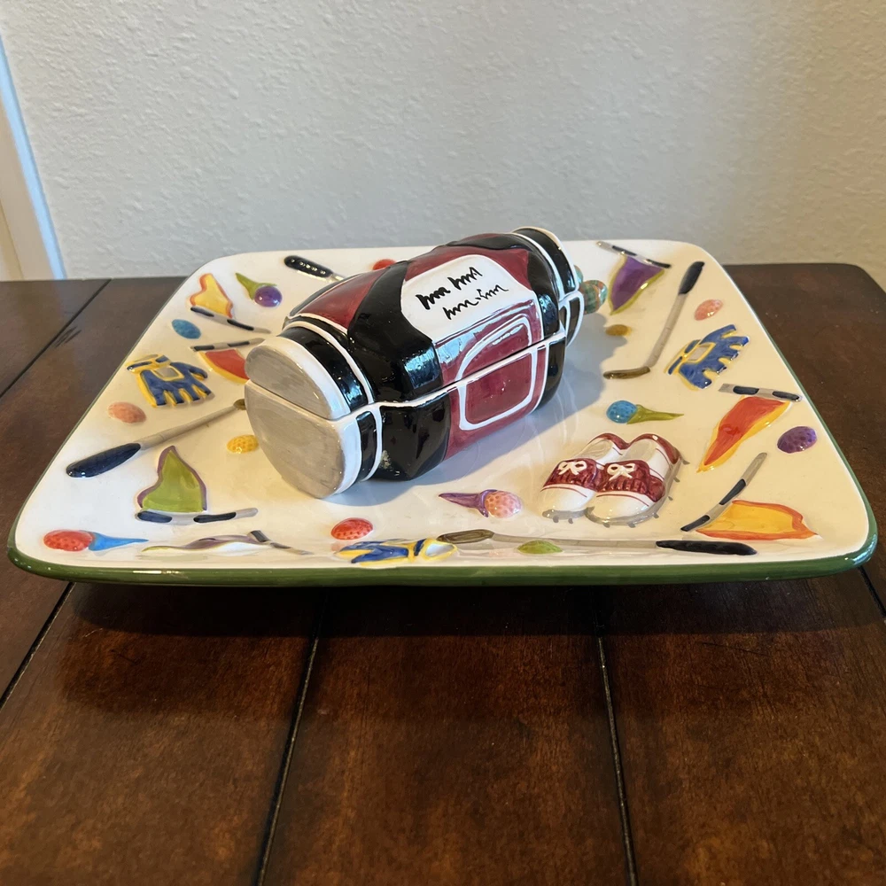 The "WORLD BAZAAR Chip/Dip Ceramic Platter Golf Bag" is a unique serving set designed for Father's Day, Christmas. Birthday or any occasion with a golf themed person in mind. The platter, measuring 13" x 13", features a square shape with a glossy finish and a multicolor golf bag design. It includes a divided dip bowl for easy serving and a tray that makes it convenient to fill with snacks. Made of ceramic, this large serving set is perfect for serving chips and dips in a fun and stylish way. Please see all pictures prior to purchase. There is some slight grazing but hardly visible. Will try to show in pictures. There are no returns. Thank you for your interest O