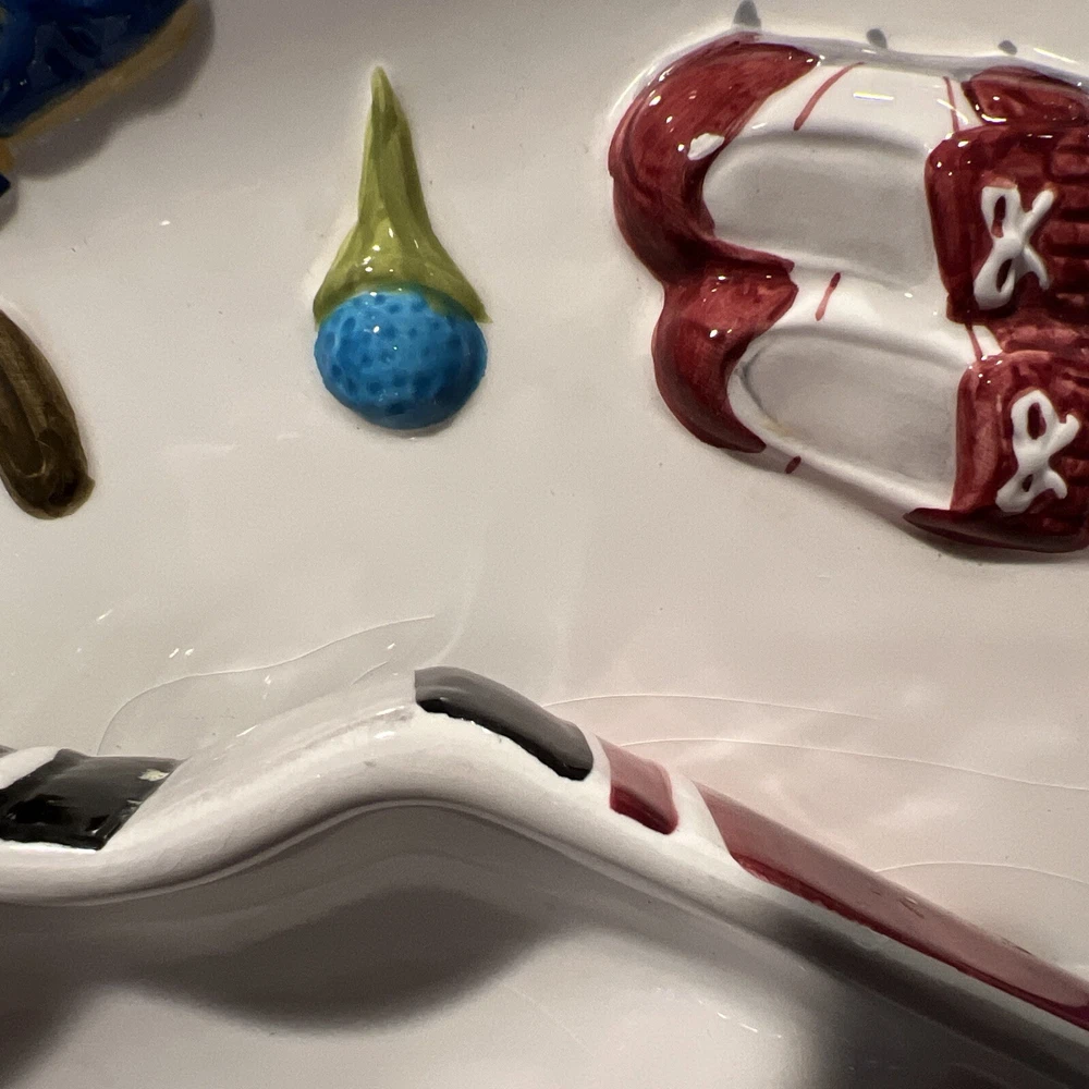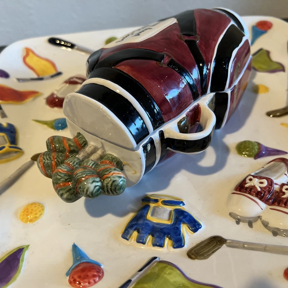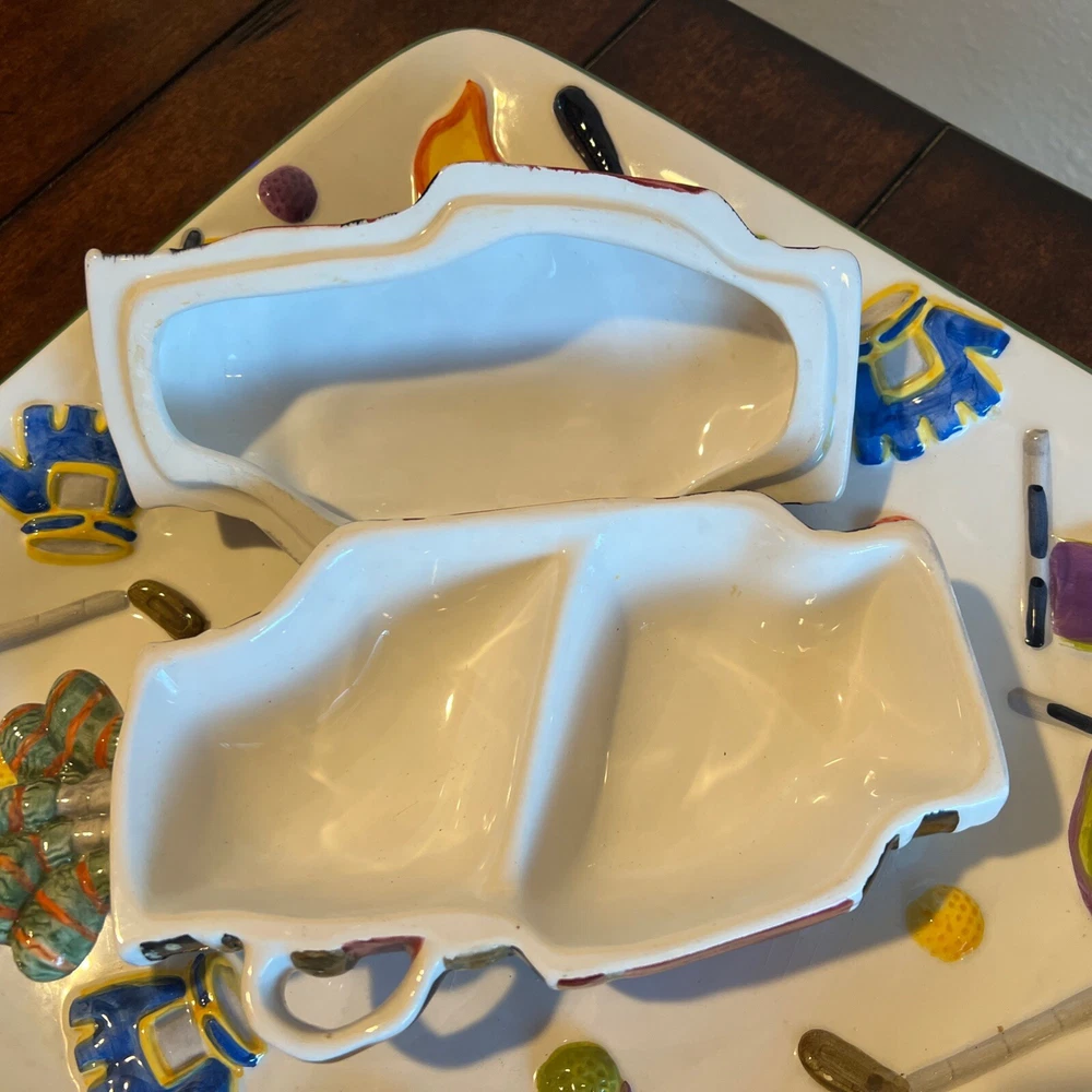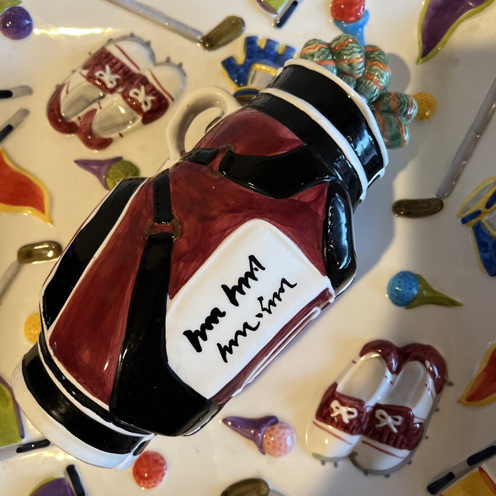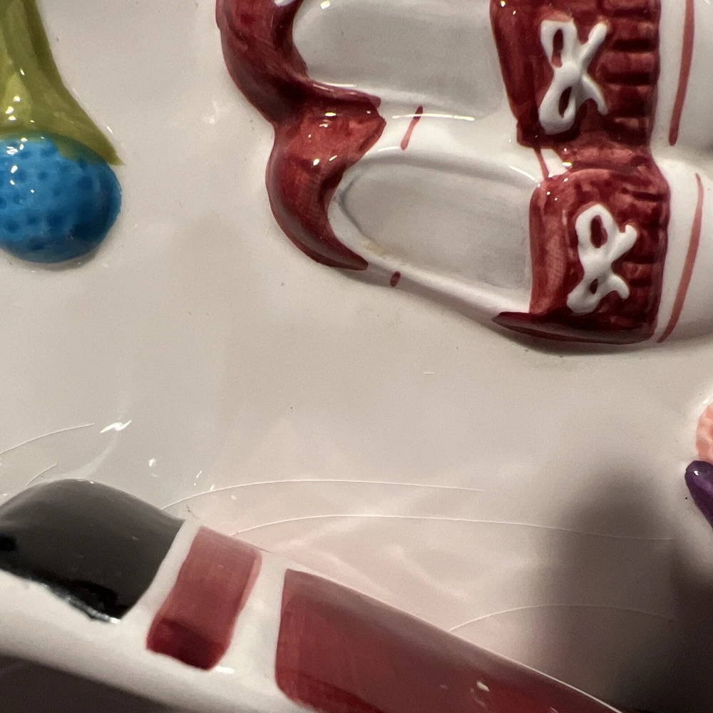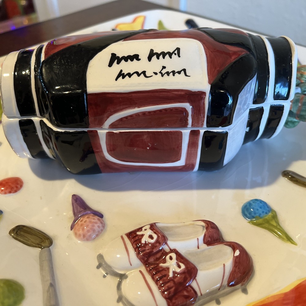 The "WORLD BAZAAR Chip/Dip Ceramic Platter Golf Bag" is a unique serving set designed for Father's Day, Christmas. Birthday or any occasion with a golf themed person in mind. The platter, measuring 13" x 13", features a square shape with a glossy finish and a multicolor golf bag design. It includes a divided dip bowl for easy serving and a tray that makes it convenient to fill with snacks. Made of ceramic, this large serving set is perfect for serving chips and dips in a fun and stylish way. Please see all pictures prior to purchase. There is some slight grazing but hardly visible. Will try to show in pictures. There are no returns. Thank you for your interest O