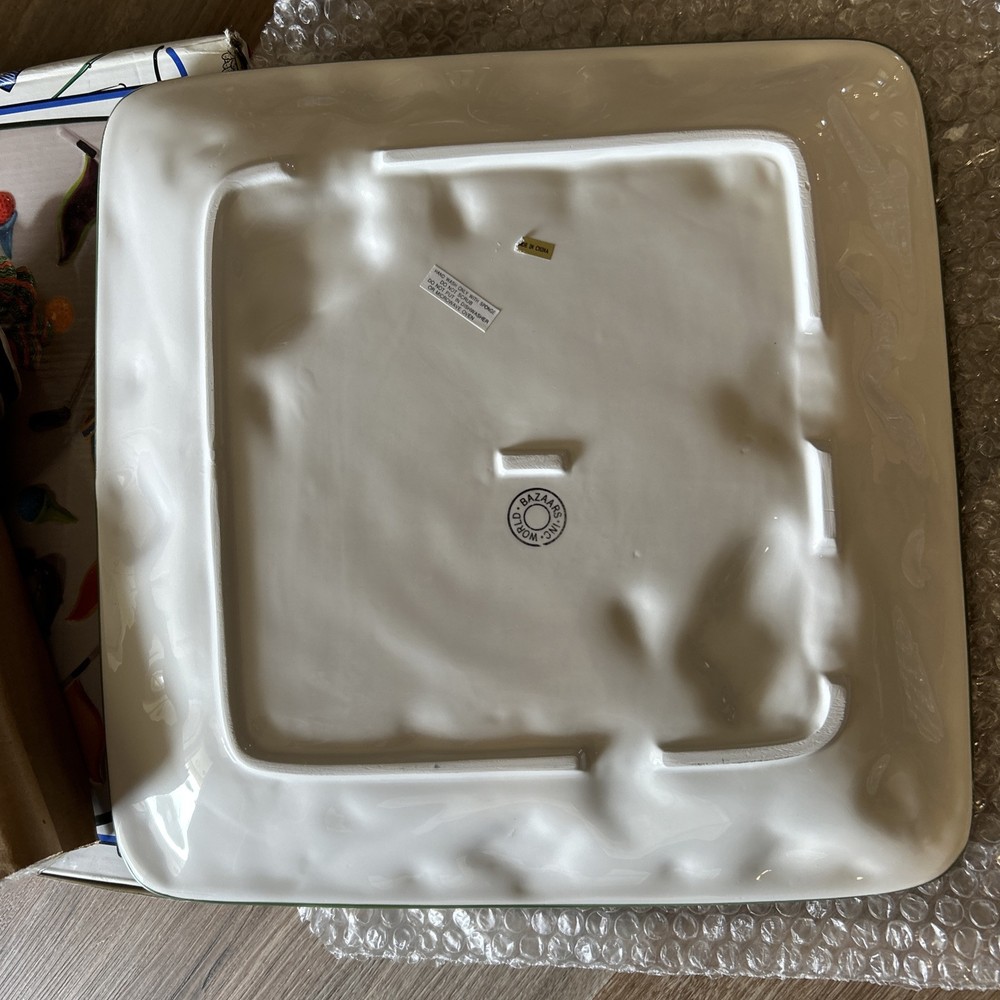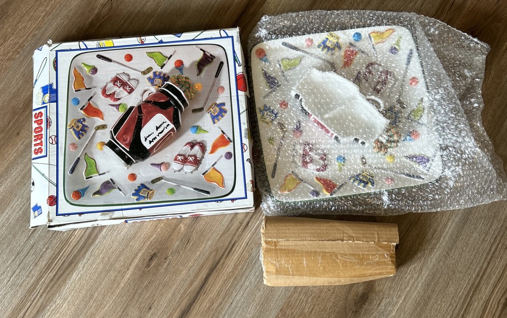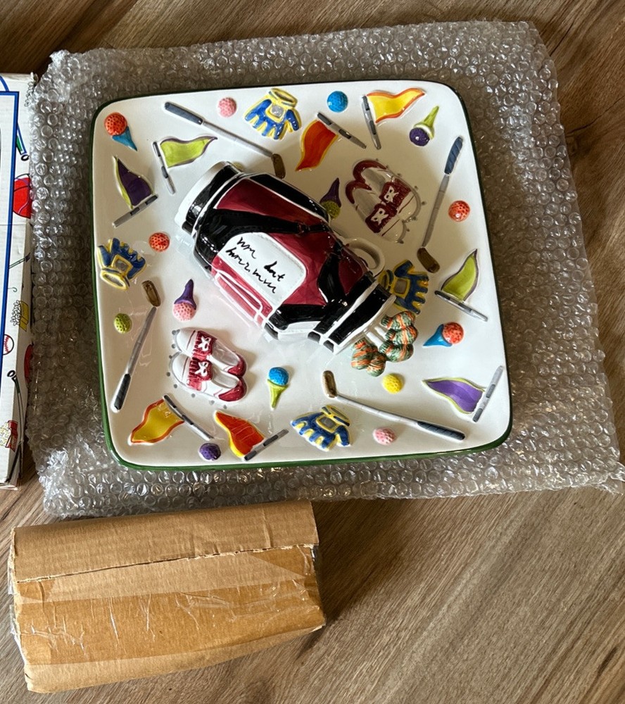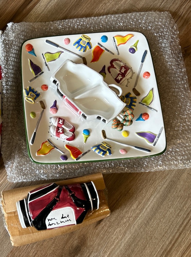 This is a World Bazaar Chip/Dip Ceramic Platter in a Golf Bag design. It comes in a set of 2 compartments, featuring a square shape and a large size. The platter is perfect for serving snacks and dips, with a golf theme ideal for Father's Day or any occasion. The platter is made of ceramic with a glossy finish, and includes a tray and a divided dip bowl for easy filling.