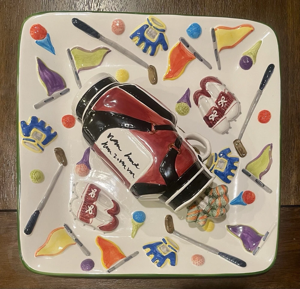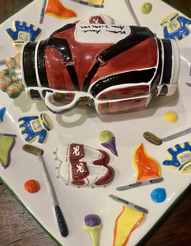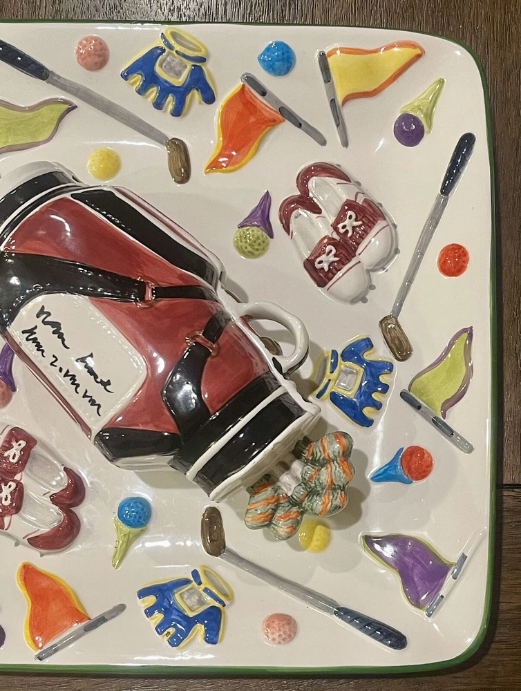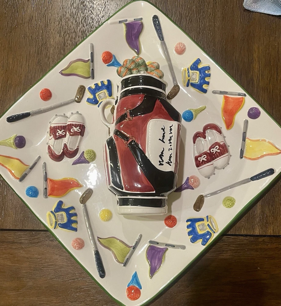 WORLD BAZAAR INC Golf Themed Chip and Dip Ceramic Party Tray Large with Lid This World Bazaar Inc. ceramic serving set is perfect for any golf-themed party. The large square tray features a glossy finish and comes with a lid for easy serving. With two compartments, this set is perfect for holding chips and dip or other small snacks. The multicolor golf-themed pattern adds a fun touch to any party décor. Measuring 13 inches in length and width, this serving set is made of durable ceramic material and is easy to fill. Whether you're hosting a casual get-together or a larger party, this serving set is a must-have. Wolf River Mercantile welcomes all communication and questions from potential buyers to make for a smooth transaction. In order to improve your experience, feel free to reach out via eBay should additional information, questions or assistance is needed. It is our goal and desire to provide 5-star customer service, to include fast shipping and accurate descriptions of the item. While it is never our intention to overlook something, make an error or mistake, please allow us an opportunity to correct it prior to leaving negative feedback or opening a ticket with eBay . Great customer service is of the utmost importance to us! SHIPPING: We are more than happy to combine shipping with items purchased and paid for on the same day. Orders are always shipped out within one business day, unless we are on published time away. Often times shipping will occur the same day. Please note all communications will only be done through the eBay platform. RETURNS: a generous 30-day return policy for items not as described or non-working unless otherwise described in the listing, so you can shop with the utmost confidence. Items are packaged carefully, so if an item is damaged during shipping and delivery, buyer will need to file a claim with the carrier. Authorized returns must be returned with all the same packaging and original box. Seller to pay return shipping for authorized domestic returns. Customer to pay return shipping for any authorized returns from international customers, to include Hawaii, Alaska and Guam. International and Non-Domestic Buyers: shipping will be handled through the eBay Global Shipping Program. Import duties, taxes and charges are not included in the item price or shipping cost. These charges are the buyer's responsibility. Please check with your country's customs office to determine what these additional costs will be prior to bidding or buying. We also do not ship to PO Boxes. As a Female Menominee Native American small business owner, Waewaenen (Wah-way-en-en) Thank You for supporting Wolf River Mercantile ~