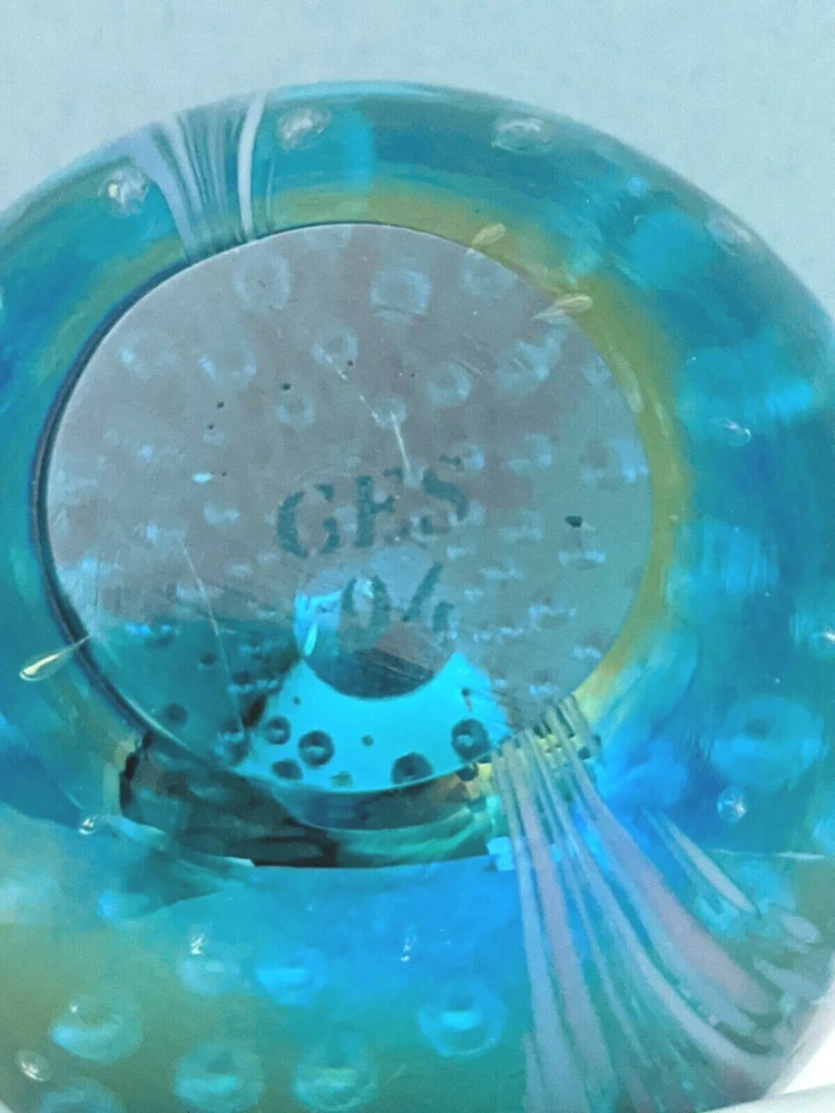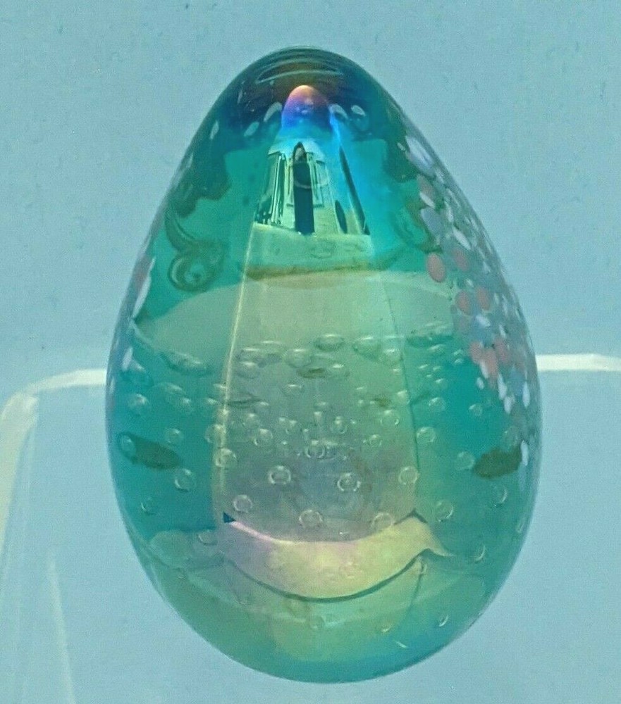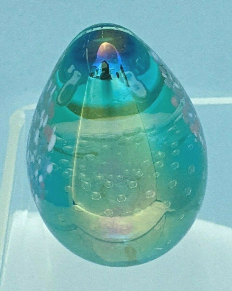 Vintage Glass Eye Studio Signed GES 94 Signed Blue Iridescent Egg Shaped Paperweight 3.25" Tall. Please look at all the photos as they serve as part of the description. We can combine shipping for your other purchases in our store within the week. We cannot combine shipping from one week to another. An additional $10.00 shipping will be levied for every item after the 1st purchase. We currently do not offer local pick up. International buyers outside Canada and the U.S. are welcome. Please ask for shipping before bidding as the shipping charge is varied from place to place. Please wait for my invoice before making your payment. We tried our best to satisfy our customers, if you are not happy with your purchase, please send us a message before leaving a neutral or negative feedback, we will work with you to address the issue. Thanks for your understanding. Happy shopping! Please check our other listing : " NINA RICCI ", " D'ORLAN " earrings & " Shelly, Royal Albert & Aynsley" cup & saucers and " Omega ", " Longines ", " Seiko " and other watches in our "Laipique" store.