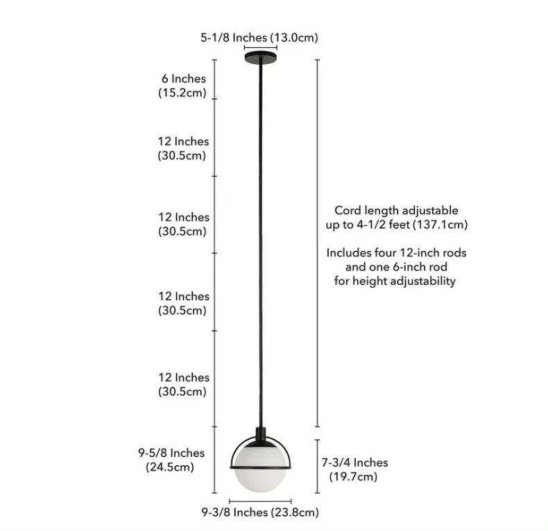 Selling a brand new Wade Logan 1 Light Pendant Lamp In Blackened Bronze. This is an open box item but the actual light has never been open and is in brand new condition. Adjustable Hanging Length Max Height 64.6'' Min Height 10.6'' Other Dimensions Canopy 1'' H x 5.13'' W x 5.13'' D Fixture 9.63'' H x 9.25'' W x 9.25'' D Shade 7.75'' H x 9.4'' W x 9.4'' D Overall Product Weight 4.12 lb. Overall Height (Hanging) 110'' Fixture Cord Length 6'' Description Product Details Number of Lights: 1 Fixture Design: Single Primary Material: Metal Shade Included Shade Material: Glass