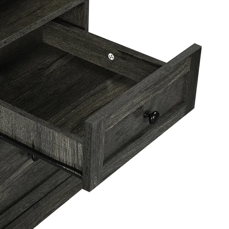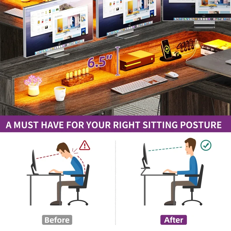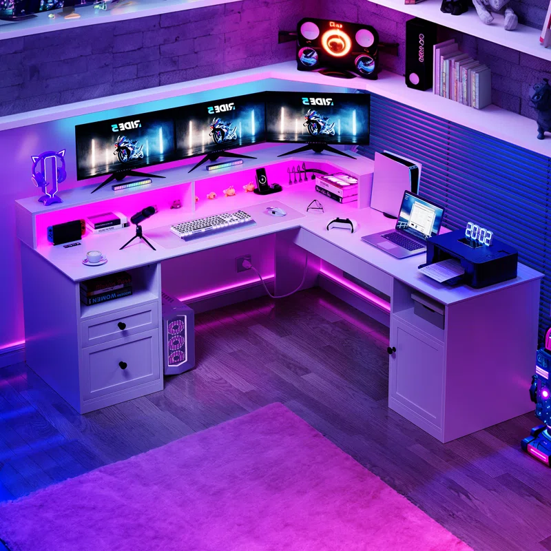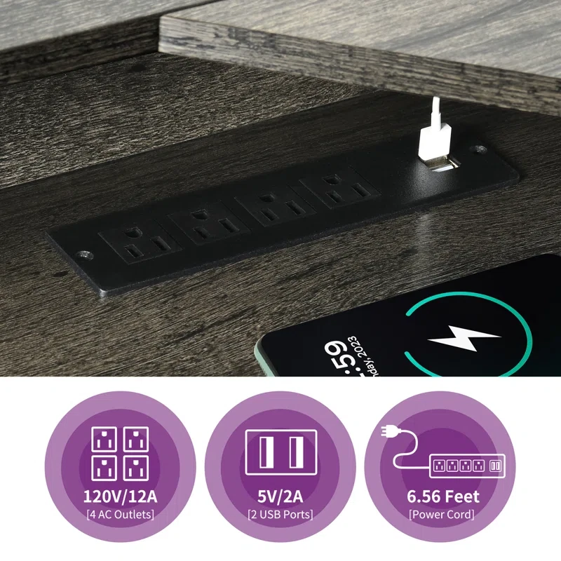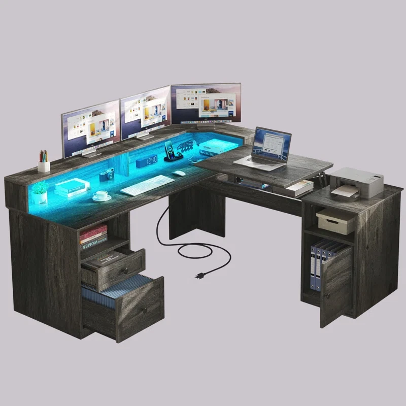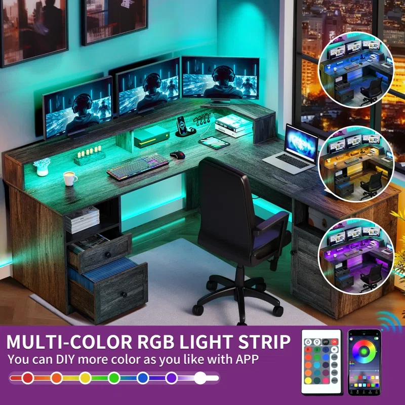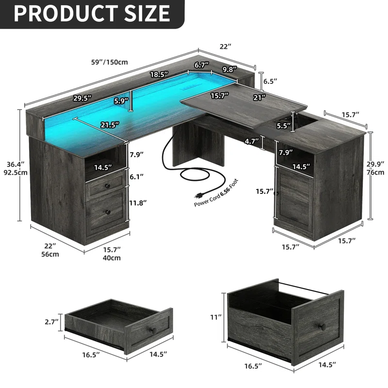 This Wade Logan 59'' L-Shaped Adjustable Desk is the perfect addition to any home office, bedroom, or study room, offering a blend of versatility and functionality. Designed to optimize your workspace, this desk features a spacious surface that comfortably accommodates your laptop and monitor, while ample storage options, including two drawers and two exterior shelves, ensure that your essentials are organized and easily accessible. Crafted from durable engineered wood with a water-resistant finish, this desk is built to withstand everyday use, making it an ideal choice for both professionals and gamers alike. Equipped with thoughtful features, this desk is designed with convenience in mind. The lift-top mechanism allows for easy adjustment to your preferred height, while the built-in monitor stand promotes better ergonomics. Connectivity is made simple with four power outlets and two USB charging ports, allowing you to power multiple devices simultaneously. Additionally, the integrated LED lighting not only enhances the aesthetic appeal but also provides functional illumination, making it an excellent choice for late-night work or gaming sessions. - L-shaped design provides ample workspace and fits perfectly in corners - Adjustable height feature for personalized comfort - Four built-in power outlets and two USB charging ports for easy device connectivity - Integrated LED lights for enhanced visibility and ambiance - Water-resistant finish ensures durability and easy maintenance
