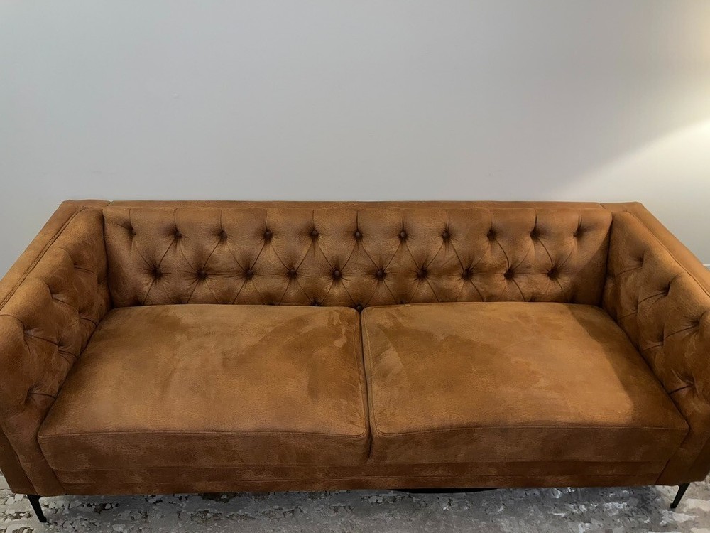 Wade Logan Brinna Modern Camel Sofa Description: Modern and stylish, this Wade Logan Brinna Camel Sofa features a sleek button-tufted design with durable metal legs, adding elegance to any living room. Upholstered in high-quality polyester fabric, this sofa offers both comfort and style with its flared arms and tufted back. Key Features: Frame Material: Sturdy metal frame for long-lasting durability. Upholstery: Soft camel-colored polyester fabric, perfect for a modern aesthetic. Back Style: Tufted back with button detailing. Dimensions: Approx. 84" (L) x 33" (W) x 34" (H). Seating Capacity: Seats up to 3 people comfortably. Condition: Gently used, no visible wear or damage. This sofa is a perfect addition to a contemporary or mid-century modern home. Pickup available in Providence, RI. Price negotiable for serious buyers.