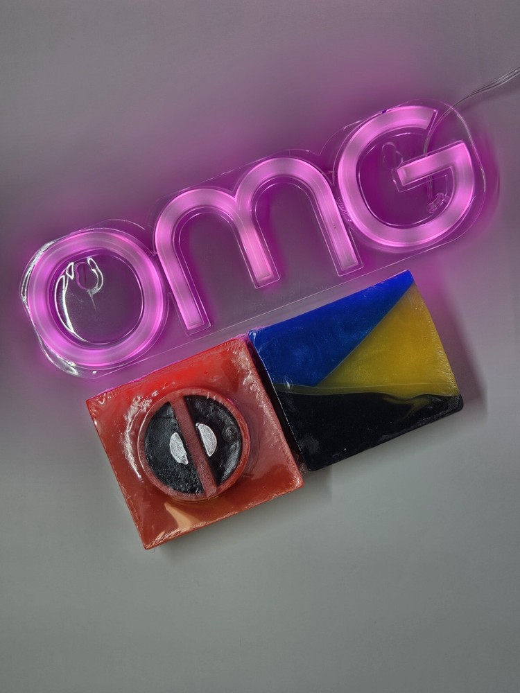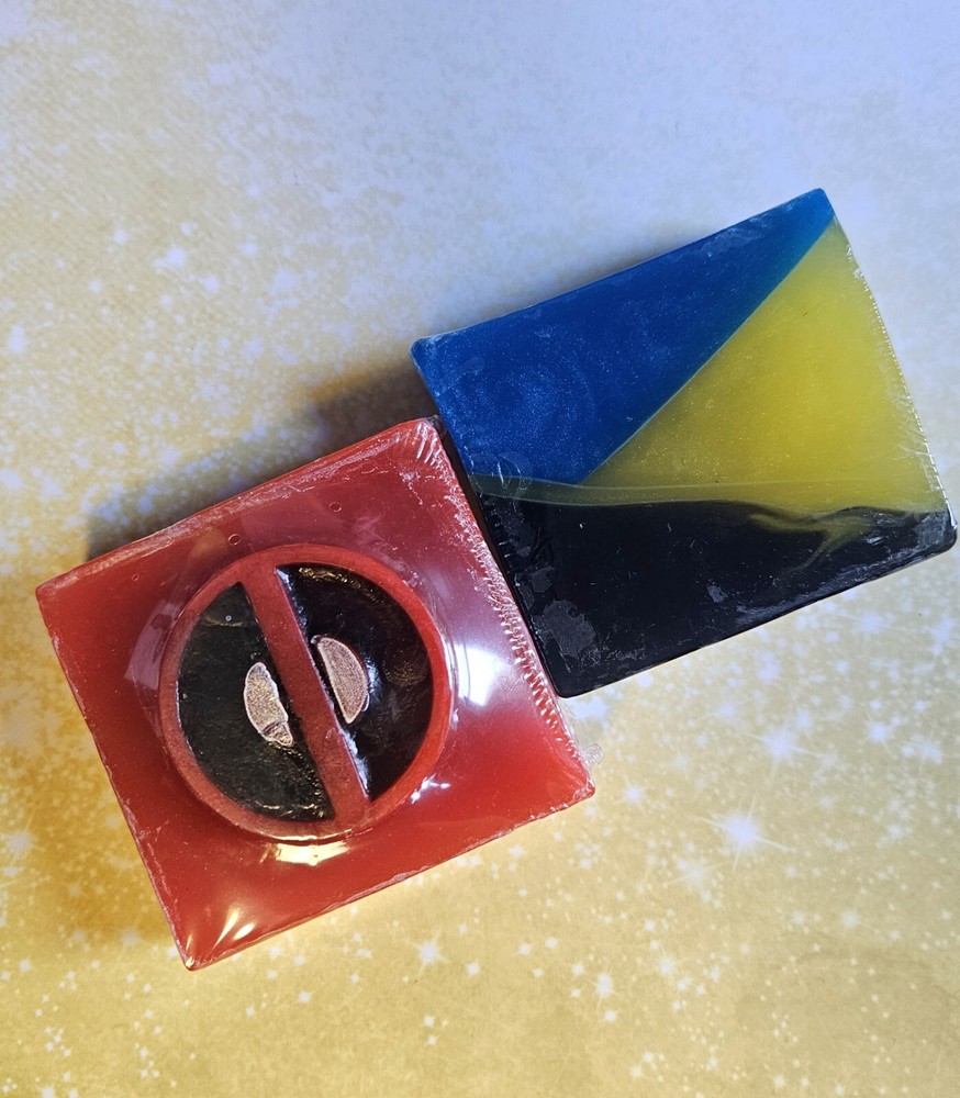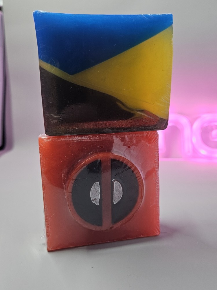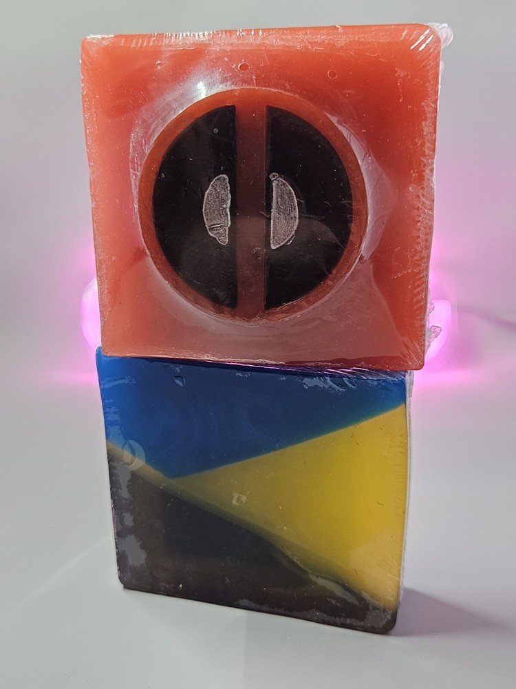 Just in time for the launch of the Deadpool movie is this fantastic set of soaps. The Wolverine inspired soap smells exactly as you think he would - cedar, leather, tobacco, and bourbon. The Deadpool inspired soap is all things fruity and fun. This sweet scent has notes of melon, pineapple, green apple and cherry. Hand made, approximately 3.75 ounces each Subtle variations in size and color may occur as each bar is individually hand made. This listing is for 2 bars of soap, one red and black Wade bar and one blue, yellow and black Logan bar. Ingredients: coconut oil, sustainable palm oil, olive oil, hemp seed oil, safflower oil, glycerin, purified water, sodium hydroxide, sorbitol, propylene glycol, survival, oat protein, activated charcoal, mica, fragrance, biodegradable eco-glitter