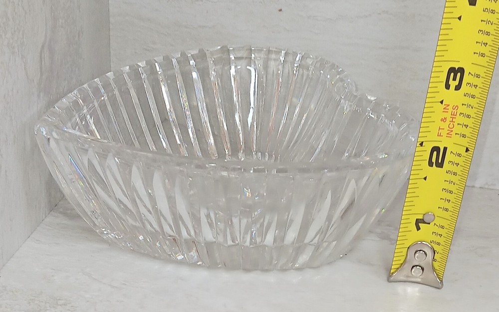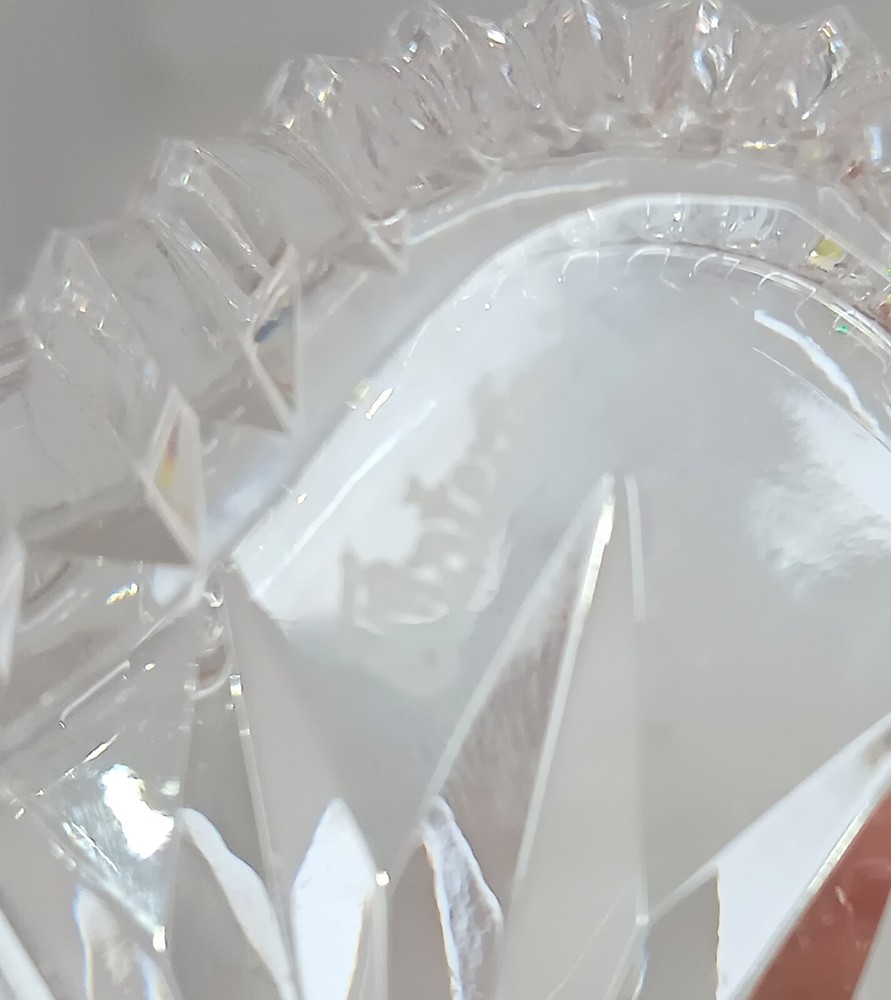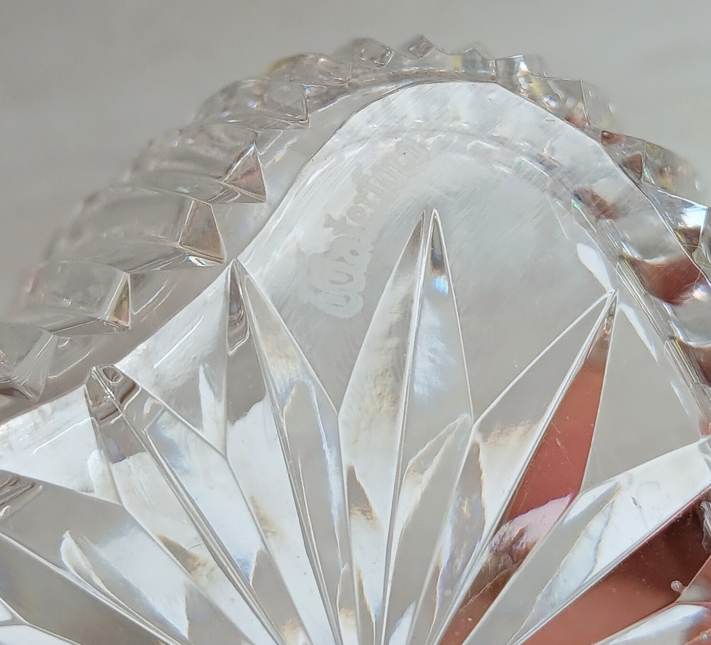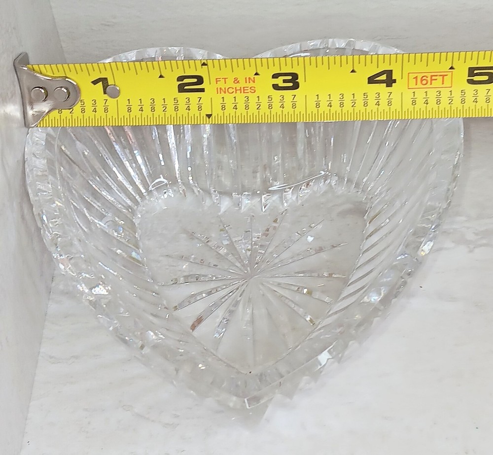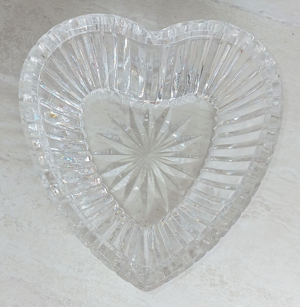 This is a heart-shaped candy dish made of crystal from Waterford, Ireland. It is an original Waterford Crystal product, produced in the 2000s using studio crafting techniques. The dish is stamped and etched with the Waterford Crystal logo. The glossy finish and clear color make it a beautiful addition to any home decor. The dish is perfect for serving candy or as a trinket dish.