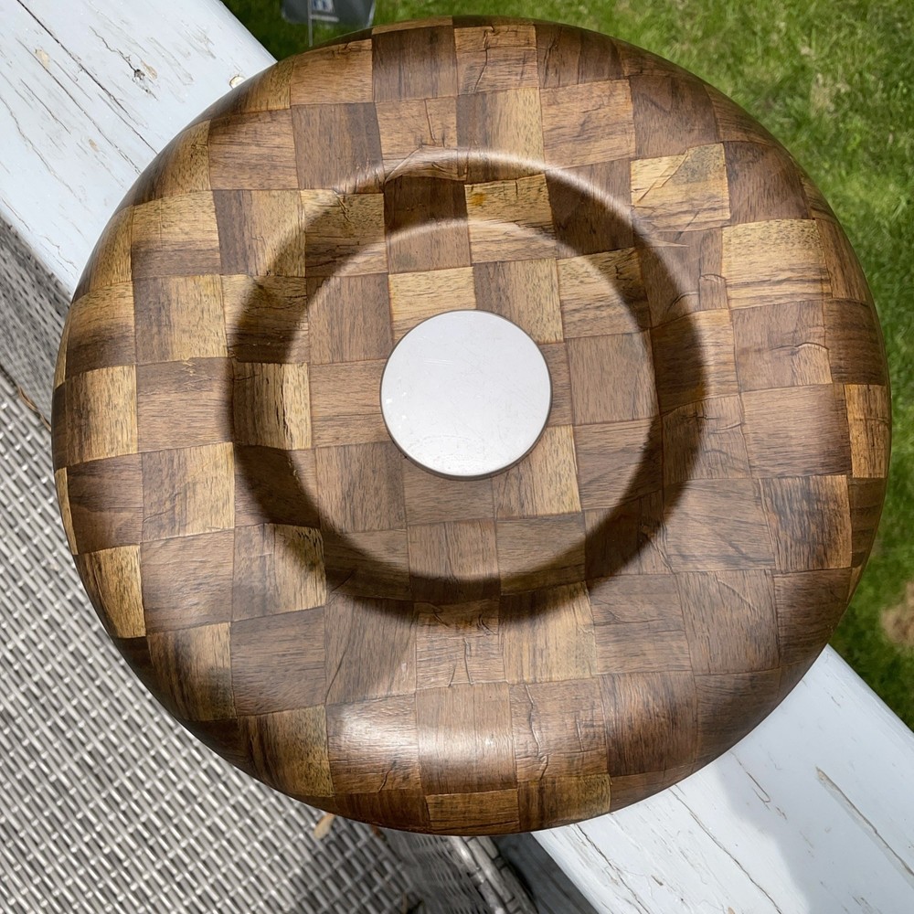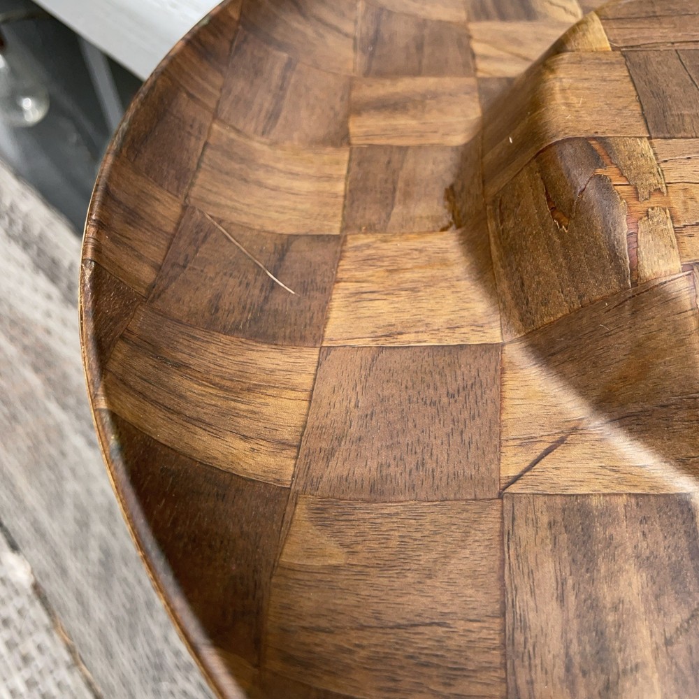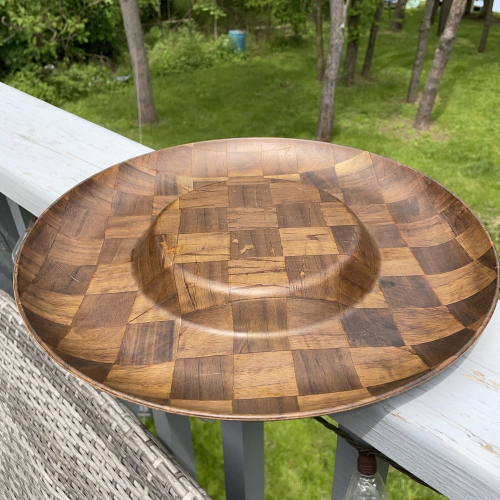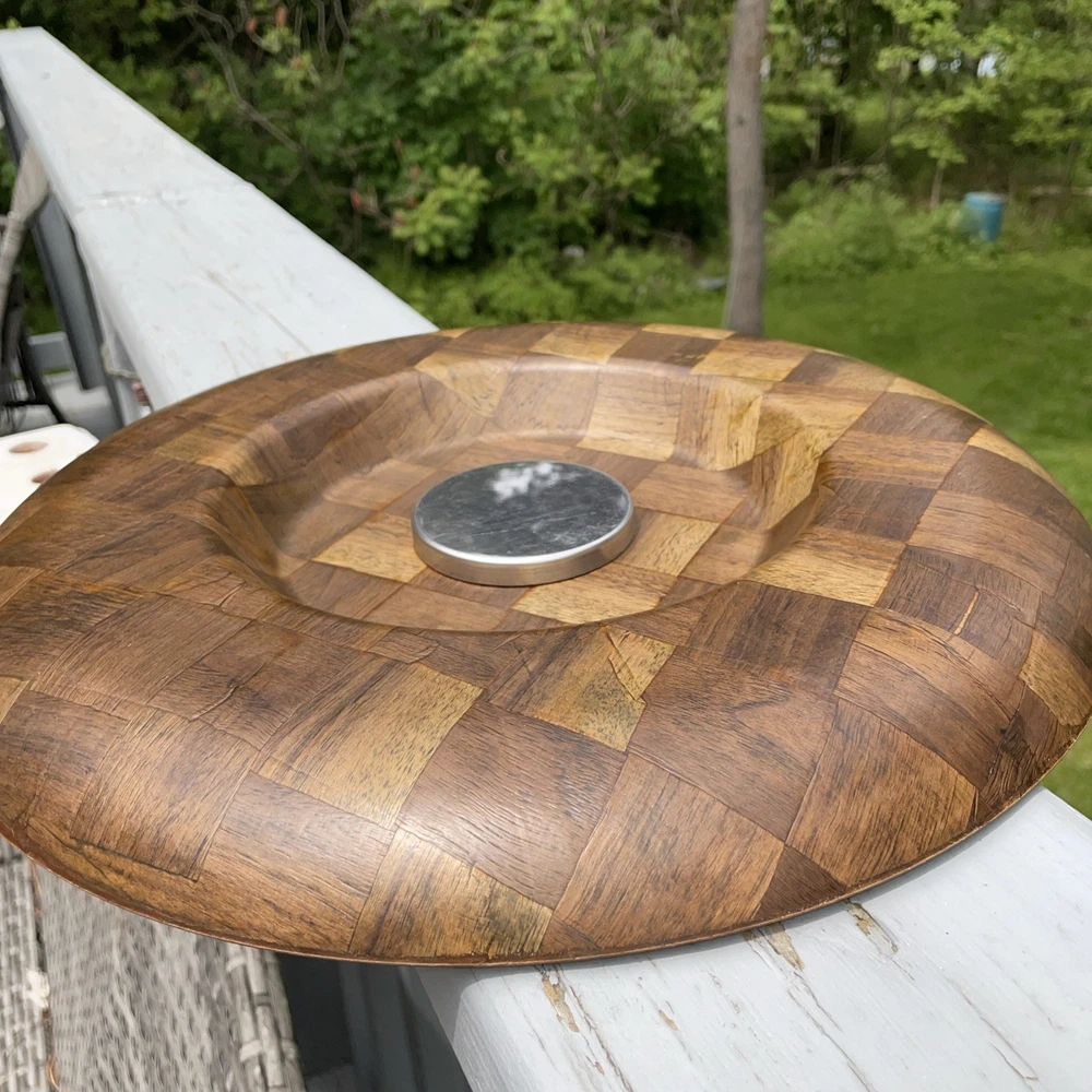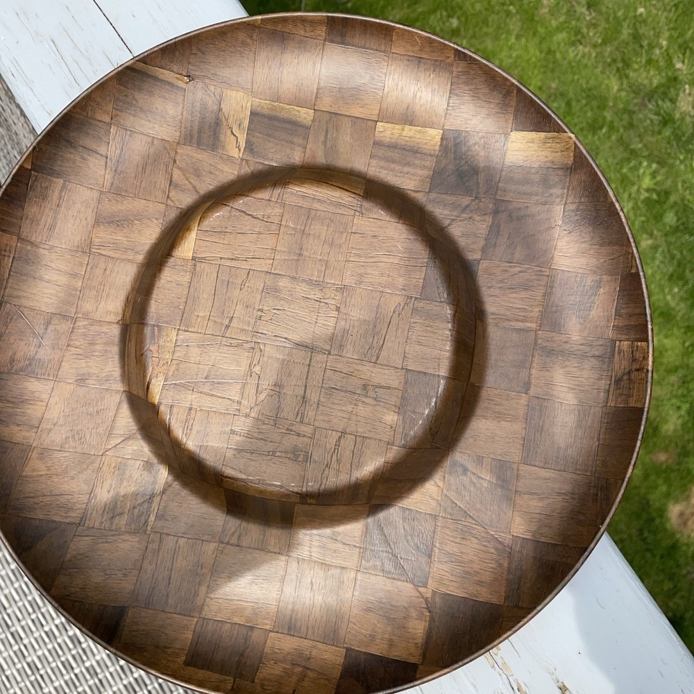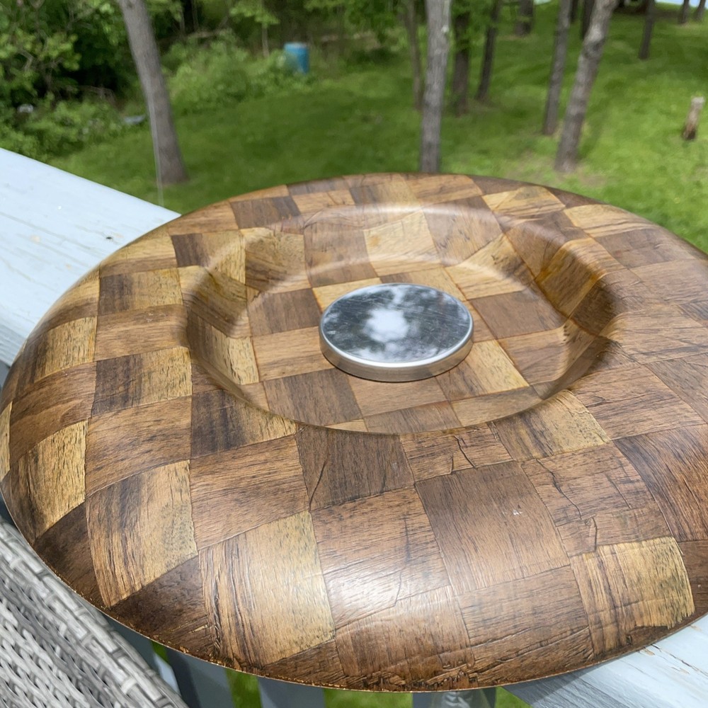 The Weavewood Chip & Dip Genuine Walnut Mid Century Magnetic Platter is a large, round serving tray made of walnut with a wood finished brown color. The platter features a woven pattern and is an original piece from the Century brand. This stylish and functional item is perfect for serving chips and dips in a trendy mid-century setting. The magnetic bowl is not included. I would use it upside down. Maybe someone has the bowl and has been on the hunt for this very tray!!