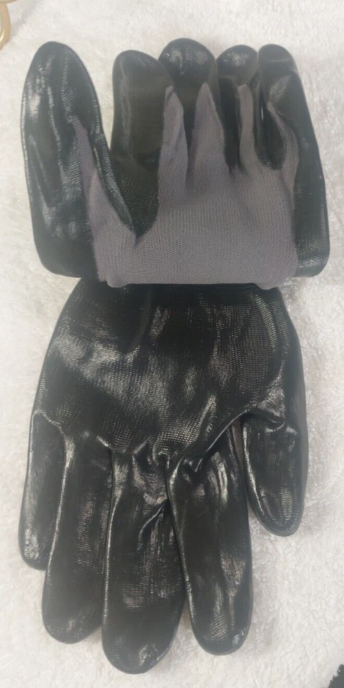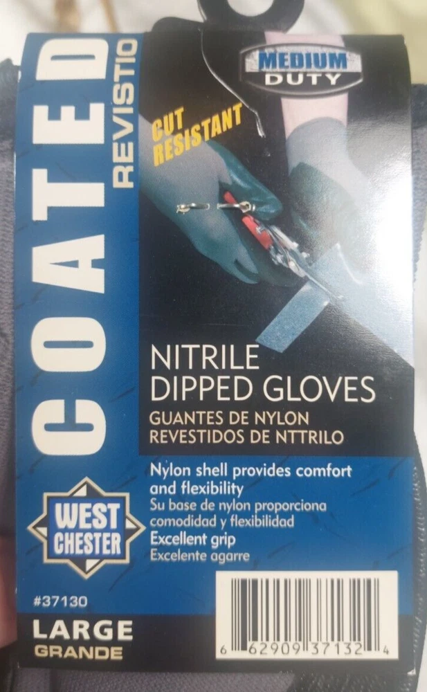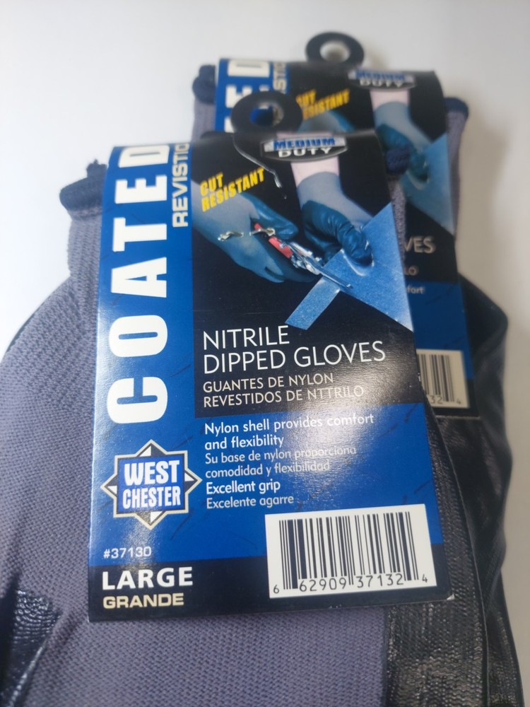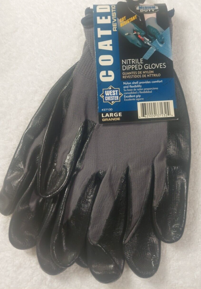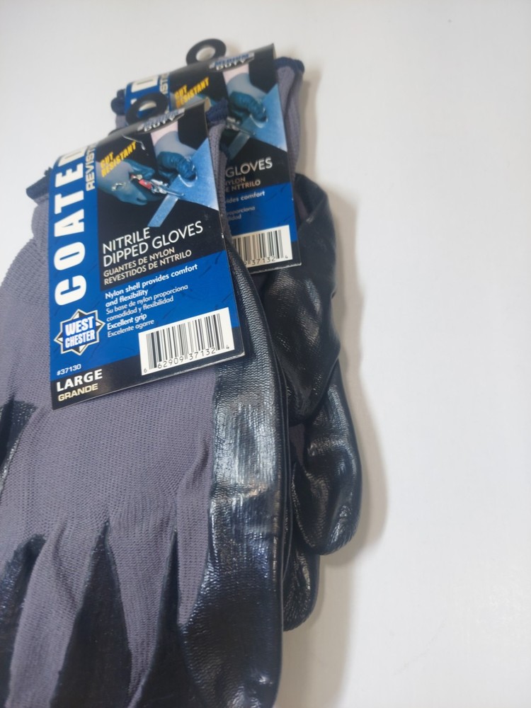 The product is a set of 2 pairs of West Chester nitrile-dipped gloves in size Large. They are designed for medium-duty work and feature a nylon shell for added durability. Made of nitrile rubber, these gloves provide protection against various hazards and are manufactured in the United States. Perfect for tasks requiring hand protection in industrial or maintenance settings. Brand new tags in place. Set of 2 pairs of brand new gloves for one price. All of my items come from family, friends, auctions and estate sales. I try to inspect each one thoroughly for any damage, imperfections and normal wear and tear, and I will be sure to write it in my listing and show pictures as best I can. PLEASE feel free to ask any questions before bidding or buying an item. I am glad to answer any questions prior to purchase. Thank you for taking the time to look.
