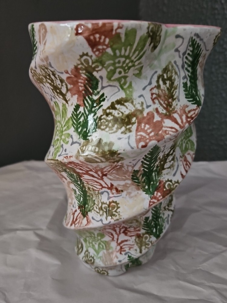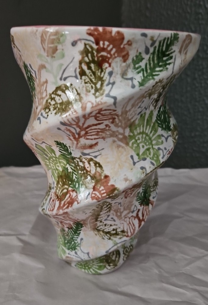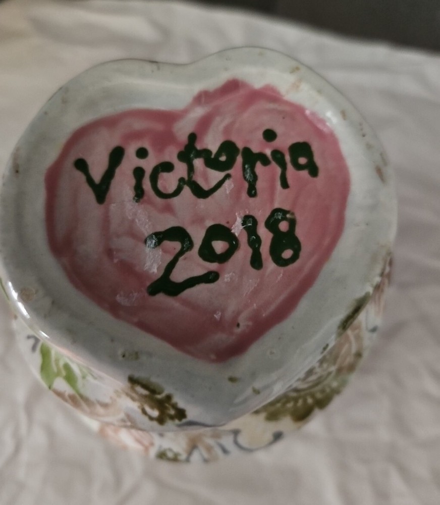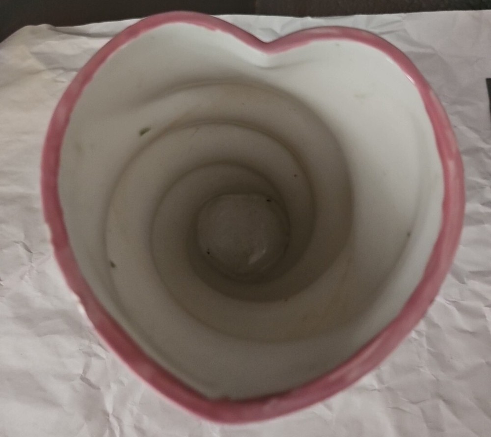 This whimsical heart-shaped ceramic vase is perfect for adding a touch of charm to any room. Measuring 8 inches in height and 5 inches in width, this 2018 piece is hand-painted and signed, making it a truly unique addition to your decor collection. The multicolored abstract pattern and studio-crafted production technique add to its artistic appeal. This original vase is both decorative and functional, ideal for holding your favorite flowers or as a standalone piece. It would make a great Valentine's Day gift or a thoughtful present for any art lover. With its one-of-a-kind design and handmade production, this piece is a true gem.