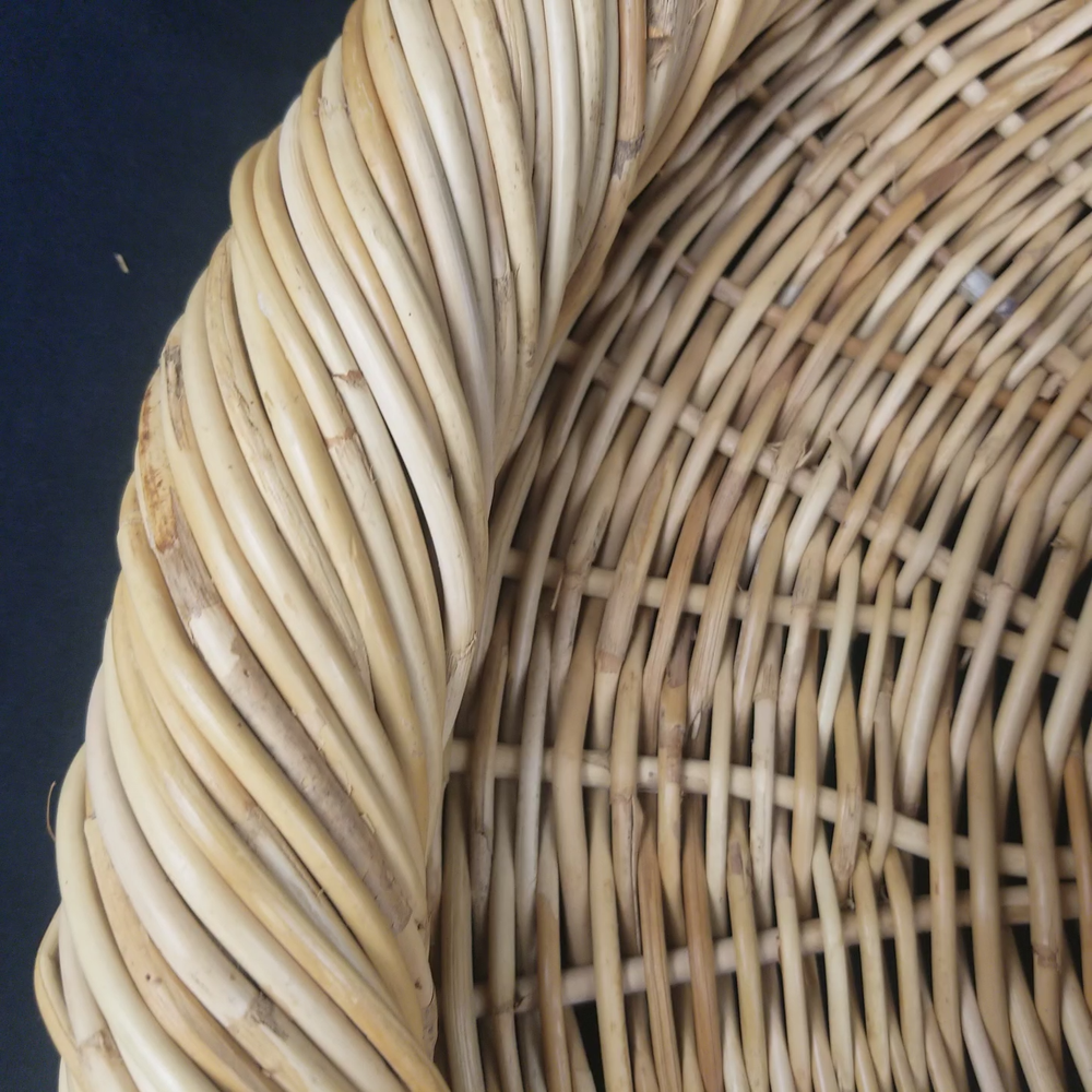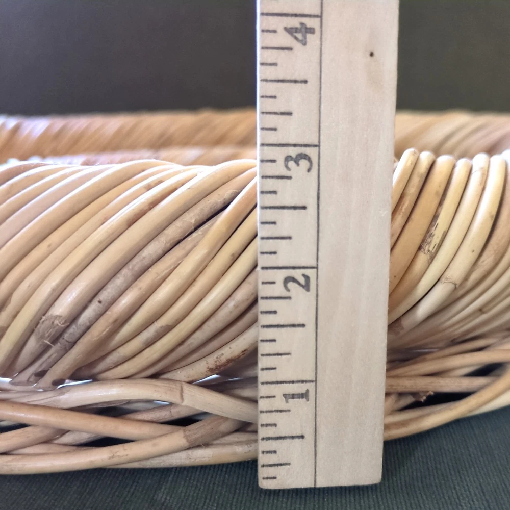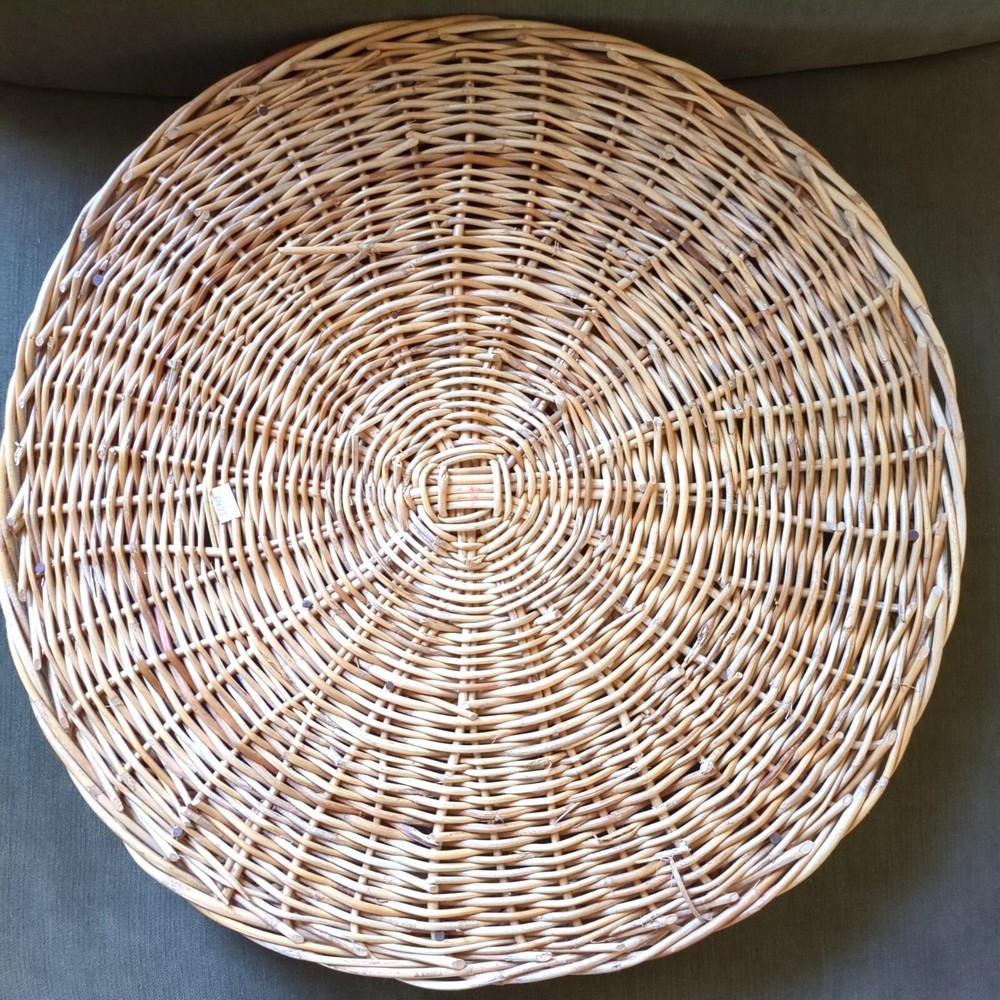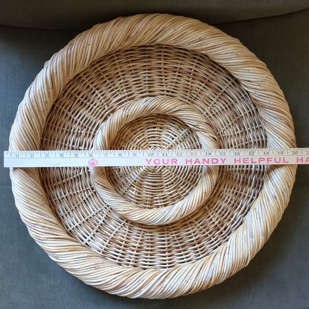 A large 20" diameter round wicker, rattan basket. Looks like it could be a chip and dip set but, could be used for many other things. It's sturdy. Weighs about 3 1/2 lbs. Measurements are approximates only: Entire Diameter: 20 in / 51 cm Center spot diameter: 7 in / 18 cm Height: 3 in / 8 cm Condition: Pre-Owned Good IMPERFECTIONS: The wicker shows signs of various imperfections. Some are frayed. Others stick out. The wicker varies in colors. There are nails periodically holding it together. If you don't see information important to you, please let me know.