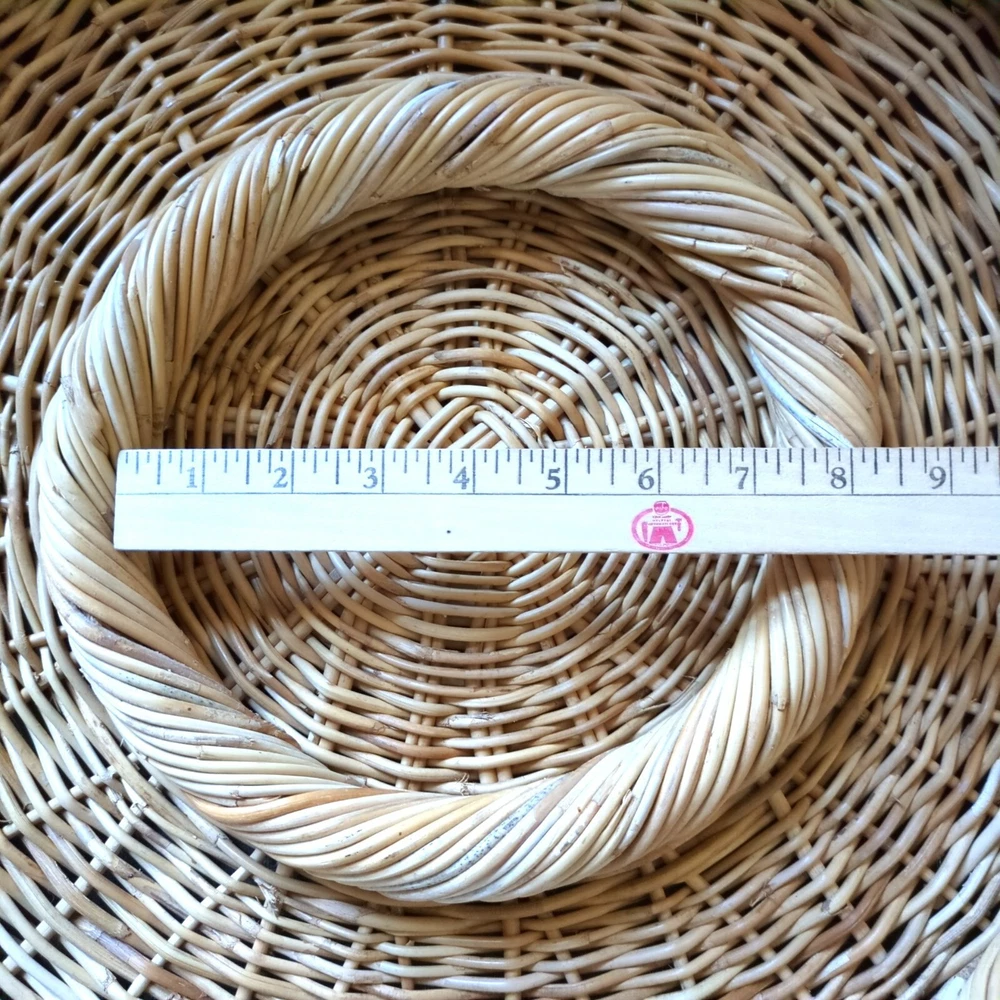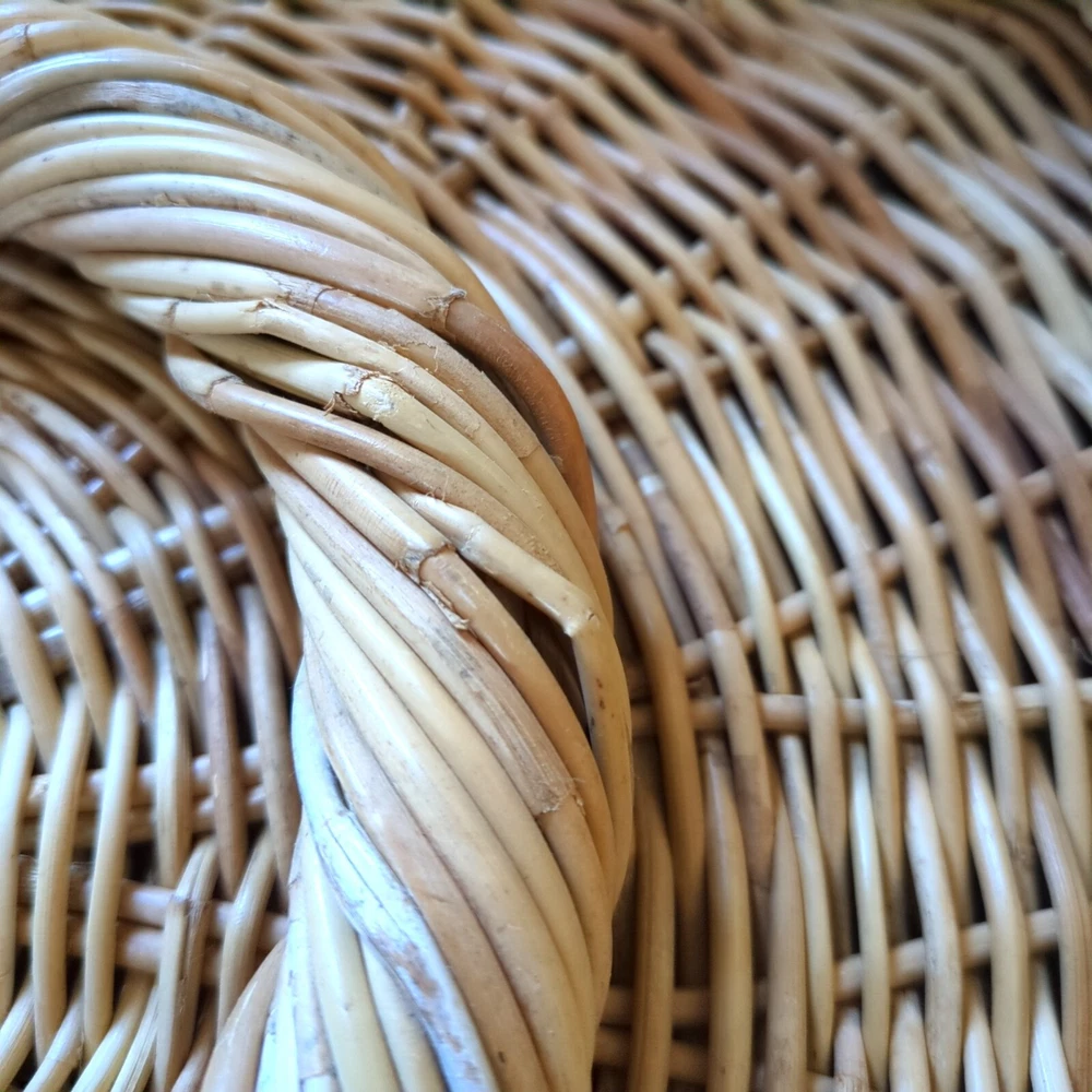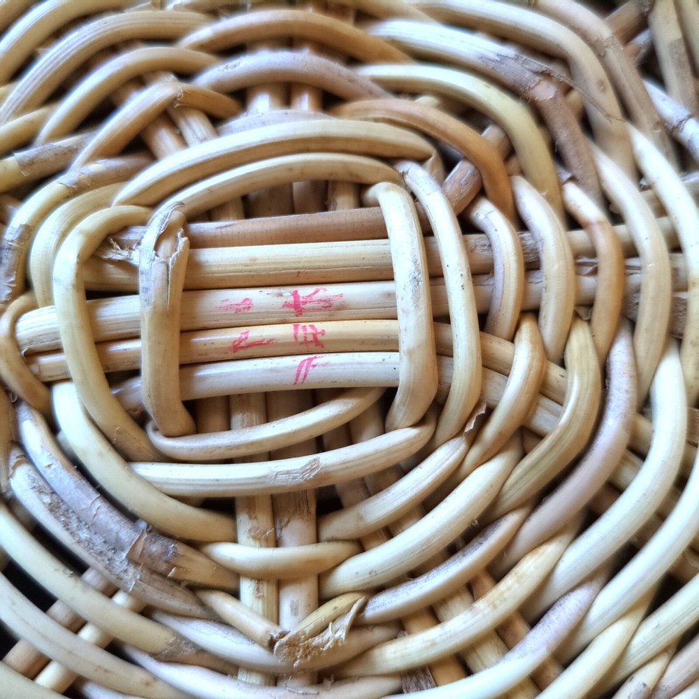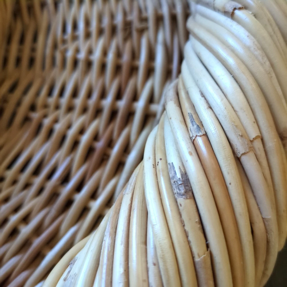 A large 20" diameter round wicker, rattan basket. Looks like it could be a chip and dip set but, could be used for many other things. It's sturdy. Weighs about 3 1/2 lbs. Measurements are approximates only: Entire Diameter: 20 in / 51 cm Center spot diameter: 7 in / 18 cm Height: 3 in / 8 cm Condition: Pre-Owned Good IMPERFECTIONS: The wicker shows signs of various imperfections. Some are frayed. Others stick out. The wicker varies in colors. There are nails periodically holding it together. If you don't see information important to you, please let me know.