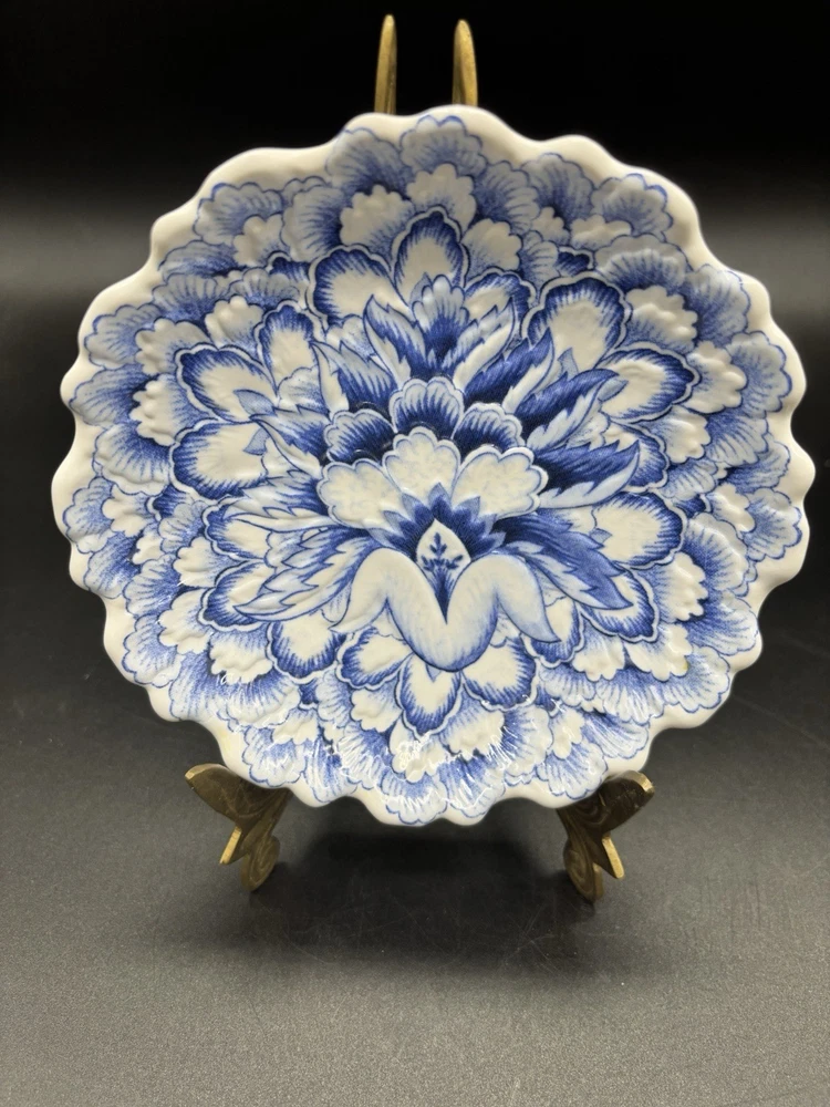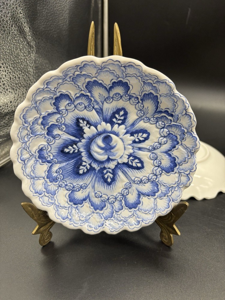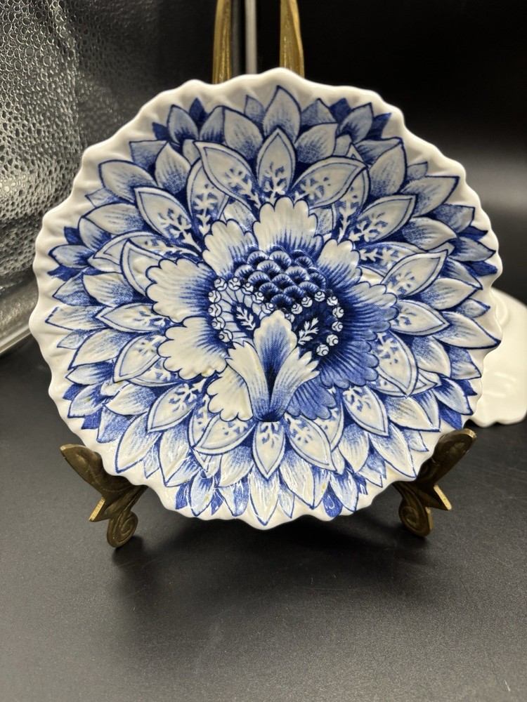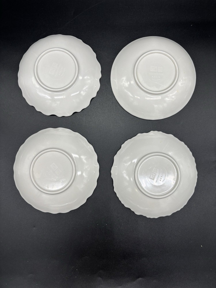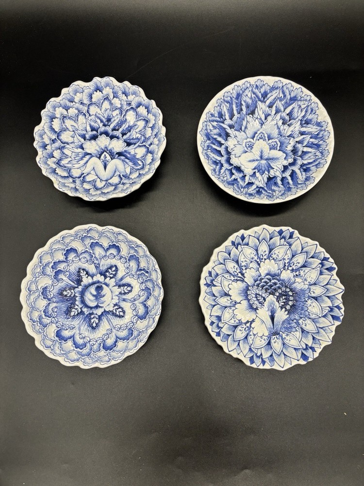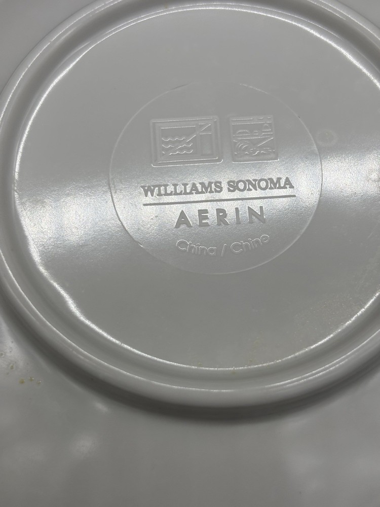 The Williams Sonoma AERIN Fairfield Melamine Large Dip Bowls Set of 4 in blue and white features a floral pattern in a round shape. Made of durable melamine material, these dipping bowls have a 5.5-inch diameter and are part of the Williams Sonoma AERIN Fairfield collection. Perfect for serving dips or snacks, this set of 4 bowls adds a touch of elegance to any dining or entertaining setting. In EUC with no scratches or stains.