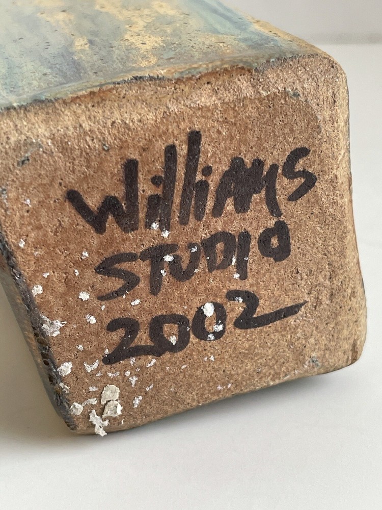 Williams Studio Pottery Tall Vase ~16-1/4” at the highest point 2002. Signed by the artist. Heavy over 3 lbs. Contemporary square base glazed vase by Williams Studio. Signed and dated 2002 at base No chips or cracks Measurements approximately: ~16 1/4” tall ~2 1/2" square at base ~ 4” at the top cross Please see pictures for measurements and condition!