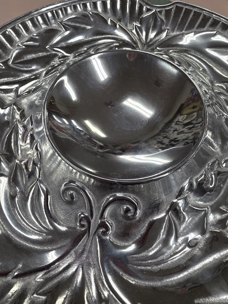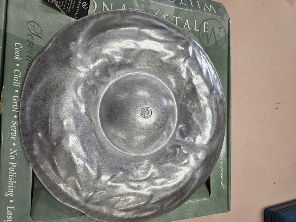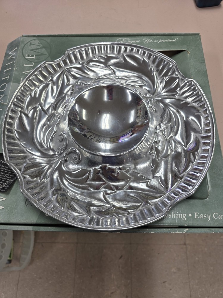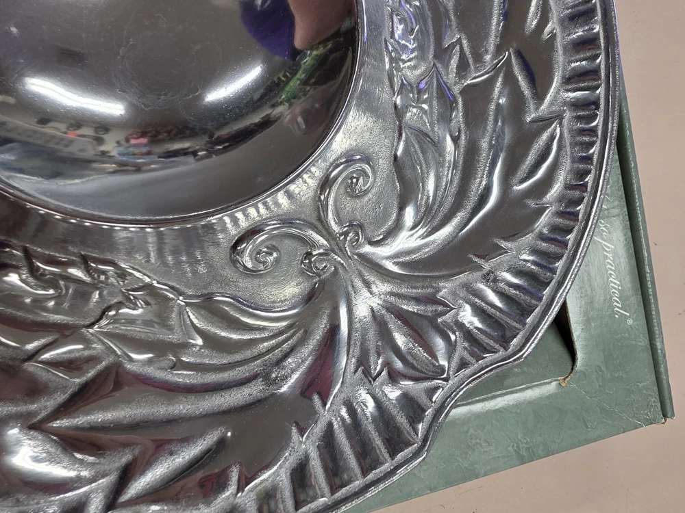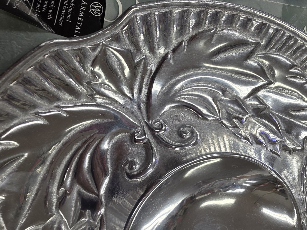 Elevate your hosting elegance with the Wilton Armetale ACANTHUS ACCENT Large Serving Platter, accompanied by a matching Round Dip Tray. Crafted from high-quality pewter, this serving ensemble exudes a timeless charm that complements any table setting. Its intricate metal fabrication showcases the renowned craftsmanship of the United States. The platter and tray duo is a testament to Wilton Armetale's dedication to durability and style, perfect for those who appreciate the finer details in servingware. For those with concerns about California Prop 65 warnings, please refer to the manufacturer's website for further information. Add a touch of sophistication to your dining experience with this exquisite metalware set. In good shape. Look at pictures.