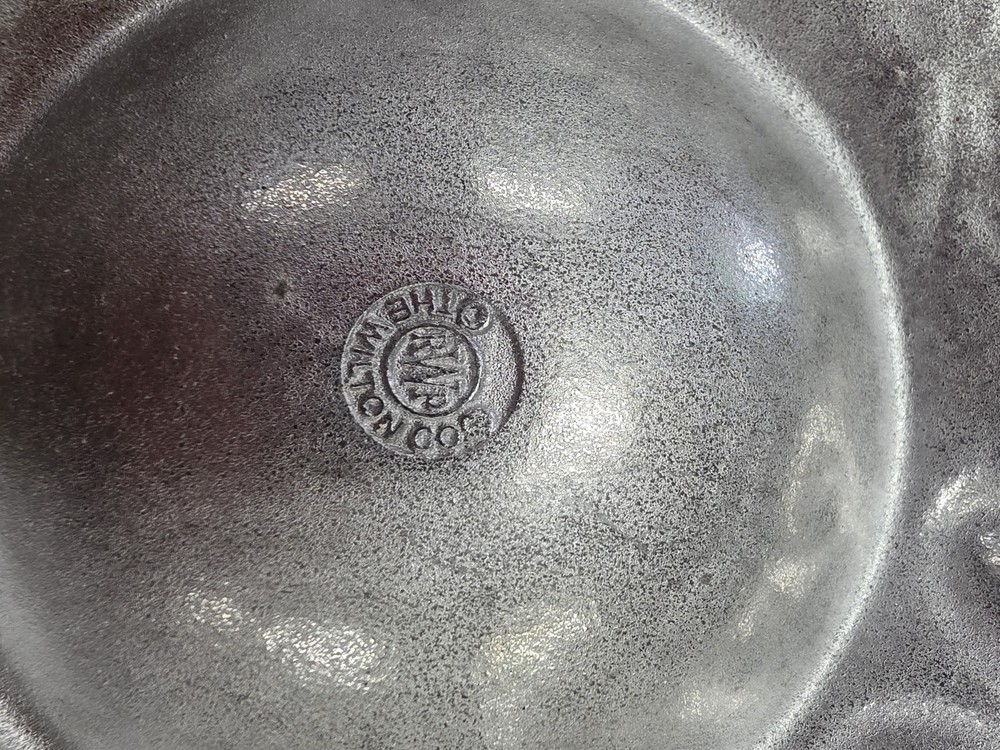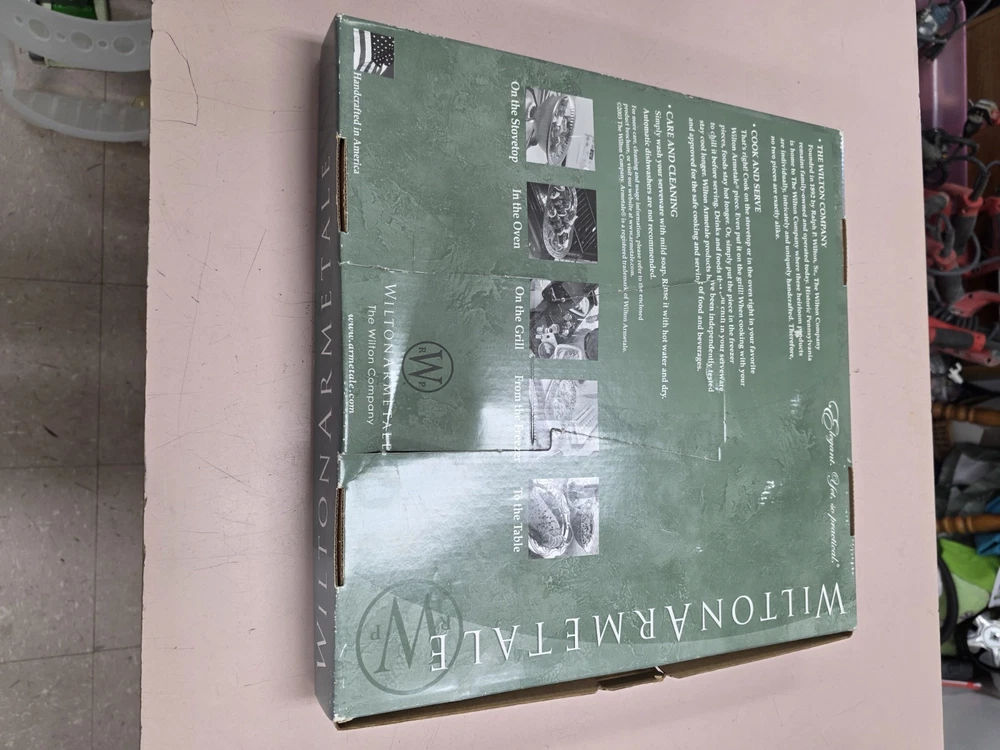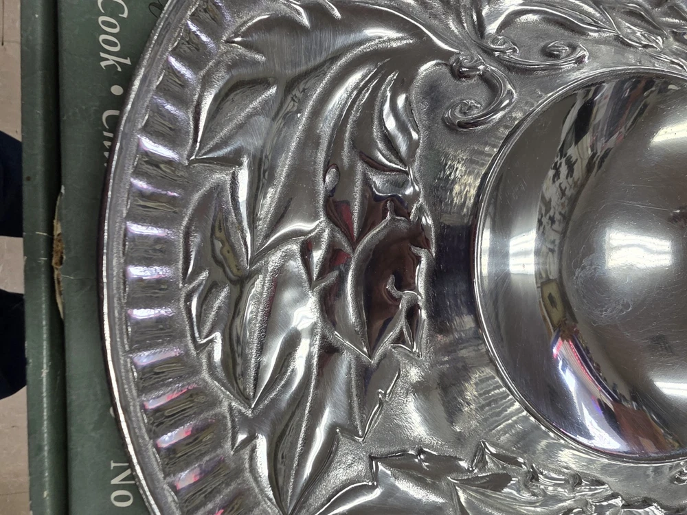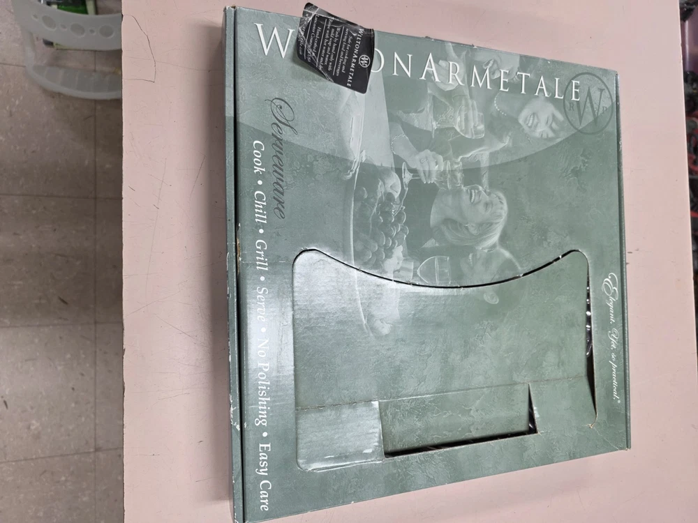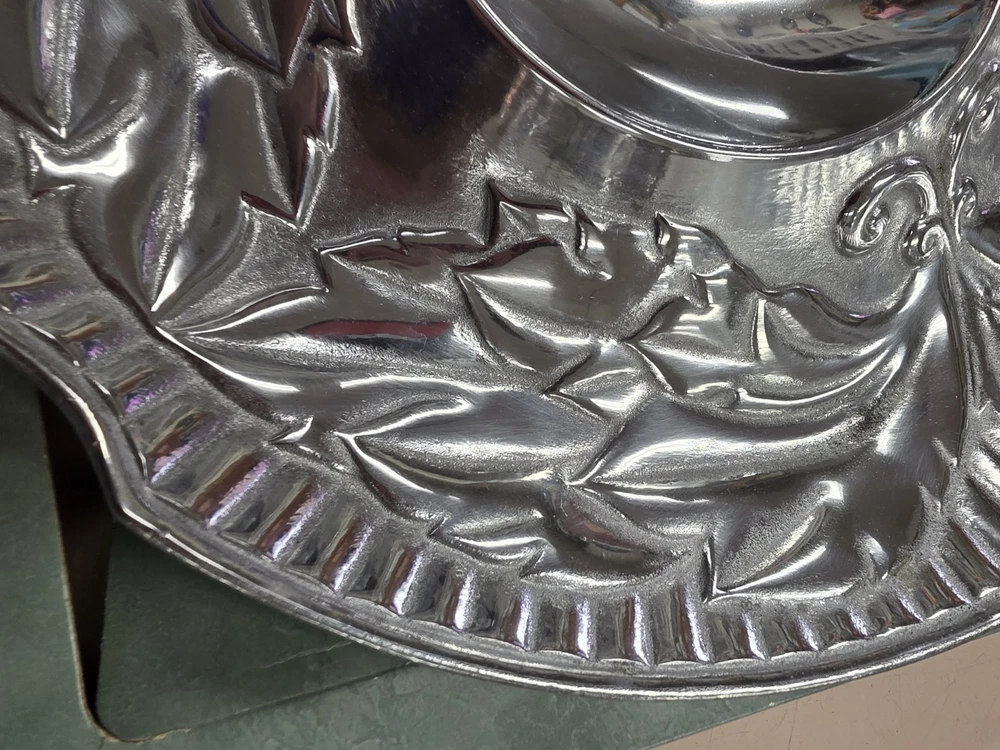 Elevate your hosting elegance with the Wilton Armetale ACANTHUS ACCENT Large Serving Platter, accompanied by a matching Round Dip Tray. Crafted from high-quality pewter, this serving ensemble exudes a timeless charm that complements any table setting. Its intricate metal fabrication showcases the renowned craftsmanship of the United States. The platter and tray duo is a testament to Wilton Armetale's dedication to durability and style, perfect for those who appreciate the finer details in servingware. For those with concerns about California Prop 65 warnings, please refer to the manufacturer's website for further information. Add a touch of sophistication to your dining experience with this exquisite metalware set. In good shape. Look at pictures.