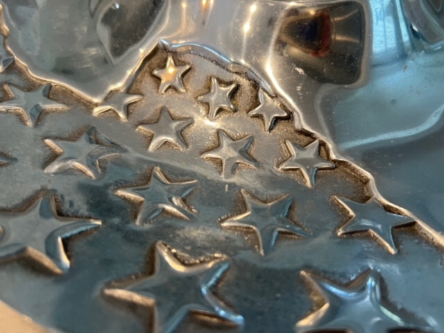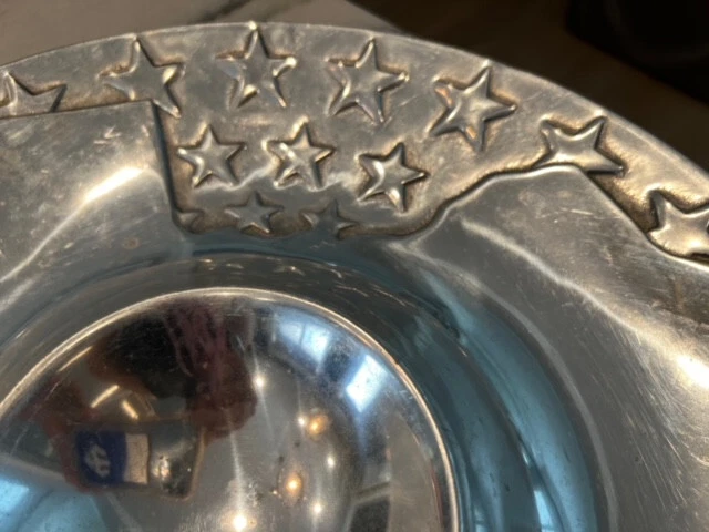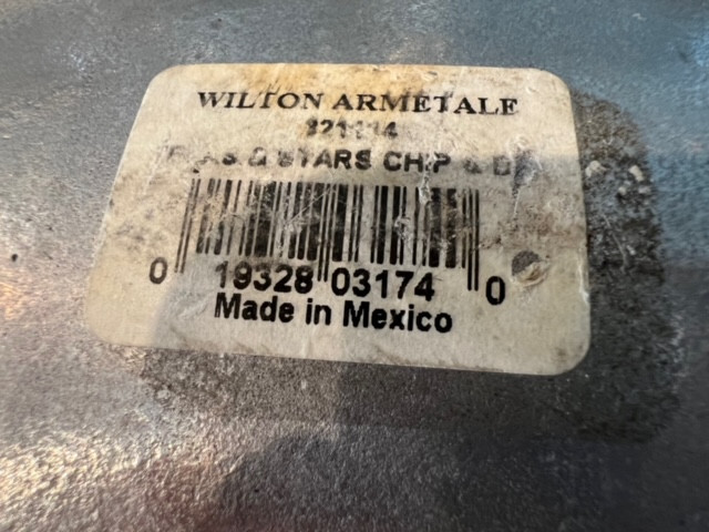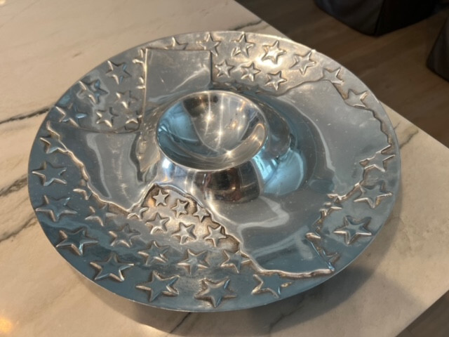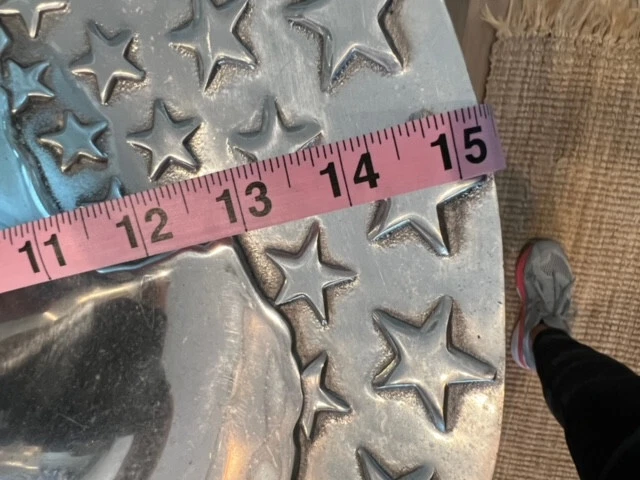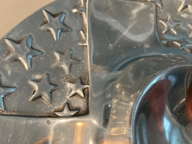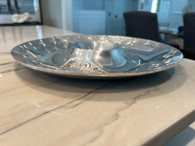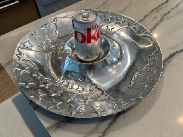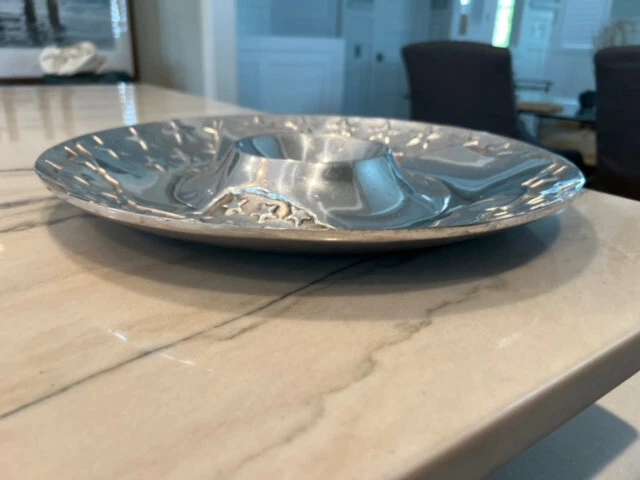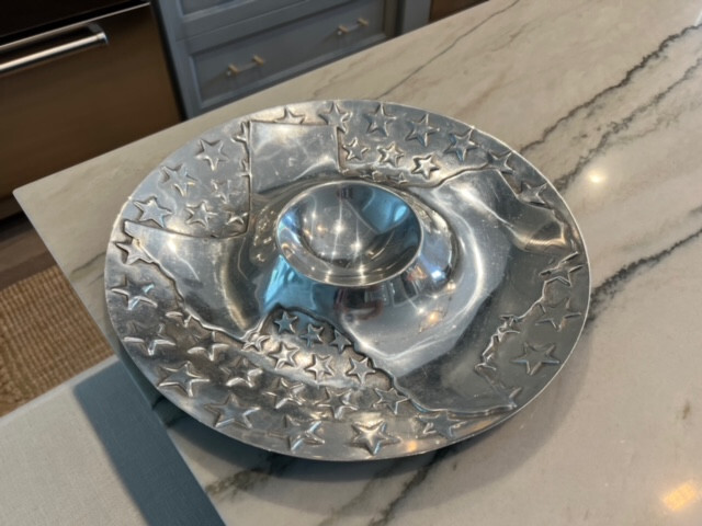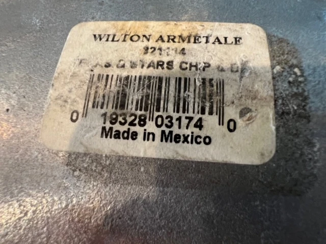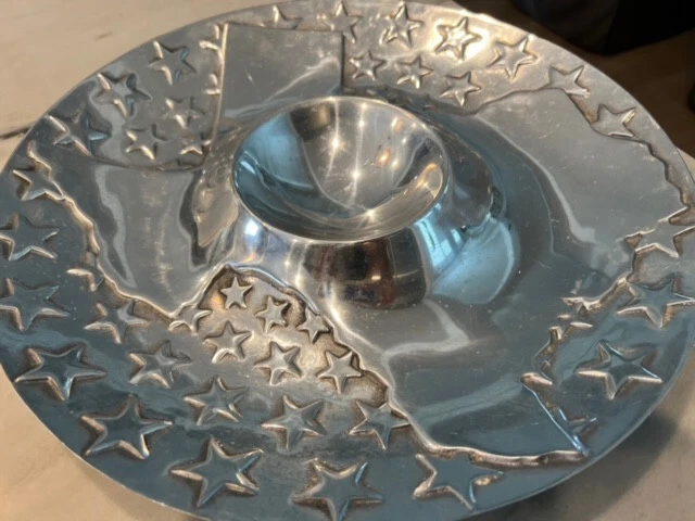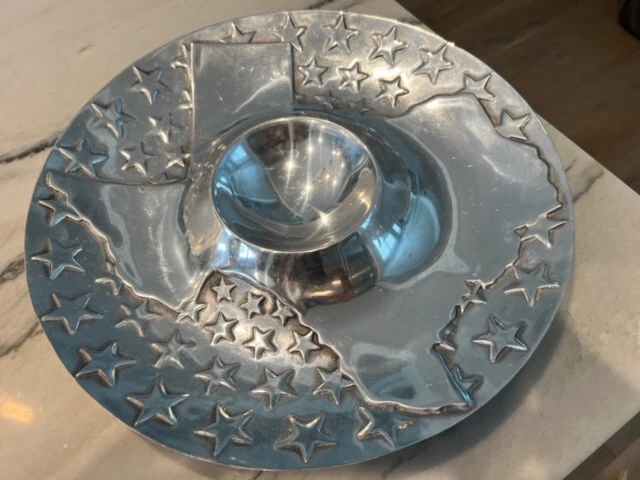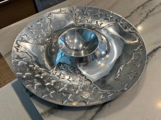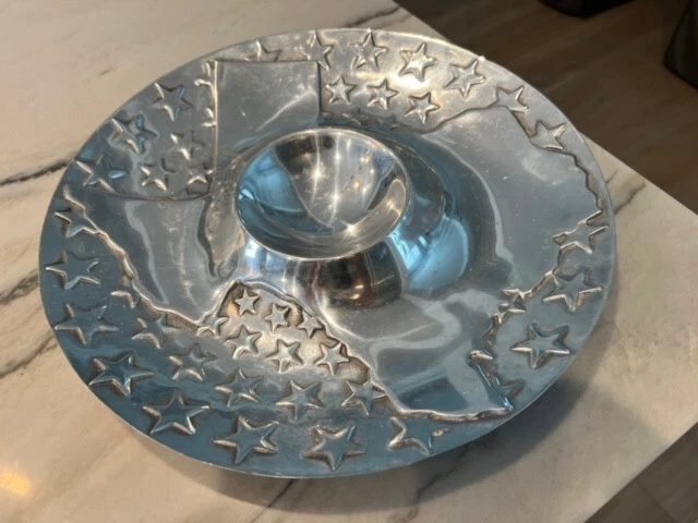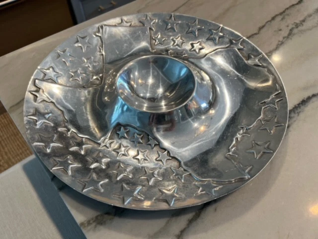 Wilton Armetale Texas Chip & Dip Server with Stars. Formal to casual, stylish to rustic, each piece we craft is designed to capture the spirit of your life. Able to withstand temperatures up to 1000 degrees F, Wilton Armetale Serveware is ideal for your cooking needs. Food stays hot longer and perfect for oven, stove or grill. Designed and crafted by hand, these beautiful products were made to last a lifetime. Made of aluminum. Hand wash. This is $199.99 at Neiman Marcus and still on their website. This is pre-loved and does show signs of wear. See all the pictures as they are part of the description. There are some scratches / marks on the tray that do not detract from the beauty and uniqueness of the tray. Wilton Armetale Texas Chip & Dip /Large Serving Tray/ Platter - Decorated with Stars- Pewter-15.5"