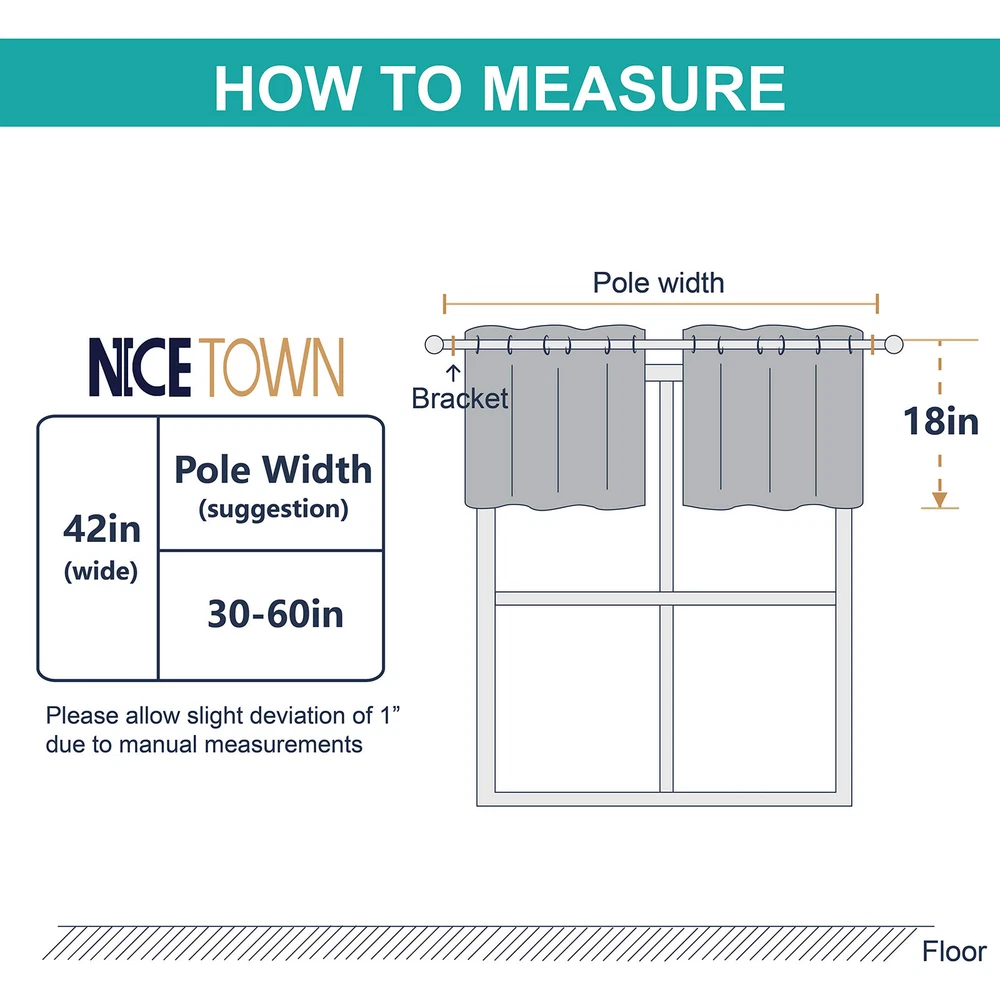 Blackout Curtains for Window - Drapery Thermal Insulated Ready Made: The Blackout Short Curtains come in 2 panels. 8 silver rings with a diameter of 1.6 fit easily with standard curtain rods. Each panel is W42 x L18 + 1.2" header(The whole Length is 31.2" from the top to the bottom of the curtain). Innovative Fabric: Soft and heavy blackout drape panels adopt triple weave technology. No coating, no formaldehyde, fade-resistant, skin-friendly, privacy protection, creates a harmonious environment. The same materials are on both sides. Stylish Design: Neutral colors simple but elegant. Short valance curtain control and balance sunlight come into your room and silver rings at the top can be pulled freely on the pole, is a good choice for home curtains Smart Function: Triple weave blackout fabric block summer heat and strong sunlight out. These curtain drapes provide full privacy and are convenient for small windows of the kitchen, bathroom, bedroom, and basement. Easy Care: Good quality finishing will withstand years of use. Machine washable and Wash the water temperature below 86F. Mild detergent no bleaching. Low-temperature ironing. Don’t use sharp things scratching curtains