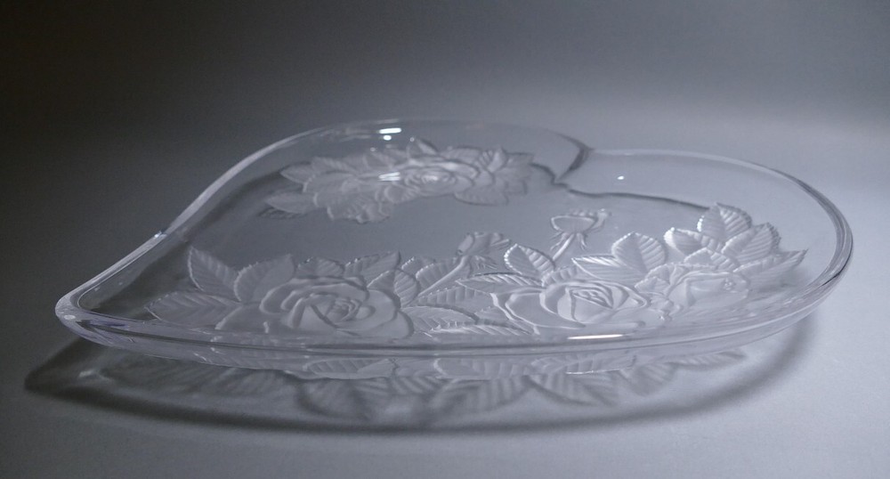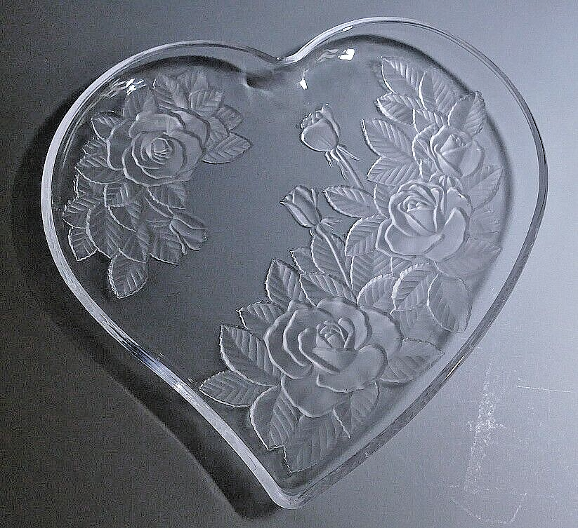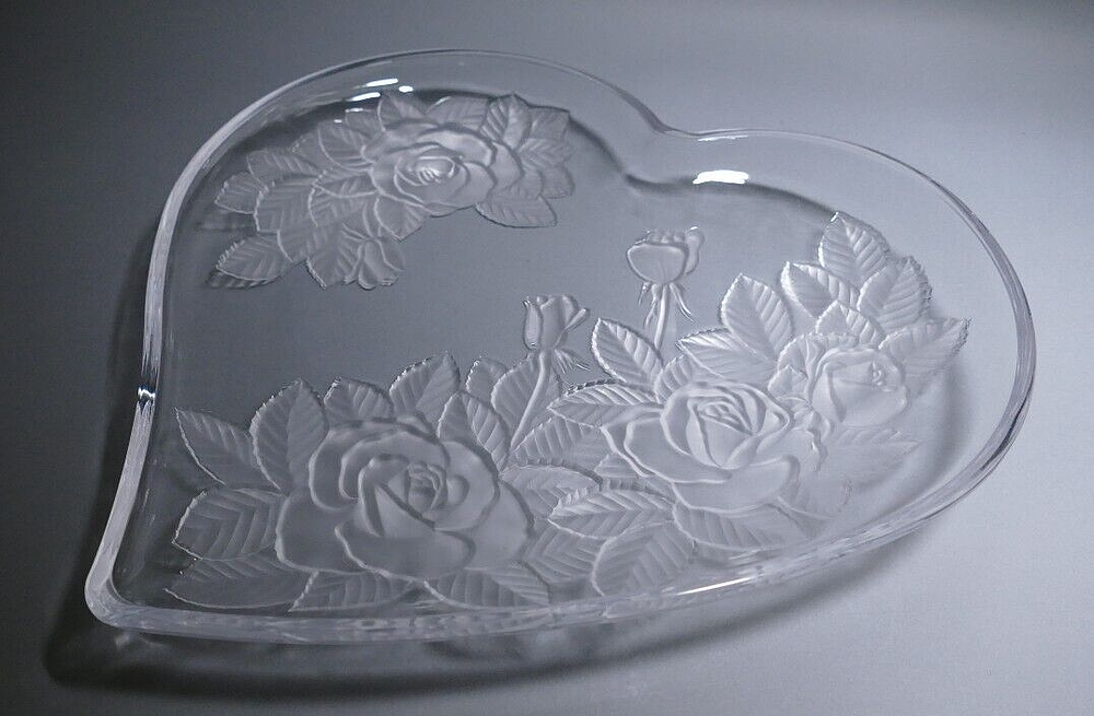 Beautiful large heart-shaped cheese or dessert tray platter etched with the "Winter Rose" pattern for Mikasa in the 1980s. This heavy high quality crystal dish would make a lovely anniversary gift, Valentine's Day present, or wedding gift or a wonderful party plate for an engagement party. Please see my other items for sale by clicking the "Seller's Other Items" link! I have many vintage pieces available -- from Depression Glass and Mid Century Pottery to Vintage Beer Steins and Rare Books! Keep in mind that items listed for sale here are vintage, that means they are used, and have been used for decades. There may be scratches or flea bites, scuffs or other imperfections from years of use. Study the photos for details. I treat every item with special care and have years of experience in packing and shipping art and glass. Era/Production Dates/Time Period is approximate based on best information available.