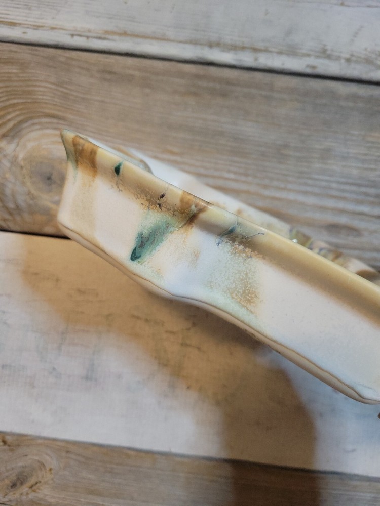 Texas TX Shaped Drip Glaze Stoneware Studio Pottery Serving Bowl Dish Signed on bottom by Wisnewski. Ivory with green/brown partial drip glaze. 7.5" top diameter at widest point, 1.5" deep....