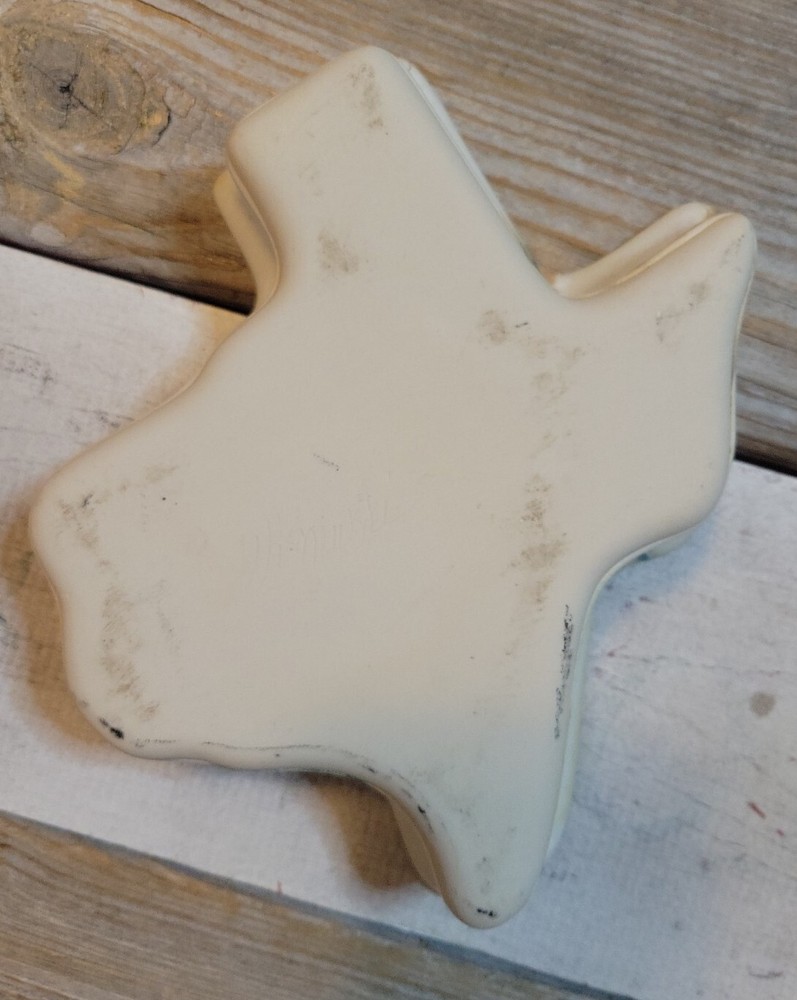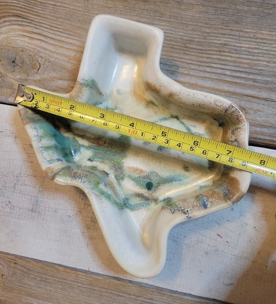 Texas TX Shaped Drip Glaze Stoneware Studio Pottery Serving Bowl Dish Signed on bottom by Wisnewski. Ivory with green/brown partial drip glaze. 7.5" top diameter at widest point, 1.5" deep.