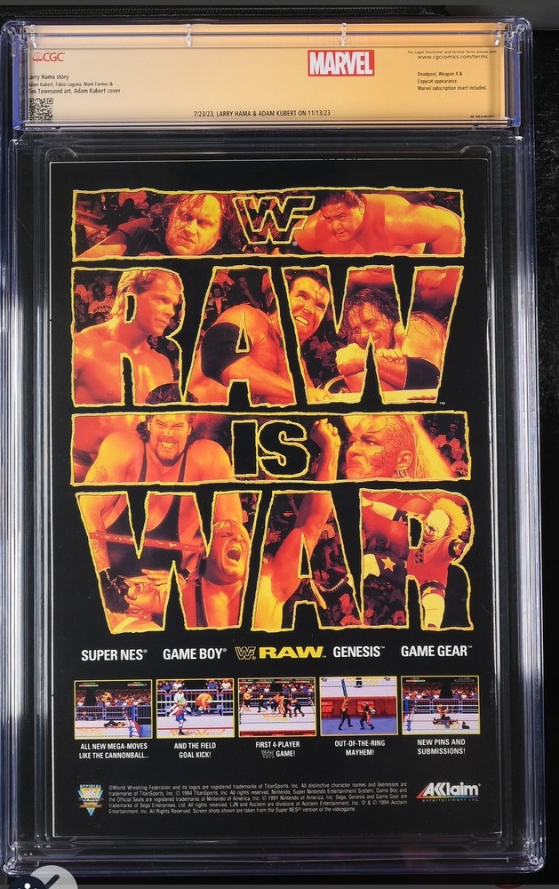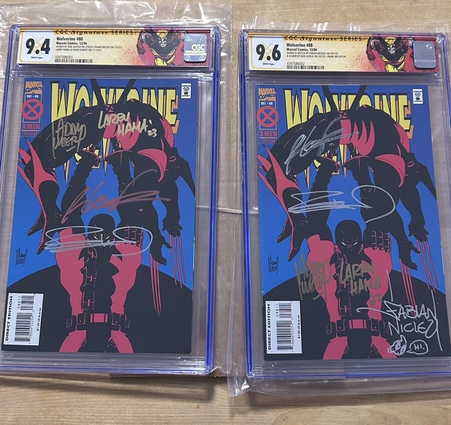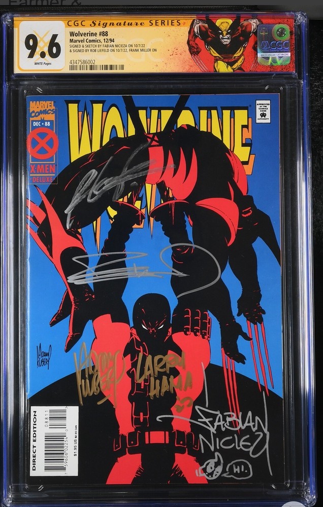 This is a rare and highly collectible edition of Wolverine #88, just in time for Deadpool 3 and is signed by five legendary artists and writers: Adam Kubert, Larry Hama, Rob Liefeld, Fabian Nicieza, and Frank Miller. The comic comes with a grade of 9.6 Near Mint+ from Certified Guaranty Company (CGC), making it a must-have addition to any serious collector's portfolio. The comic is a direct edition-deluxe variant type with a tradition of US comics and published by Marvel Comics in December 1994. The issue number is #88 and the era is Modern Age (1992-Now). The cover artist is Adam Kubert, and the characters featured include Garrison Kane, Deadpool, Logan, Yolanda, Vanessa Carlysle, Wolverine (Logan), Wade Wilson, and Copycat. This comic is an excellent choice for fans of superheroes and comics and a must-have item for any collector. **Items will be shipped with signature verification required upon delivery.** Check out our other items available, as we have even more legendary and rare books ahead of the Deadpool 3 movie release.