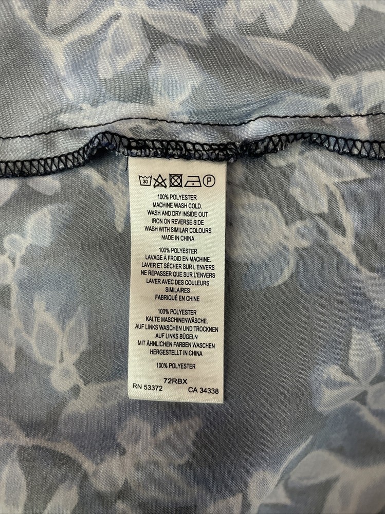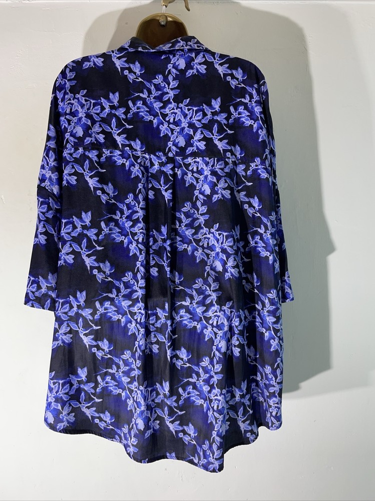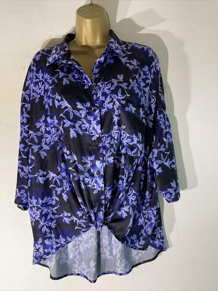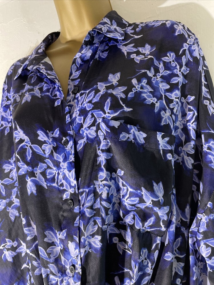 Womens French Connection Large Blue Satin Floral Dip Hem Casual Shirt Blouse Measures 27” armpit to armpit and 26/30” long Good used condition
