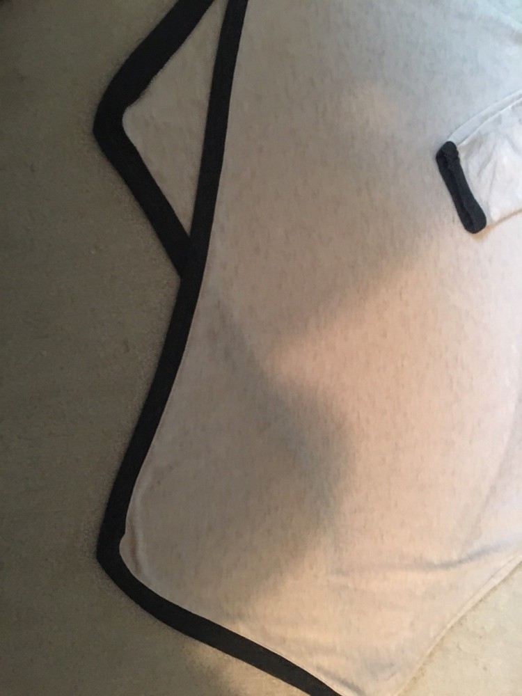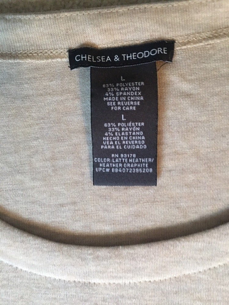 Women’s large Chelsea & Theodore tan lightweight sweater dipped hens trimmed in charcoal gray 3/4 sleeve excellent condition 36 at longest point 24 armpit to armpit