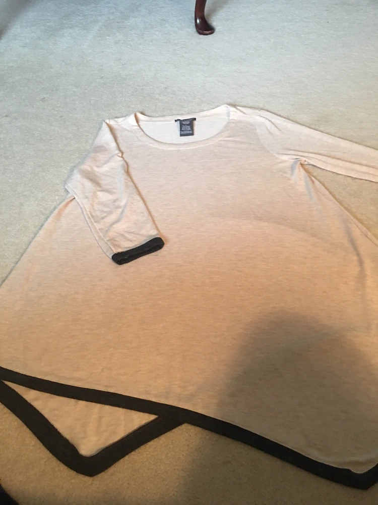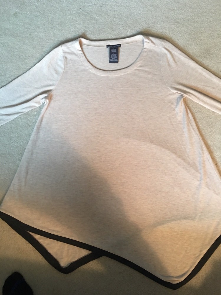 Women’s large Chelsea & Theodore tan lightweight sweater dipped hens trimmed in charcoal gray 3/4 sleeve excellent condition 36 at longest point 24 armpit to armpit...