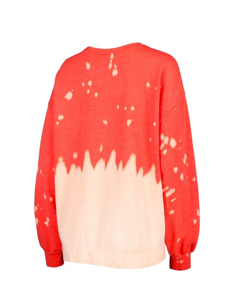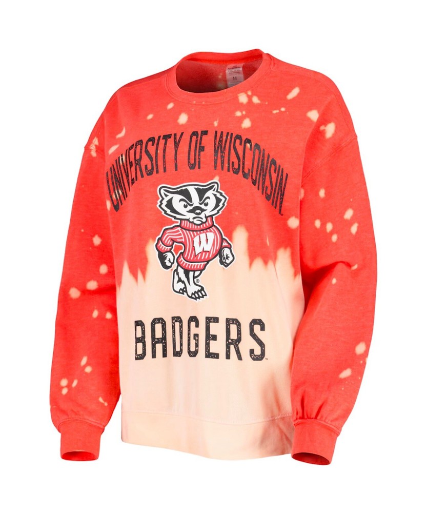 This is a women's red crewneck sweatshirt in size Large featuring a faded dip-dye design by Gameday Couture. The sweatshirt is officially licensed for the NCAA team, the Wisconsin Badgers. It is a stylish piece with the team logo prominently displayed, making it a fashionable choice for female fans to show their support while staying cozy and comfortable.