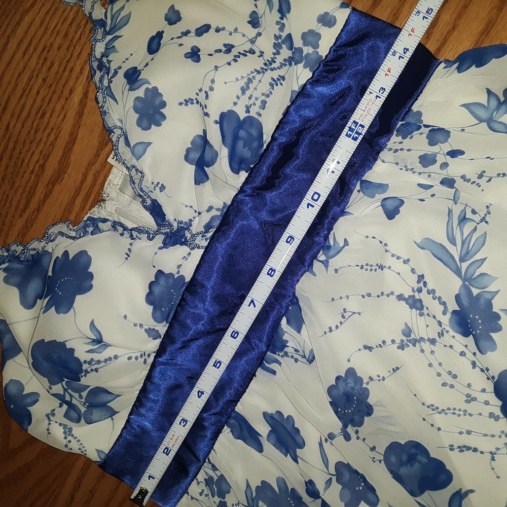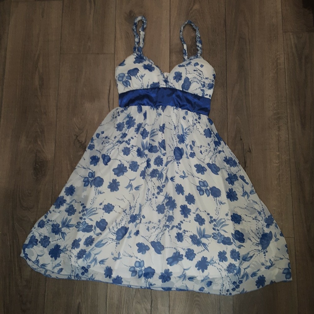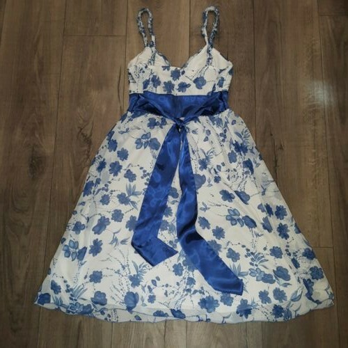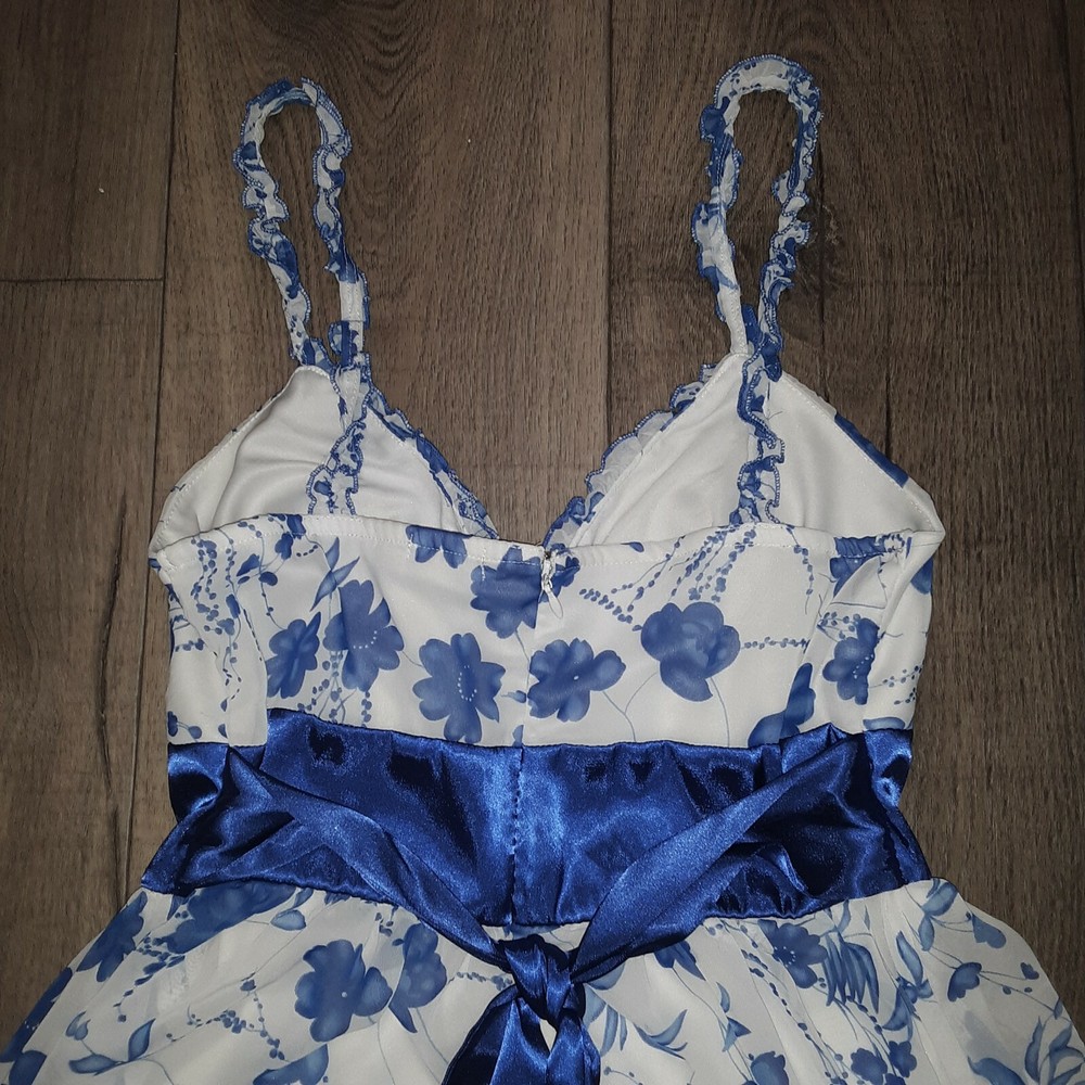 Women's Studio Y Sleeveless A Line Dress 7/8 White Blue Floral Print Sweetheart. In very good, gently used condition. Beautiful dress. Very sheer top layer (Picture 3) No rips, tear or holes. Has small stain on inside of top, (Picture 10) & small spot on ribbon (Picture 11) ****FROM A SMOKE FREE HOME**** Ships via USPS First Class Mail Packaged up and ready to go.
