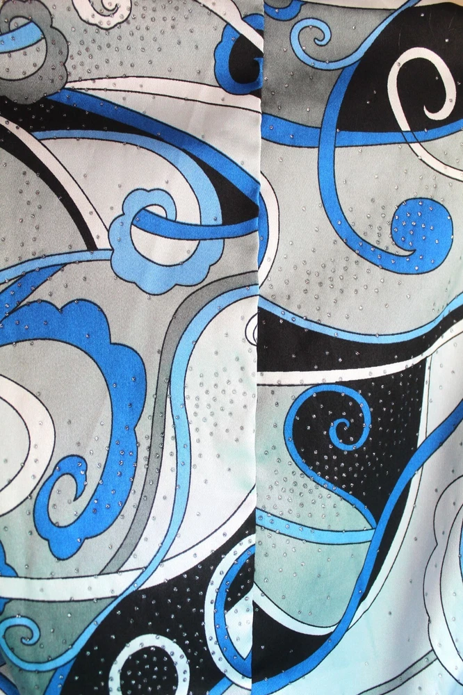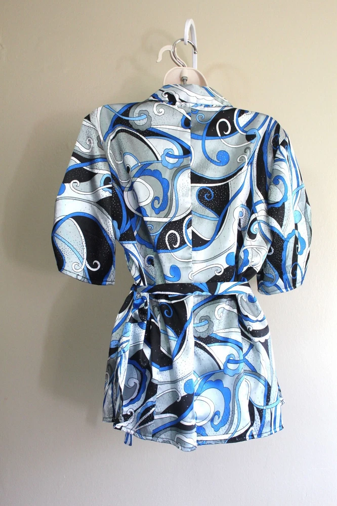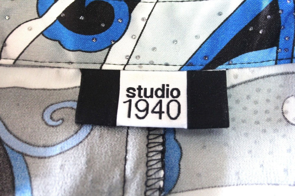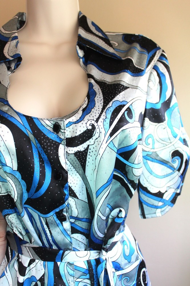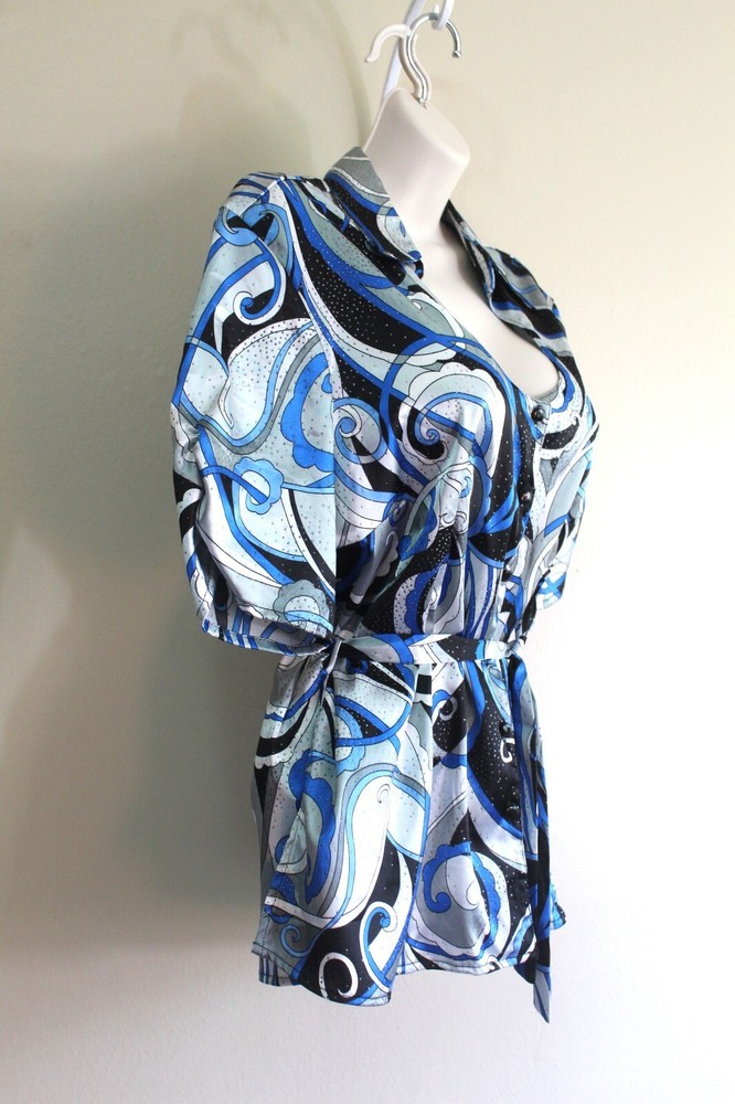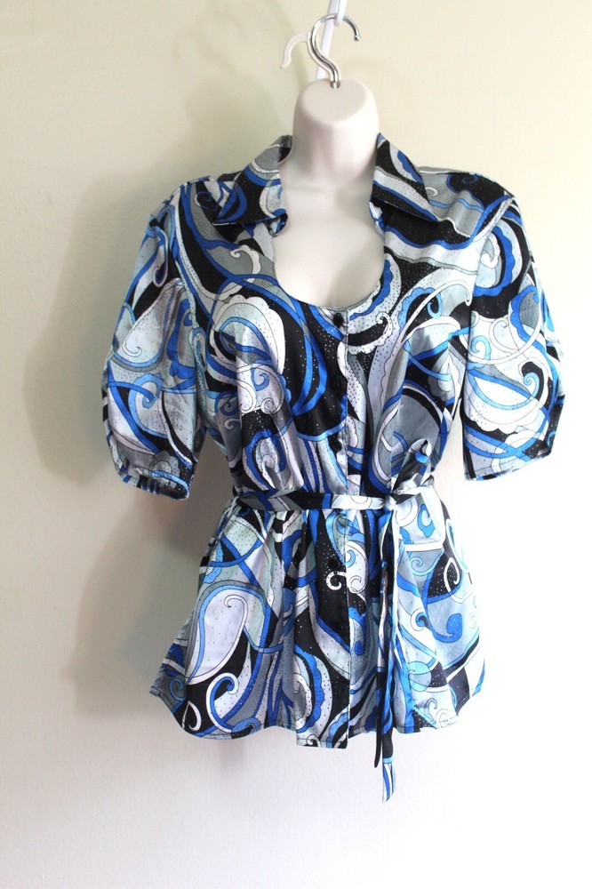 This awesome vintage Y2K shirt looks like one from the 1930s. Very Art Deco revival, BIBA-esque. By Studio 1940. Women's size XL. 43" chest, 40" waist, 47" hip. Shiny polyester satin creates a glassy, shiny, glamorous vibe in blues and grays. Fabric has tiny silver metallic dots also. Gorgeous abstract, oversized psychedelia print that recalls Pucci. Buttons up. Puff short sleeve. Separate sash for waist. Shaped neckline with collar. Never worn or washed. Measured flat across: width, across chest, under arm to under arm: 21.5" width, across waist: 20" width, across bottom: 23.5" length, top of shoulder to bottom hem: 27" *********************************************************** Combined shipping is available. Put items in your shopping cart, and request a combined invoice before paying. Or message me with what you want, and I’ll create a custom bundle for you. Shipping costs are determined by the weight of the item and the distance to move it from where I am, to where you are. I use the best (cheapest X quickest) service available to me, based on current United States Postal Service rates, as calculated by eBay. Promotions: As with all retail businesses, only one type of deal at a time (discount / coupon / lower price offer) applies to a sale. Returns: For full purchase price back, request a return from eBay, then send the item back within a week of getting it, in exact same condition as you received it. I appreciate you buying from me! I pack up your purchases with full attention to arriving safely using recycled materials, and send out the same day or next day. Antique = Circa 100+ years old Vintage = Between 20 - 100 years old Retro or Revival = References design characteristics popular in the past Reproduction = Facsimile/copy of an antique or ancient object Sizing: Since S-M-L and plus sizes aren’t consistent through the fashion industry, I include flat lay measurements in all clothes listings. Double that number to get the approximate circumference around, and compare to clothes you already own that fit well. Mannikin's measurements are 36" bust, 29.5" under bust, 26" waist, 38.5" hip.